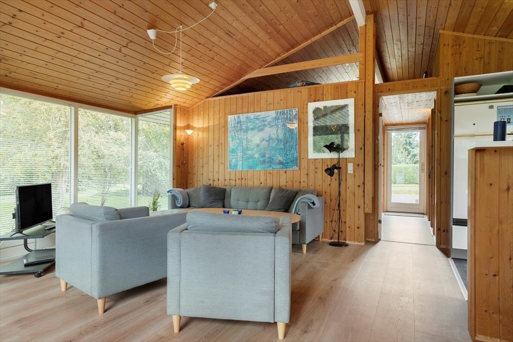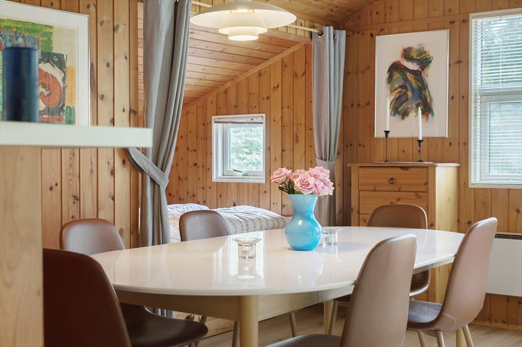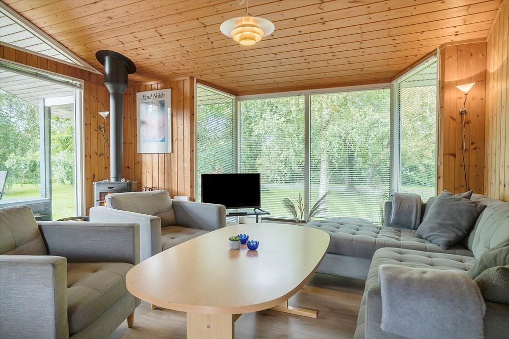 Dieses gemütliche Ferienhaus bietet ein schönes Wohnzimmer mit einem Kamin, Wärmepumpe und einem guten Essbereich. Die Möbel sind komfortable und der Lichteinfall durch die großen Fenster ist gut.
