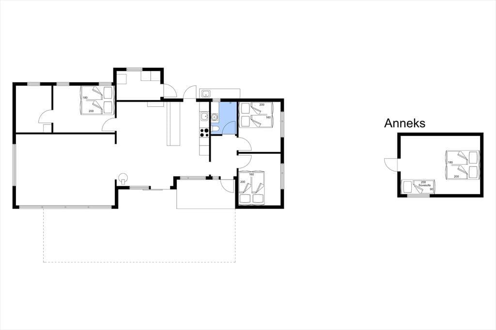 Das Haus ist mit einem Wohnraum und dazu hörender offenen Küche mit Decke zu kippen eingerichtet. In der Küche haben Sie Geschirrspüler und Mikroherd, und im Wohnraum finden Sie Fernseher, Holzofen und Wärmepumpe, was das Haus zu Ferien durch das ganze Jahr geeignet macht. Von den fantastischen Panoramafenstern haben Sie einen Blick zu dem gemütlichen und ungestörten Garten, wo die Rehe häufig kreuzen. Im Haus haben Sie auch 3 gute Schlafzimmer mit Doppelbetten, und ein Nebengebäude mit Doppelbett. Das Badezimmer ist mit Dusche. Auf der südlichen Fliesenterrasse haben Sie optimale Sonnenbedingungen. In der Einfahrt gibt es eine gute Außenküche, und ganz dicht am Haus finden Sie auch eine Schleppstelle für ein Boot.