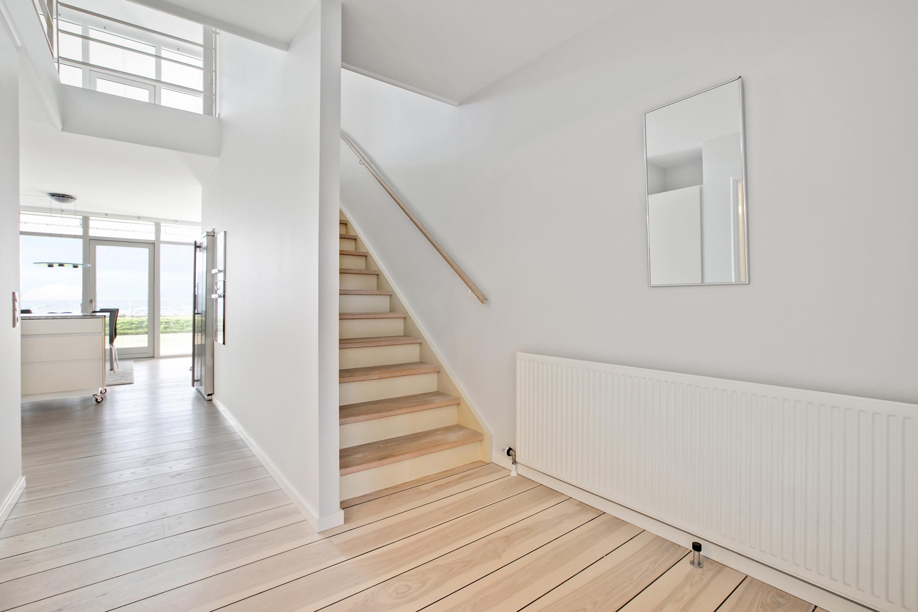 Vom Eingangsbereich aus kommt man in die gut ausgestattete, stilsichere Küche in offener Verbindung zum hellen und gut möblierten Esszimmer mit wandhängendem Kaminofen, Essplatz für vier Personen und Ausgang auf die Terrasse. Die Küche ist mit Glaskeramik-Kochfeld, Backofen, großer Kühl-/Gefrierkombination, Geschirrspüler und Mikrowelle ausgestattet. Im 1. Stock befindet sich ein Wohnzimmer mit Sitzecke, TV mit dänischen (inkl. TV2) und deutschen Programmen sowie Ausgang auf den schönen, überdachten Balkon. Die vier Schlafplätze verteilen sich auf ein Zimmer im Erdgeschoss mit zwei breiten Einzelbetten und ein Schlafzimmer im 1. Stock mit Doppelbett. Schickes Badezimmer mit Dusche, 1-Pers.-Whirlwanne und Sauna sowie Gäste-WC mit Dusche, Waschmaschine und Trockner. Beide Sind mit Fußbodenheizung ausgestattet. Internetzugang.