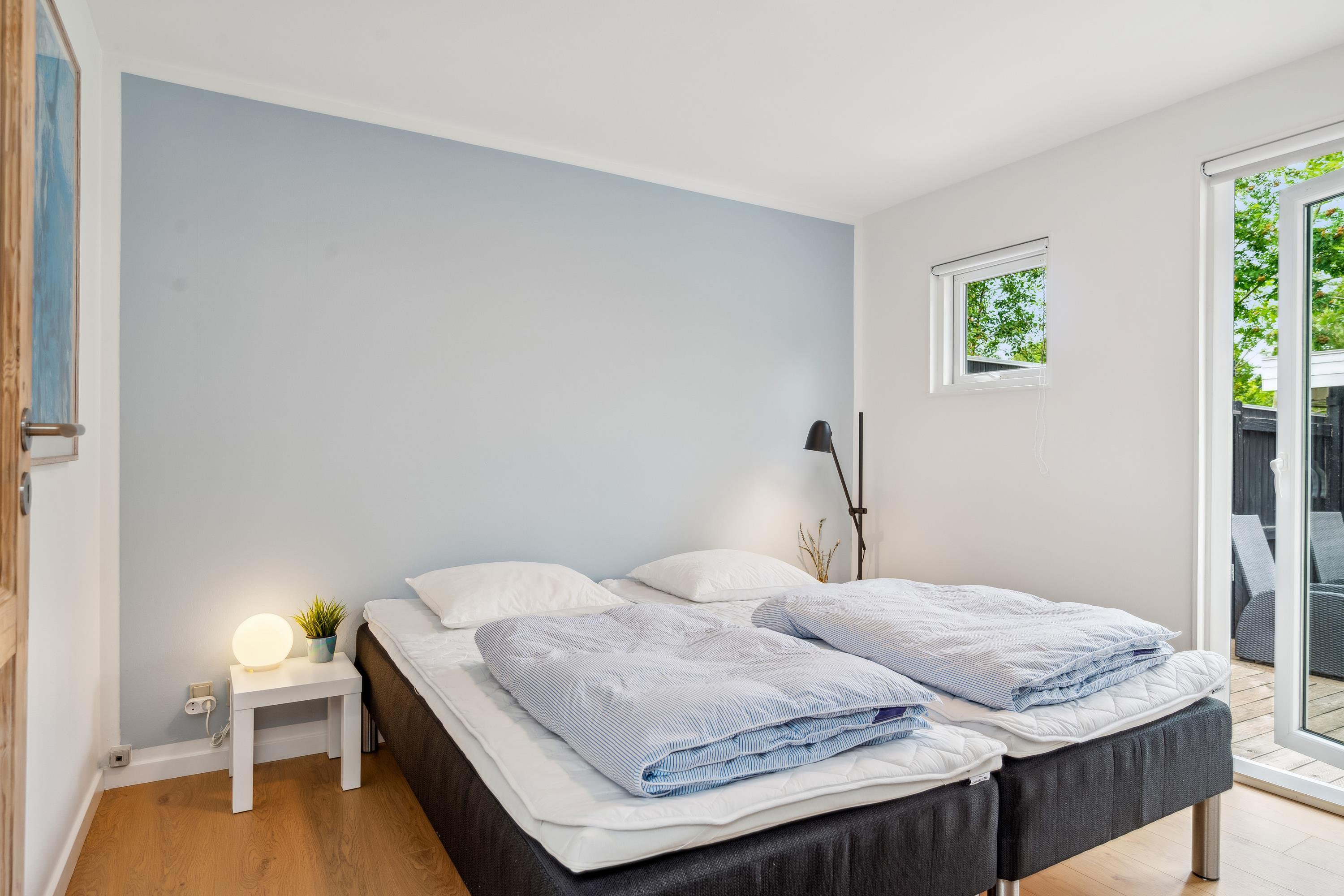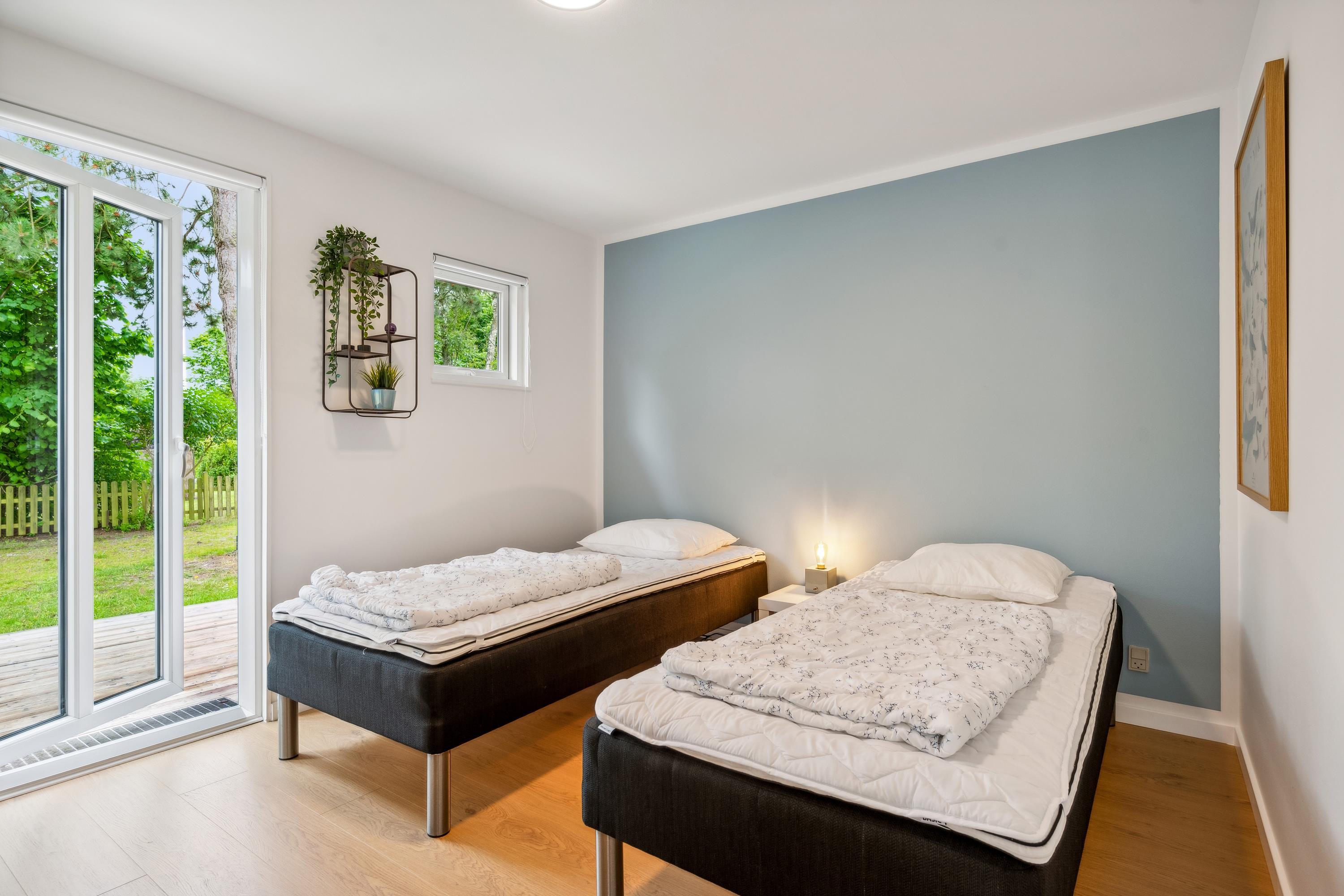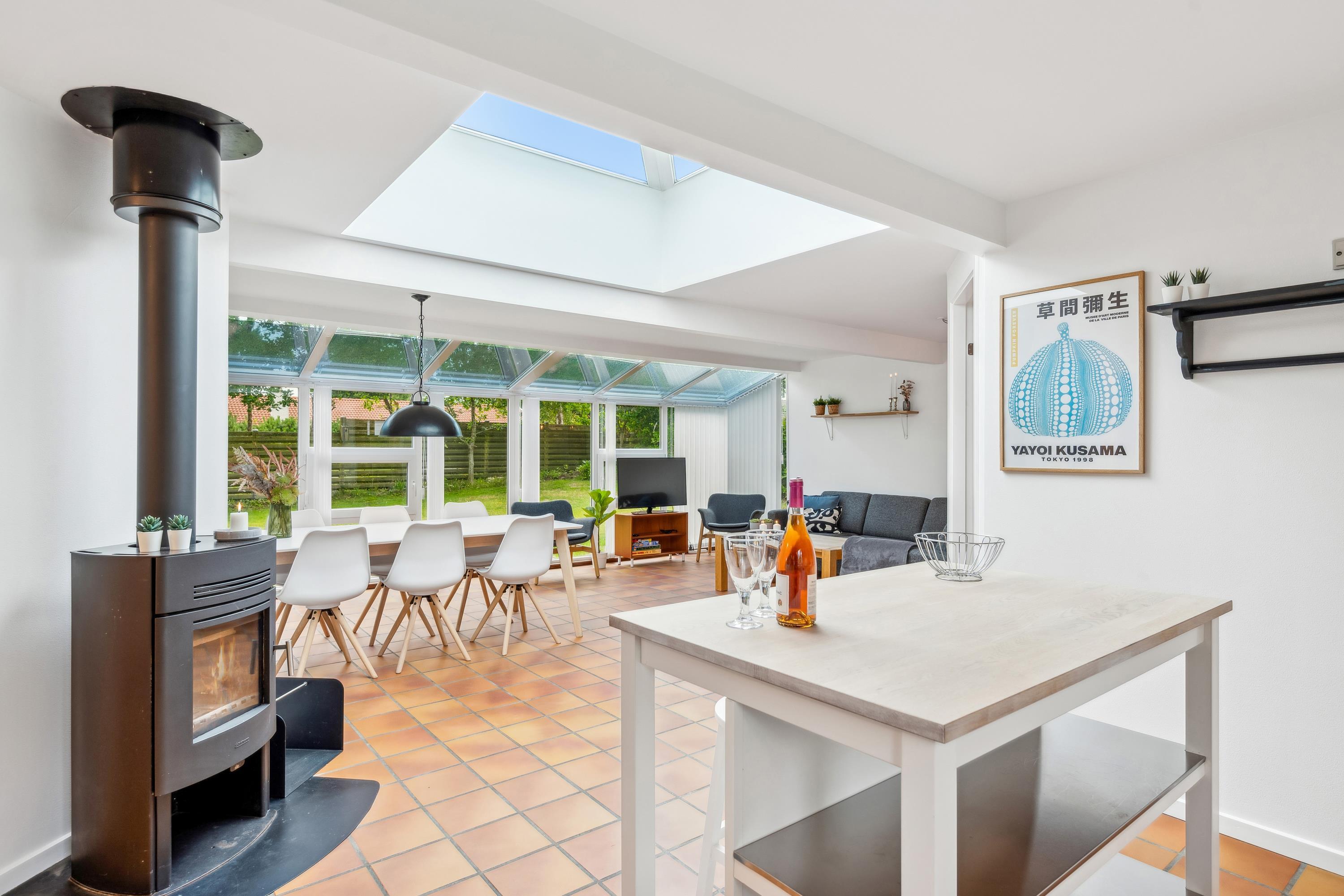 Der große Glaserker mit Ausgang zur Terrasse schafft zusätzlichen Raum und viel Licht im einladenden Wohnzimmer, das über einen Essbereich für 6 Personen, ein schönes Ecksofa sowie Sessel, Kaminofen und Fernseher mit dänischen Sendern verfügt. Die große, gut ausgestattete Küche ist offen zum Wohnzimmer hin gestaltet und bietet Cerankochfelder, Einbaubackofen, Kühl-/Gefrierschrank, Mikrowelle und Geschirrspüler. Die drei hellen und geräumigen Schlafzimmer des Ferienhauses sind alle mit Doppelbetten (insgesamt 6 Schlafplätze) ausgestattet, und von zwei Schlafzimmern aus gelangen Sie direkt auf die Terrasse. Wildnisbad, beheizt mit Holzöfen und Außendusche mit Kalt- und Warmwasser