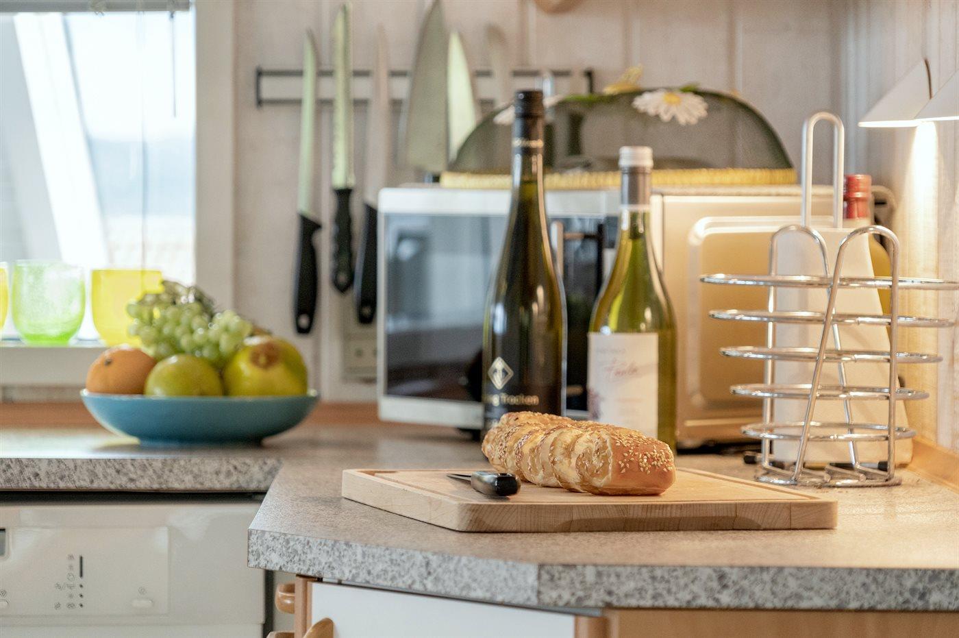 Die Küche ist mit Kühlschrank ausgestattet. Außerdem gibt es 4 Keramik-Kochfelder, Umluftofen, Mikrowelle sowie Geschirrspüler. Im Schlafzimmer mit Etagenbett steht ein zusätzlicher Kühlschrank.