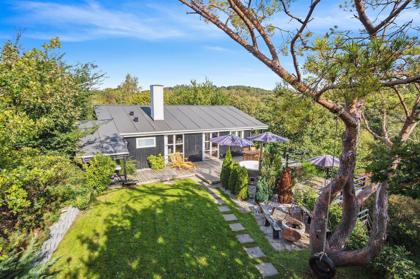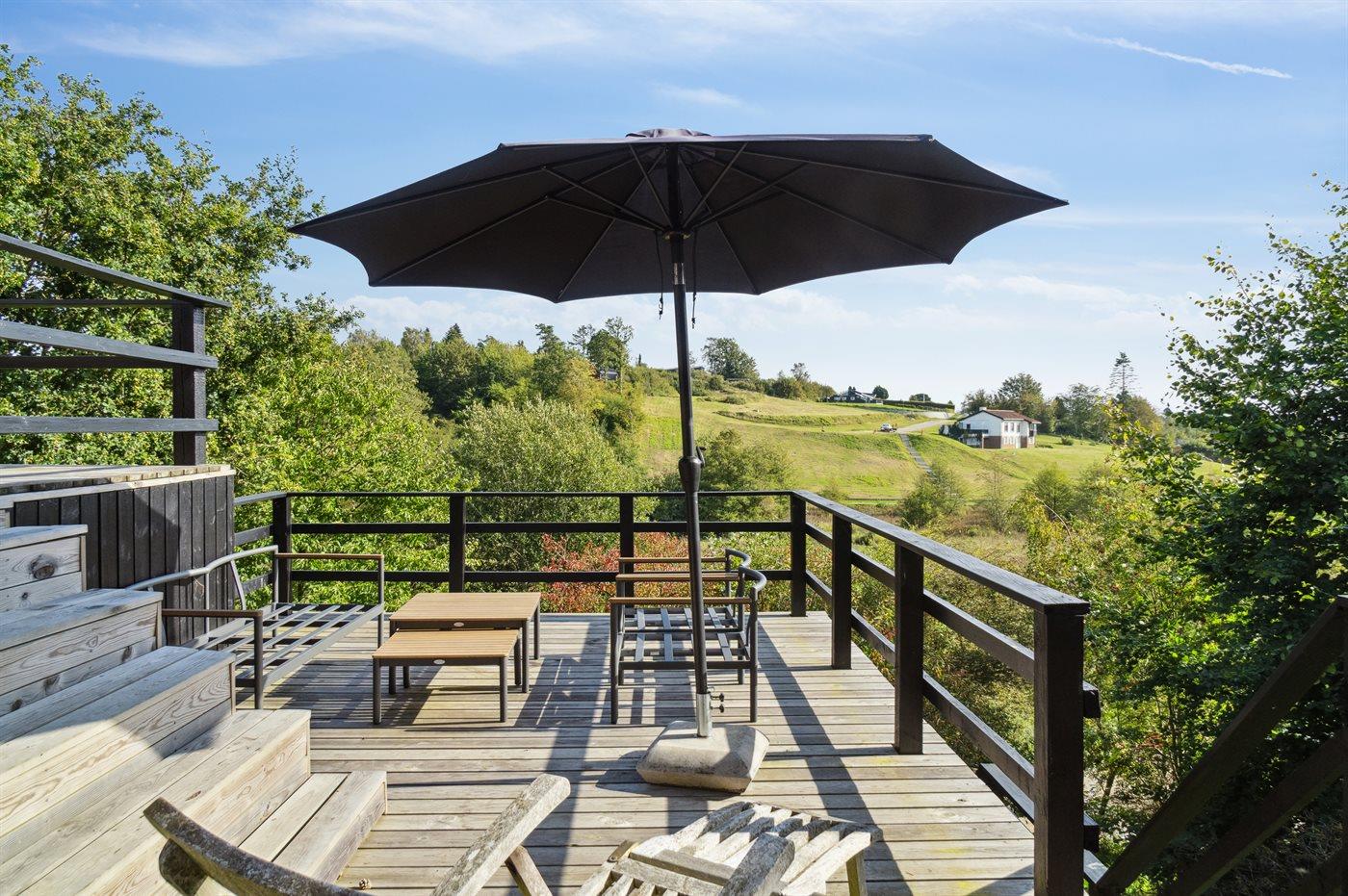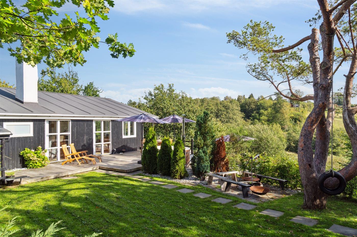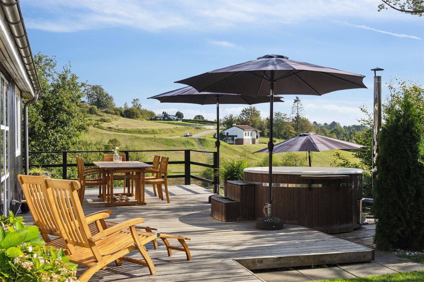 Herzlich willkommen in diesem schönen Ferienhaus für 6 Personen mit 3 Schlafzimmern und einem Gästehaus. Das Haus liegt mitten im Nationalpark Mols Bjerge mit einer atemberaubenden Aussicht auf die Umgebung. Die große Terrasse des Hauses erstreckt sich rund um das gesamte Haus und ermöglicht es, immer eine vor dem Wind geschützte Ecke zu finden. Sollte es für einen Aufenthalt auf der Terrasse zu kalt sein besteht die Möglichkeit den Hot-Tub zu nutzen – von hier aus kann man die schöne Aussicht genießen, während man im warmen Wasser entspannt.