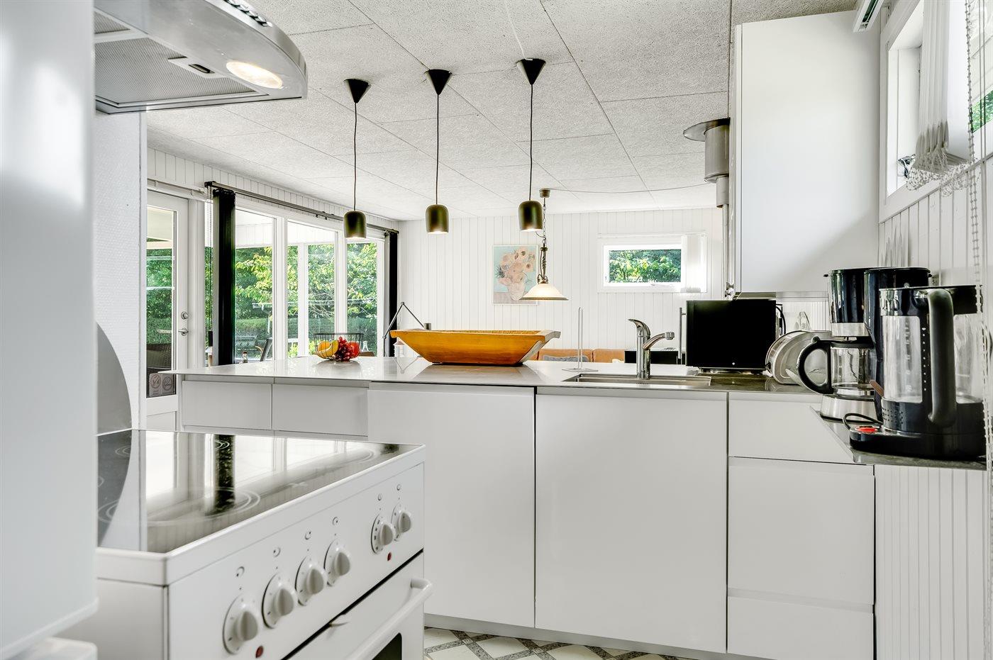 Die Küche ist mit Kühlschrank ausgestattet. Außerdem gibt es 4 Keramik-Kochfelder, Umluftofen, Mikrowelle sowie Geschirrspüler.