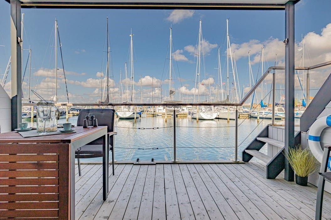 Maritimes Hausboot mit Ostseeblick an der Förde
