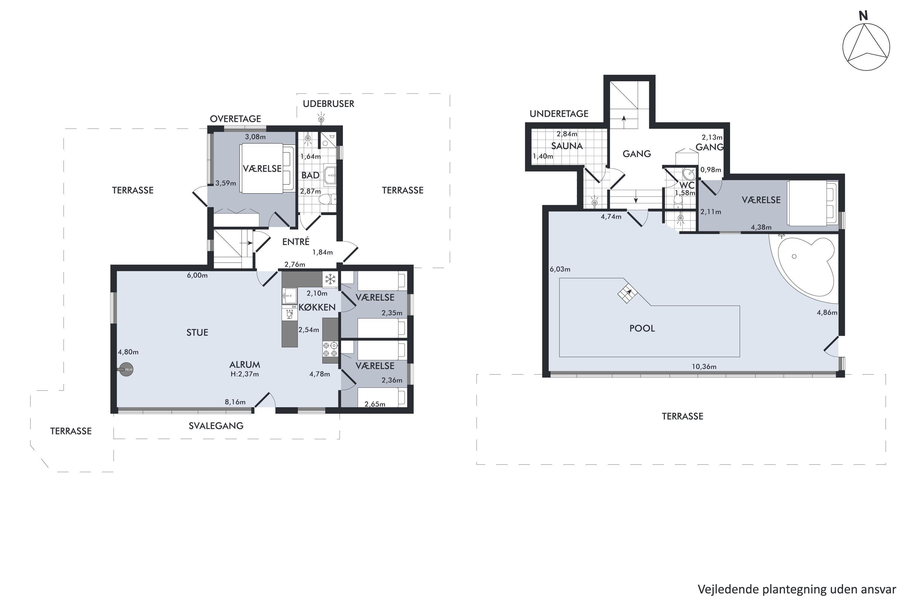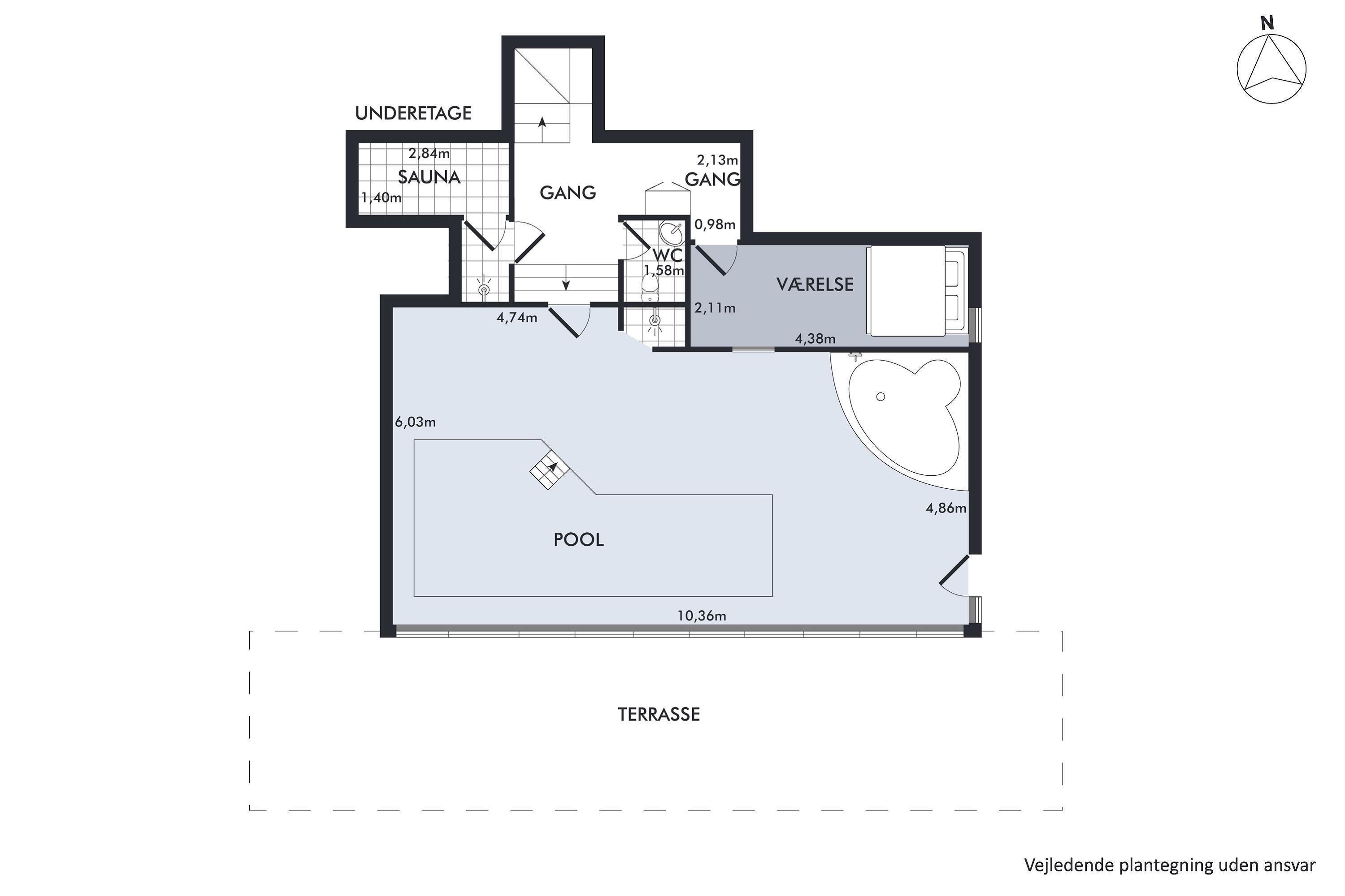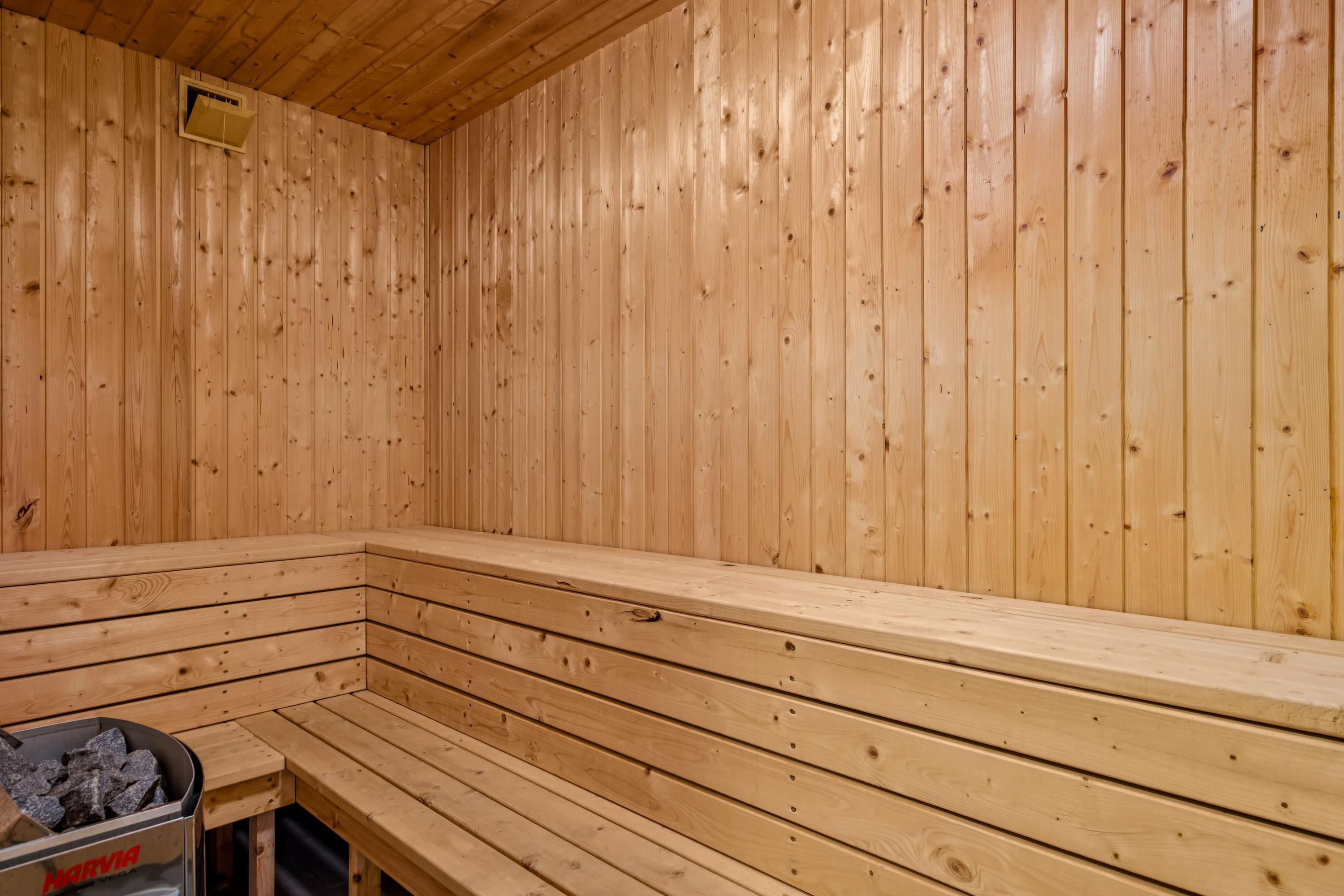 Eine gute Treppe führt hinunter in das Untergeschoss, wo sich das letzte Schlafzimmer mit Doppelbett befindet sowie ein weiteres Badezimmer, eine Sauna und nicht zuletzt der Poolbereich mit Whirlpool. Vom Poolbereich aus gibt es Zugang zu einer Terrasse mit Sonnenliegen. Das Ferienhaus ist aufgrund der Treppen nicht für Gehbehinderte geeignet, da der Zugang ausschließlich über Treppen erfolgt.