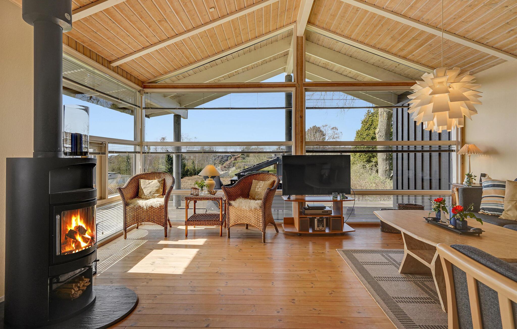 Dieses einladende Ferienhaus ist wie geschaffen für eine ruhige Auszeit vom Alltag. Durch große Fensterfronten gelangt viel Tageslicht ins Innere, während Sie aus den hellen Wohnräumen eine wunderschöne Panoramasicht auf das Wasser genießen. Entspannen Sie sich auf dem gemütlichen Sofa mit einem Glas Wein, entzünden Sie an kühleren Tagen den Kaminofen oder erholen Sie sich bei wohliger Wärme in der Sauna.