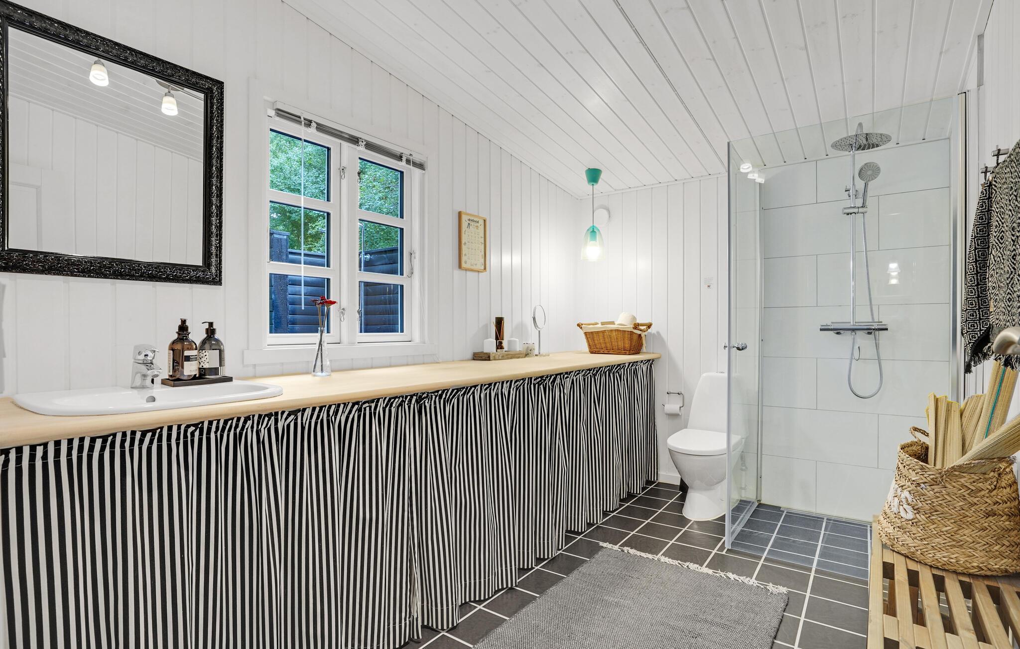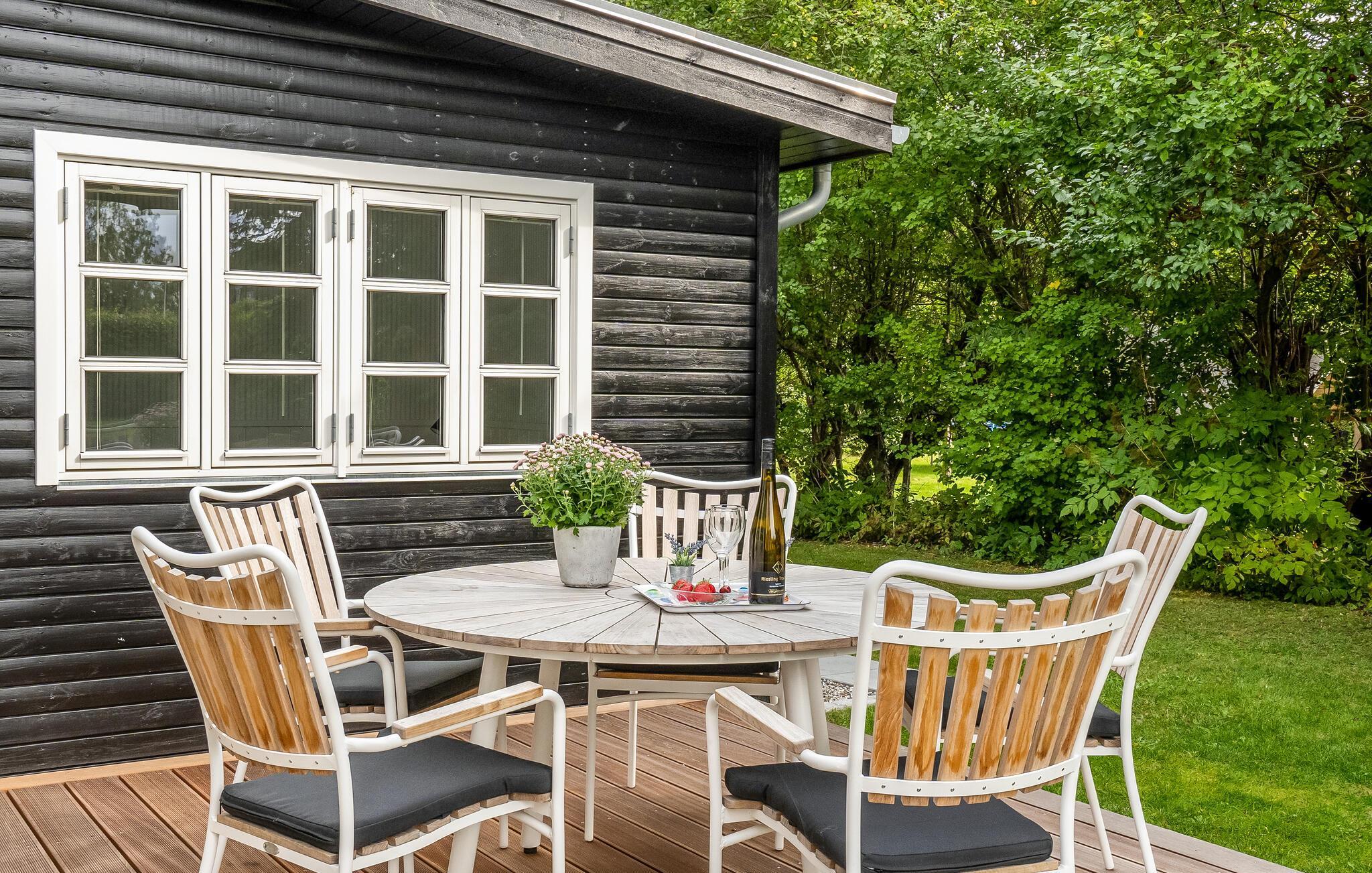 Gemütliches Holzhaus nahe Femmøller Strand mit Terrasse, Außendusche und familienfreundlicher Atmosphäre in Dänemark.