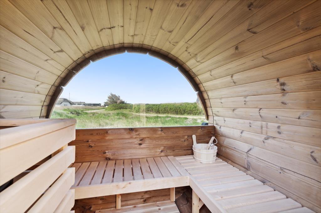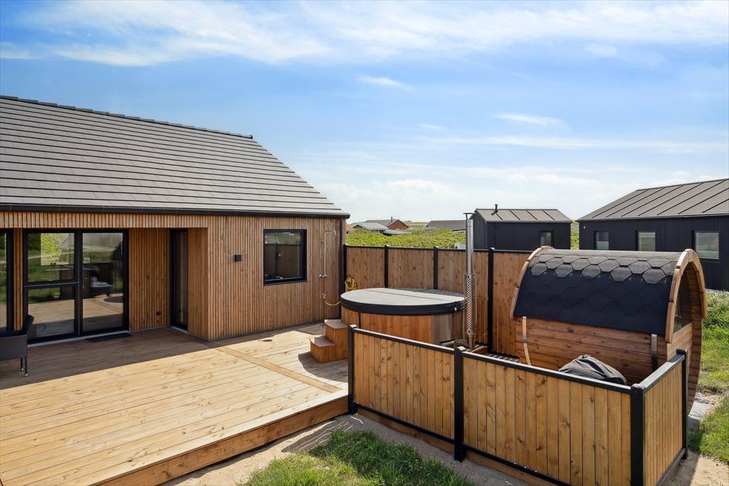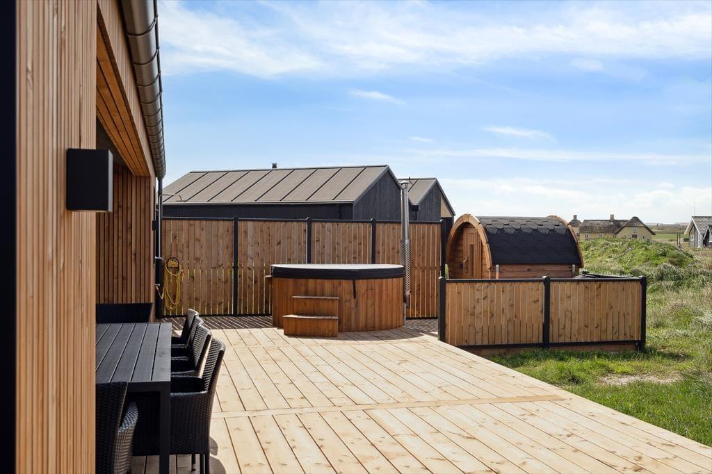 Das Outdoor-Erlebnis auf Stranden 10 ist etwas ganz Besonderes. Die großzügige Holzterrasse erstreckt sich entlang des Hauses und bietet mit Hot Tub, Außendusche und der charakteristischen Fasssauna ein echtes Wellness-Erlebnis. Beginne den Tag mit einem warmen Bad unter freiem Himmel, wärme dich in der Sauna nach einem Spaziergang am Meer auf oder genieße den Sonnenuntergang im Hot Tub mit dem Farbenspiel des Himmels als Kulisse. Bei schönem Wetter kannst du auf der Terrasse zu Abend essen – vielleicht sogar grillen, während Möwenrufe und das entfernte Meeresrauschen die perfekte Urlaubsstimmung schaffen. Die friedliche Atmosphäre in der Umgebung lädt dazu ein, wirklich abzuschalten – während die Kinder im Garten spielen, kannst du dich entspannt in der Sonne zurücklehnen.