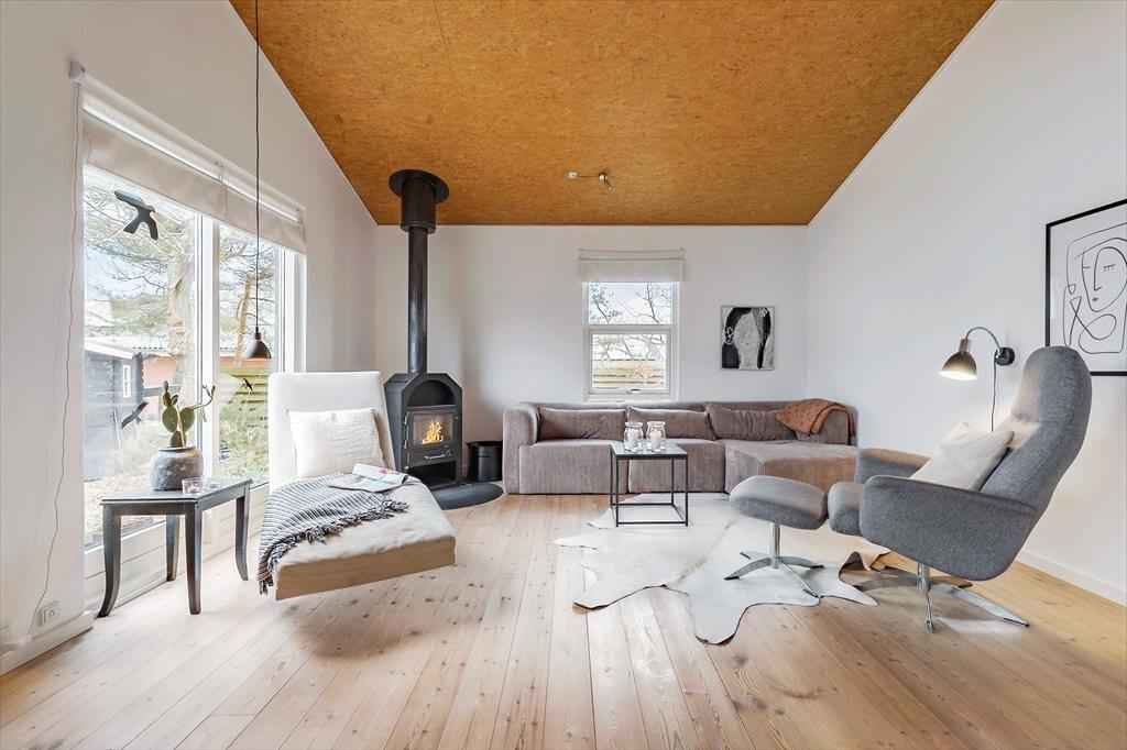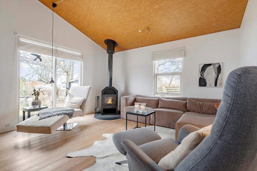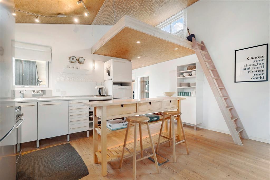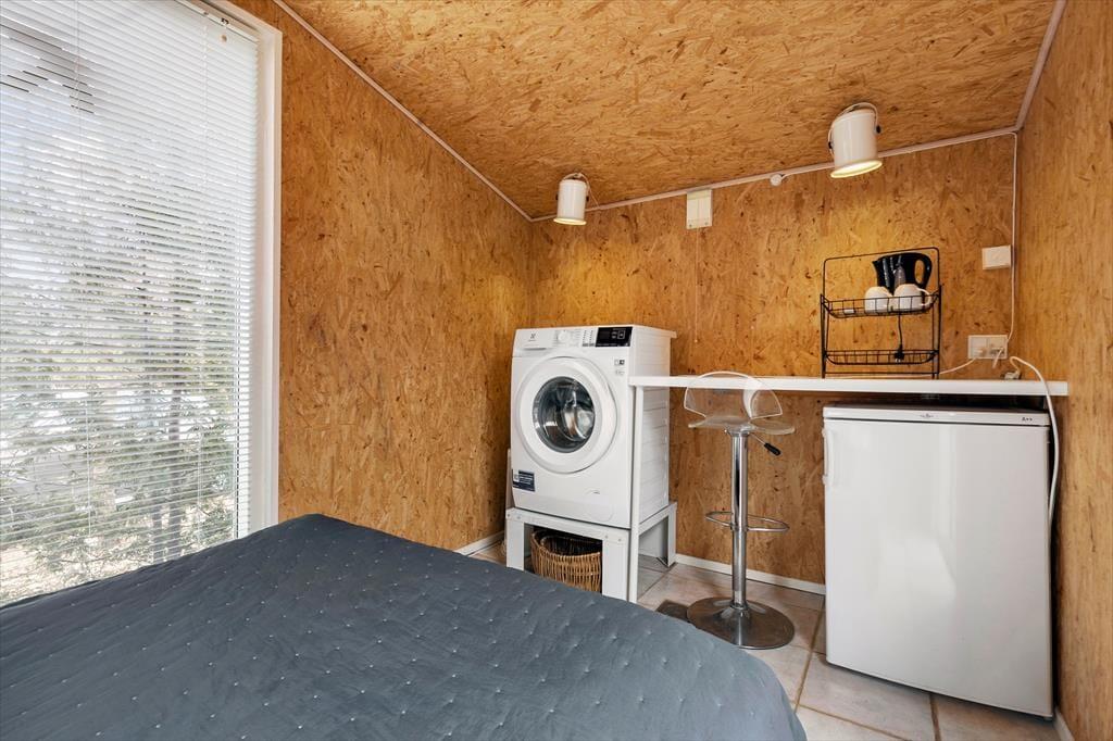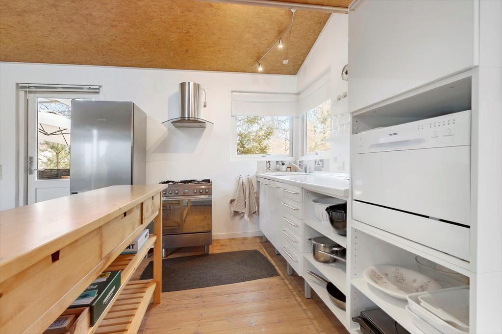 Dieses helle Ferienhaus überzeugt mit großen, hellen Räumen. Schnell wirst du feststellen, dass die Küche das Herzstück des Hauses ist. Sie ist offen mit dem Wohnraum verbunden und ermöglicht es dir, zusammen mit deinen Lieben die Mahlzeiten zuzubereiten. Falls du lieber alleine am Herd stehst, genießt du dennoch die Nähe deiner Familie, die sich beispielsweise in gemütlicher Runde mit einem Brettspiel am Esstisch vergnügt. Von beiden Seiten gelangt viel Tageslicht in die Küche. Dank der Fenster, durch die du auf die Terrasse und in die freie Natur blickst, wird es dir in der Küche nie langweilig. Der Gasherd lässt das Herz eines jeden Hobbykochs höher schlagen. Der Backofen ist allerdings elektrisch. Die beiden großen Schlafräume bieten viel Platz für deine Familie und euer Reisegepäck. Im Nebengebäude steht ein weiteres Doppelbett zur Verfügung. Das Nebengebäude verwöhnt mit einer Fußbodenheizung und beinhaltet darüber hinaus eine Waschmaschine und einen kleinen Gefrierschrank.