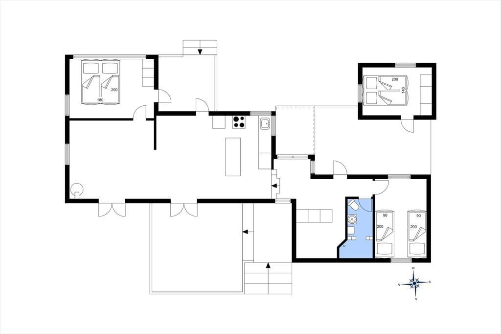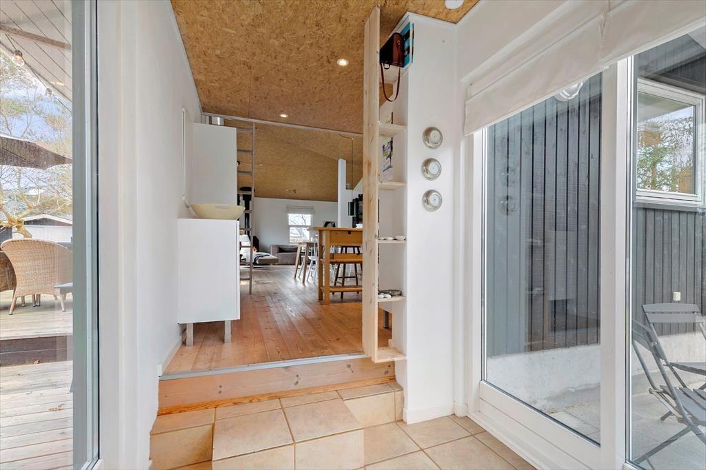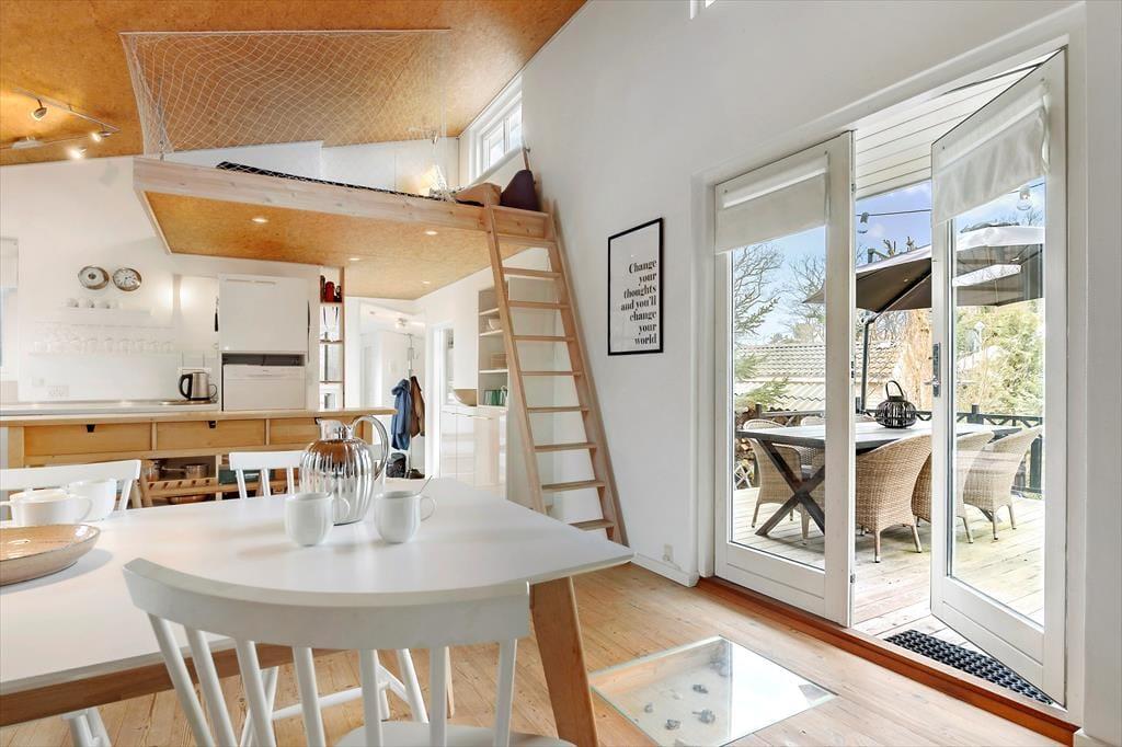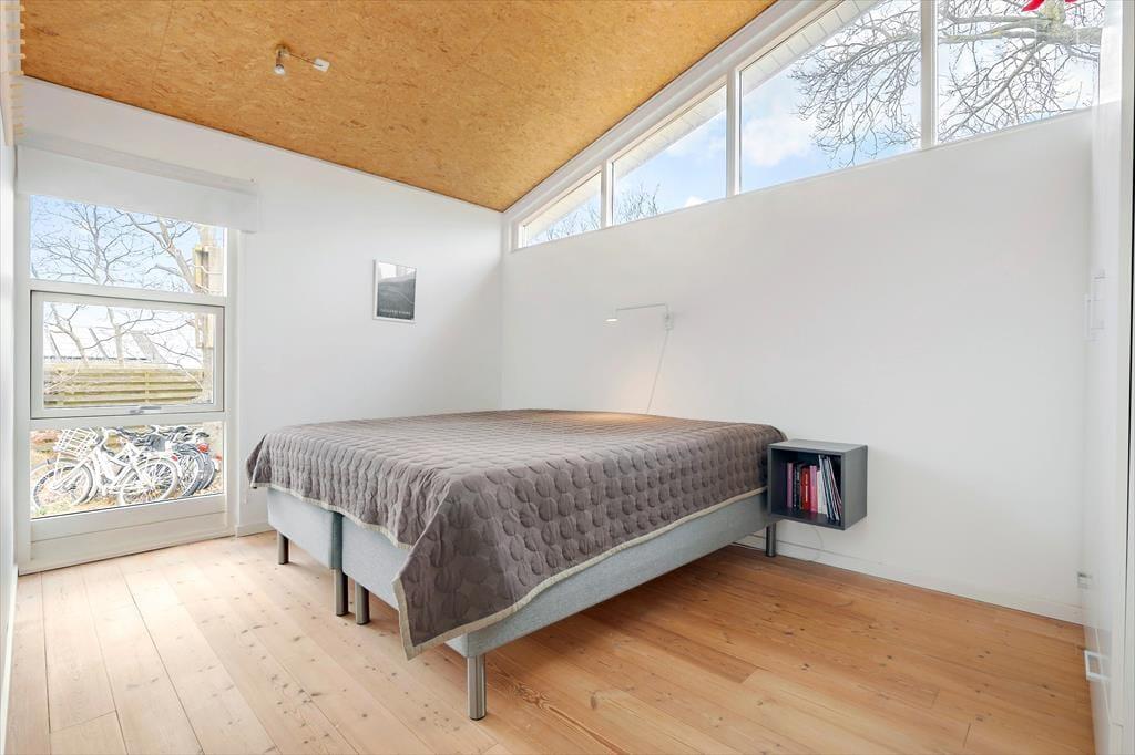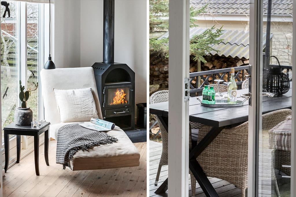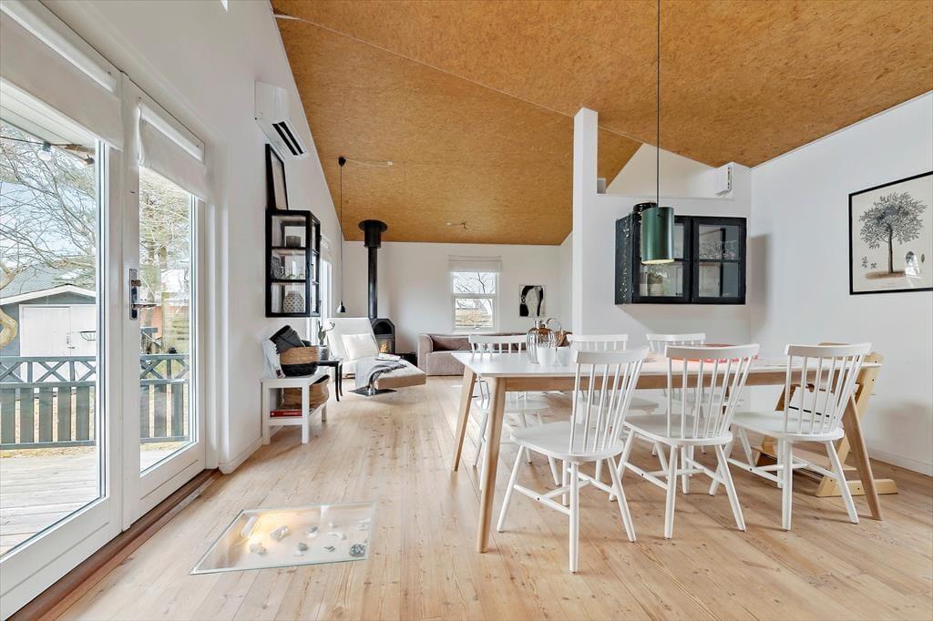 Dieses helle Ferienhaus überzeugt mit großen, hellen Räumen. Schnell wirst du feststellen, dass die Küche das Herzstück des Hauses ist. Sie ist offen mit dem Wohnraum verbunden und ermöglicht es dir, zusammen mit deinen Lieben die Mahlzeiten zuzubereiten. Falls du lieber alleine am Herd stehst, genießt du dennoch die Nähe deiner Familie, die sich beispielsweise in gemütlicher Runde mit einem Brettspiel am Esstisch vergnügt. Von beiden Seiten gelangt viel Tageslicht in die Küche. Dank der Fenster, durch die du auf die Terrasse und in die freie Natur blickst, wird es dir in der Küche nie langweilig. Der Gasherd lässt das Herz eines jeden Hobbykochs höher schlagen. Der Backofen ist allerdings elektrisch. Die beiden großen Schlafräume bieten viel Platz für deine Familie und euer Reisegepäck. Im Nebengebäude steht ein weiteres Doppelbett zur Verfügung. Das Nebengebäude verwöhnt mit einer Fußbodenheizung und beinhaltet darüber hinaus eine Waschmaschine und einen kleinen Gefrierschrank.