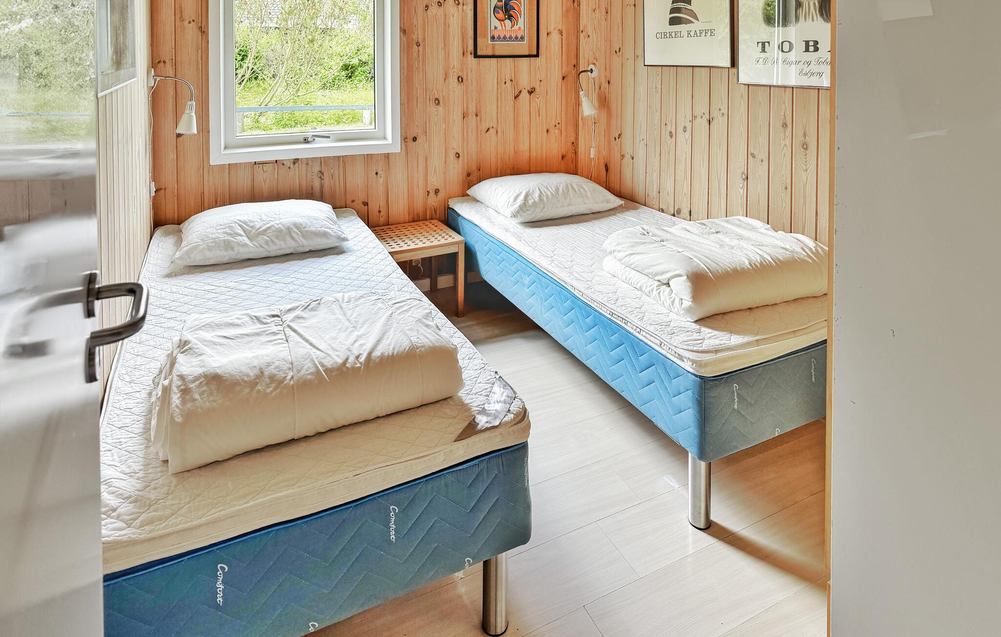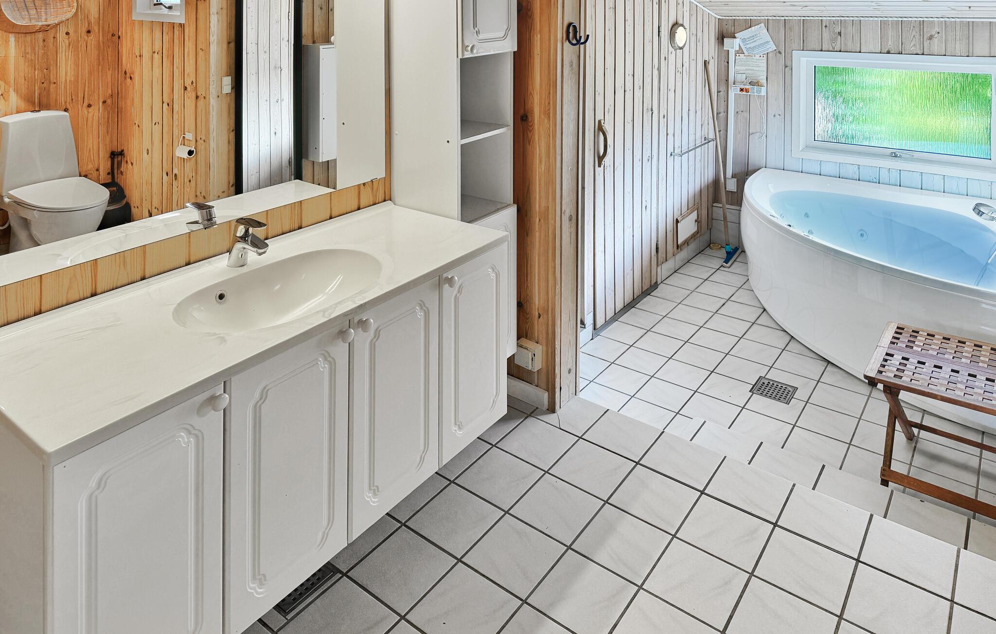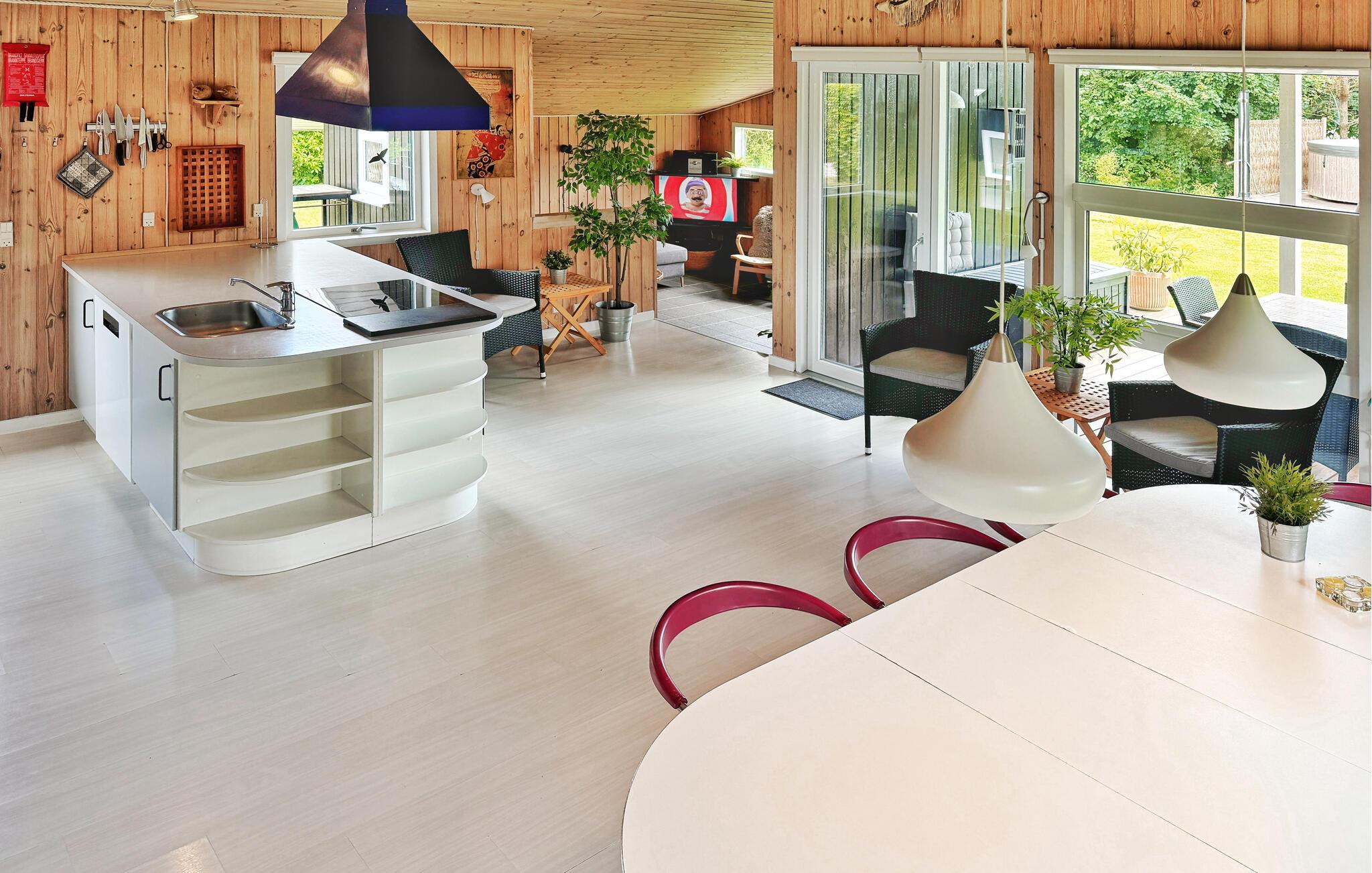 Das Haus ist mit einer schönen großen Wohnküche mit Platz für alle am Esstisch und einem abgesenkten (zwei Stufen) Kaminzimmer mit TV (dänische und deutsche Kanäle) ausgestattet. Die vier Schlafzimmer sind hell, gut ausgestattet und bieten viel Platz, etwa für zwei Familien. Es gibt auch zwei Badezimmer, von denen eines einen abgesenkten (zweistufigen) Bereich mit Whirlpool, Wickeltisch und Sauna hat. Natürlich haben beide Badezimmer eine Dusche.