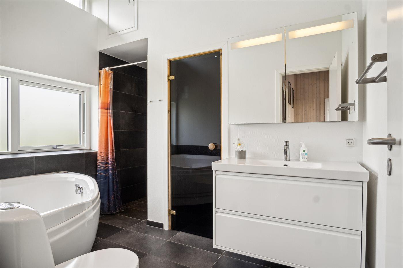 Es gibt 2 Badezimmer mit Duschnische und 2 Toiletten. Fußbodenheizung in 2 Badezimmern. Es steht eine Sauna zur Verfügung in der Sie sich so richtig entspannen können.