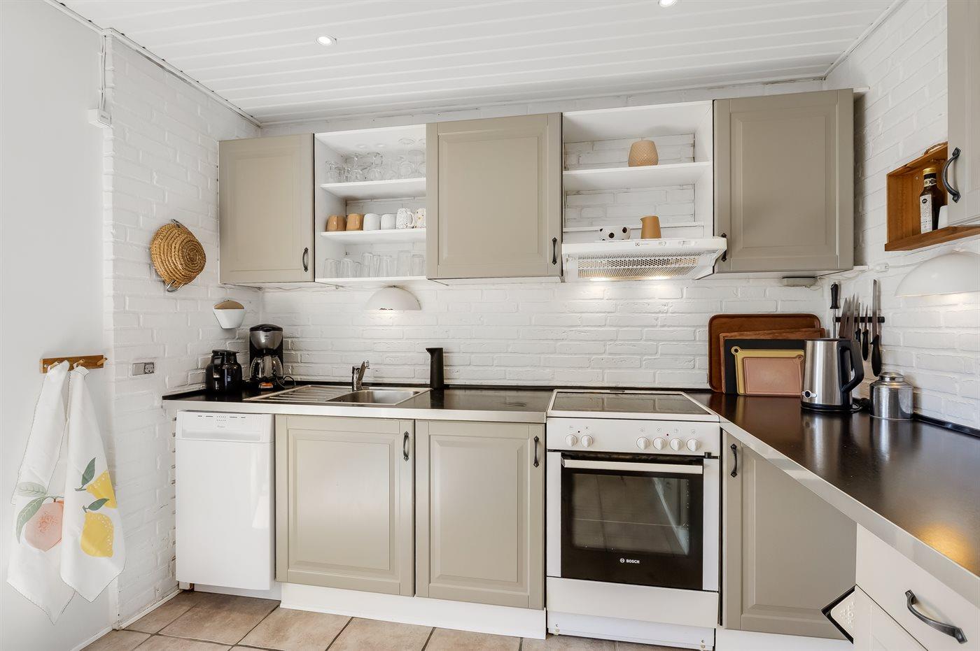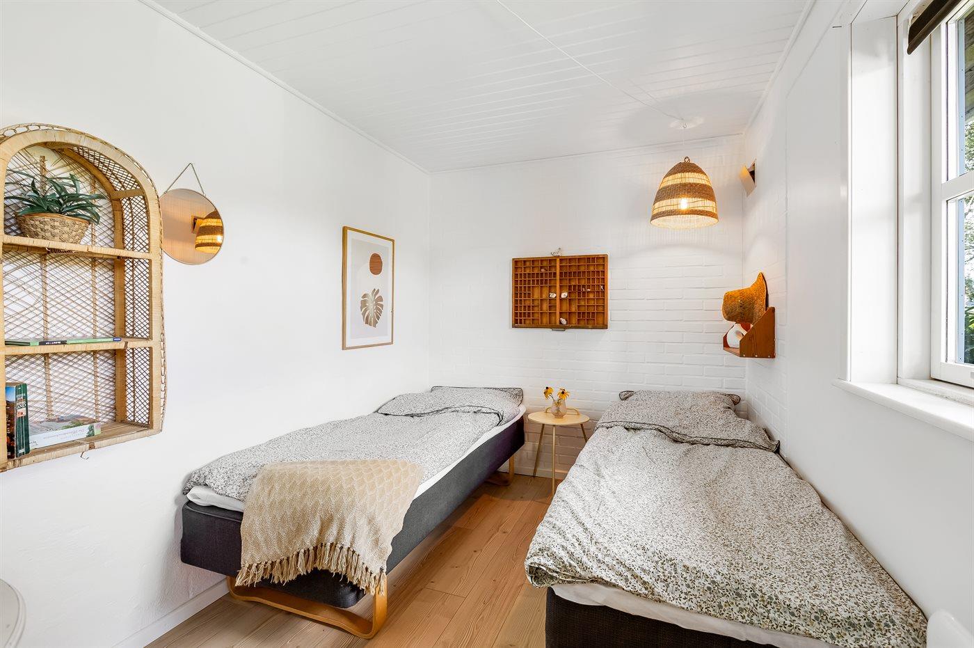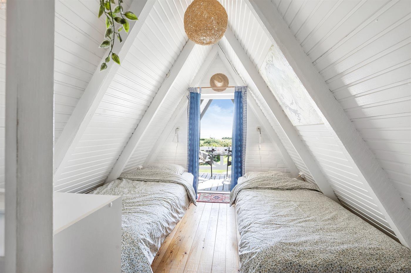 Ihr habt vier Schlafzimmer zur Verfügung, zwei im Erdgeschoss und zwei im Obergeschoss. Oben sind die Zimmer durch Vorhänge getrennt, was Flexibilität und eine lockere, gemütliche Atmosphäre schaffen. Das Ferienhaus ist mit einer hellen, offenen Wohnküche eingerichtet, in der ihr viel Platz für gemeinsame Mahlzeiten und gemütliche Stunden habt.