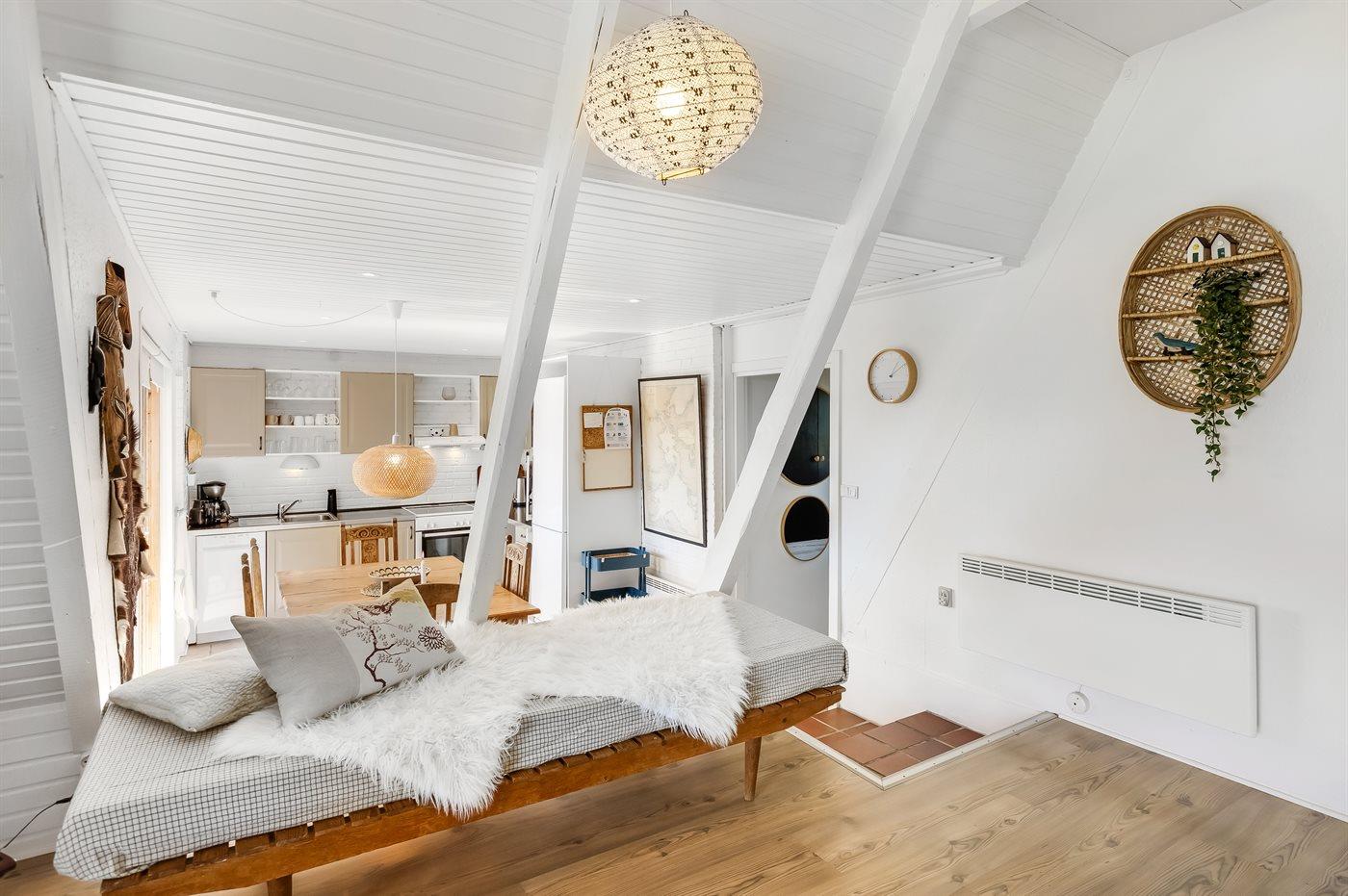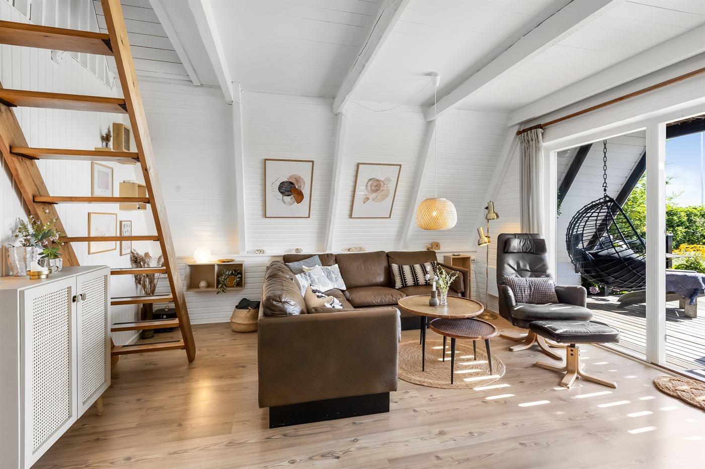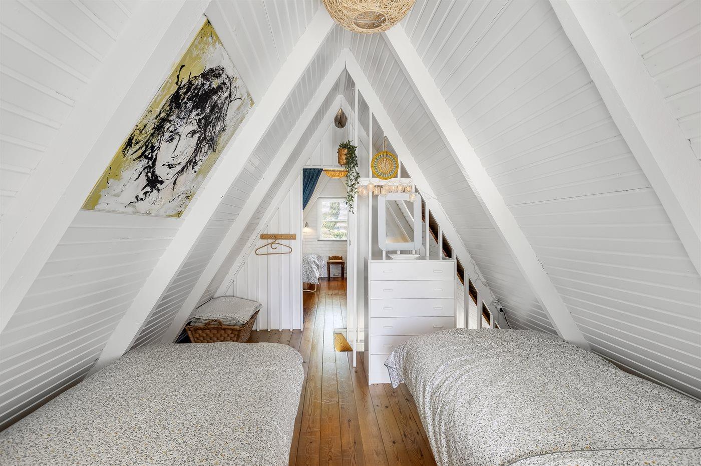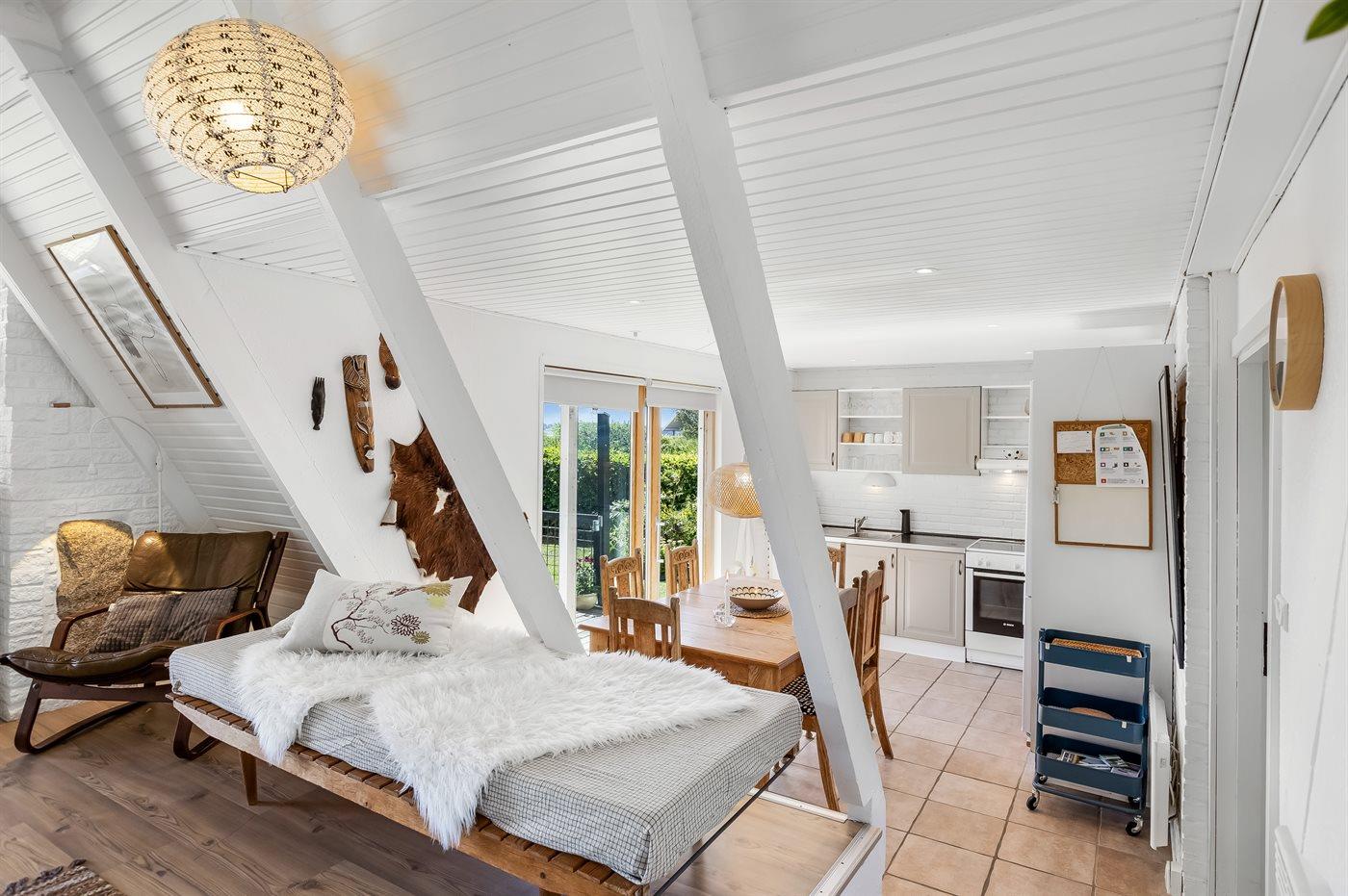 Ihr habt vier Schlafzimmer zur Verfügung, zwei im Erdgeschoss und zwei im Obergeschoss. Oben sind die Zimmer durch Vorhänge getrennt, was Flexibilität und eine lockere, gemütliche Atmosphäre schaffen. Das Ferienhaus ist mit einer hellen, offenen Wohnküche eingerichtet, in der ihr viel Platz für gemeinsame Mahlzeiten und gemütliche Stunden habt.