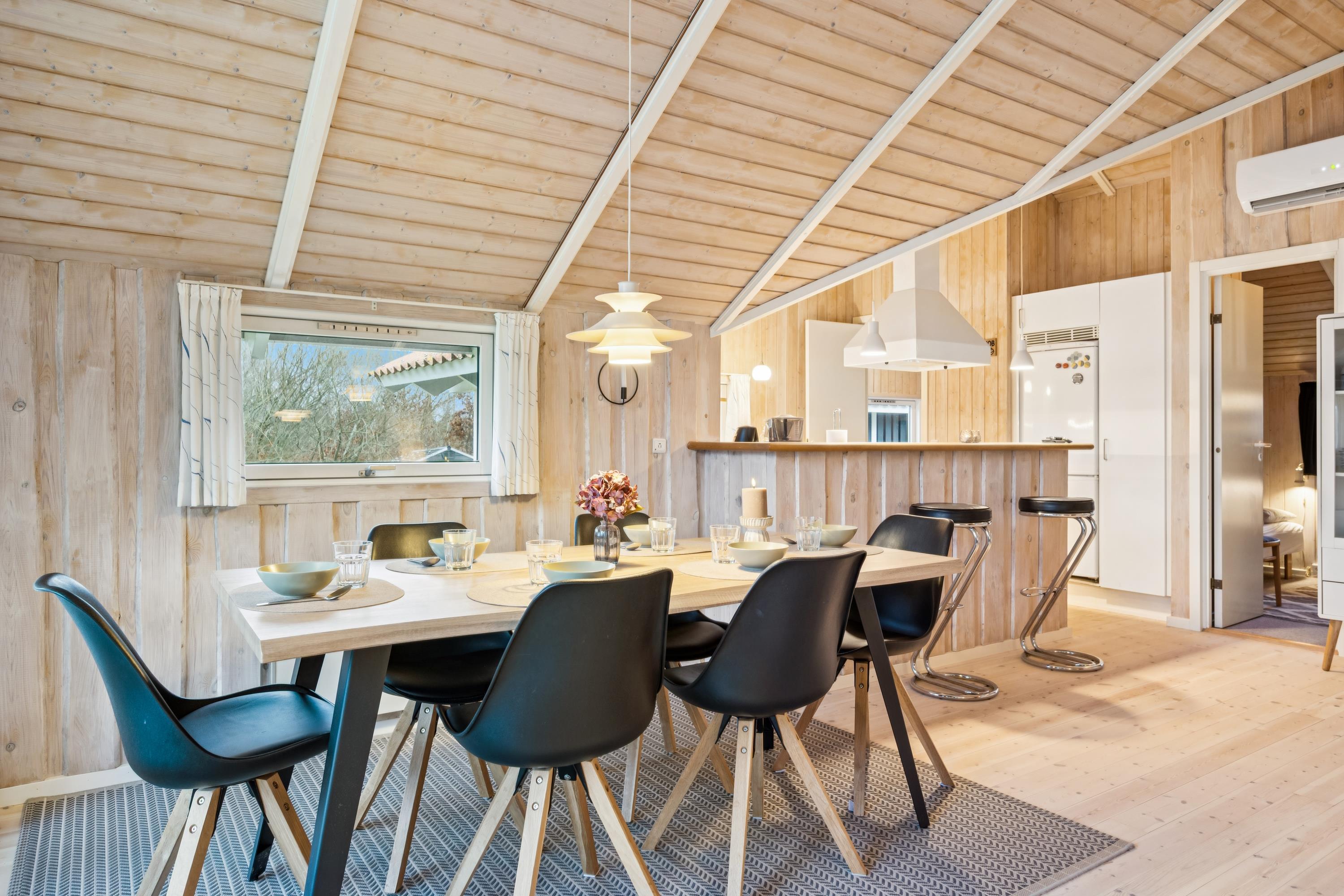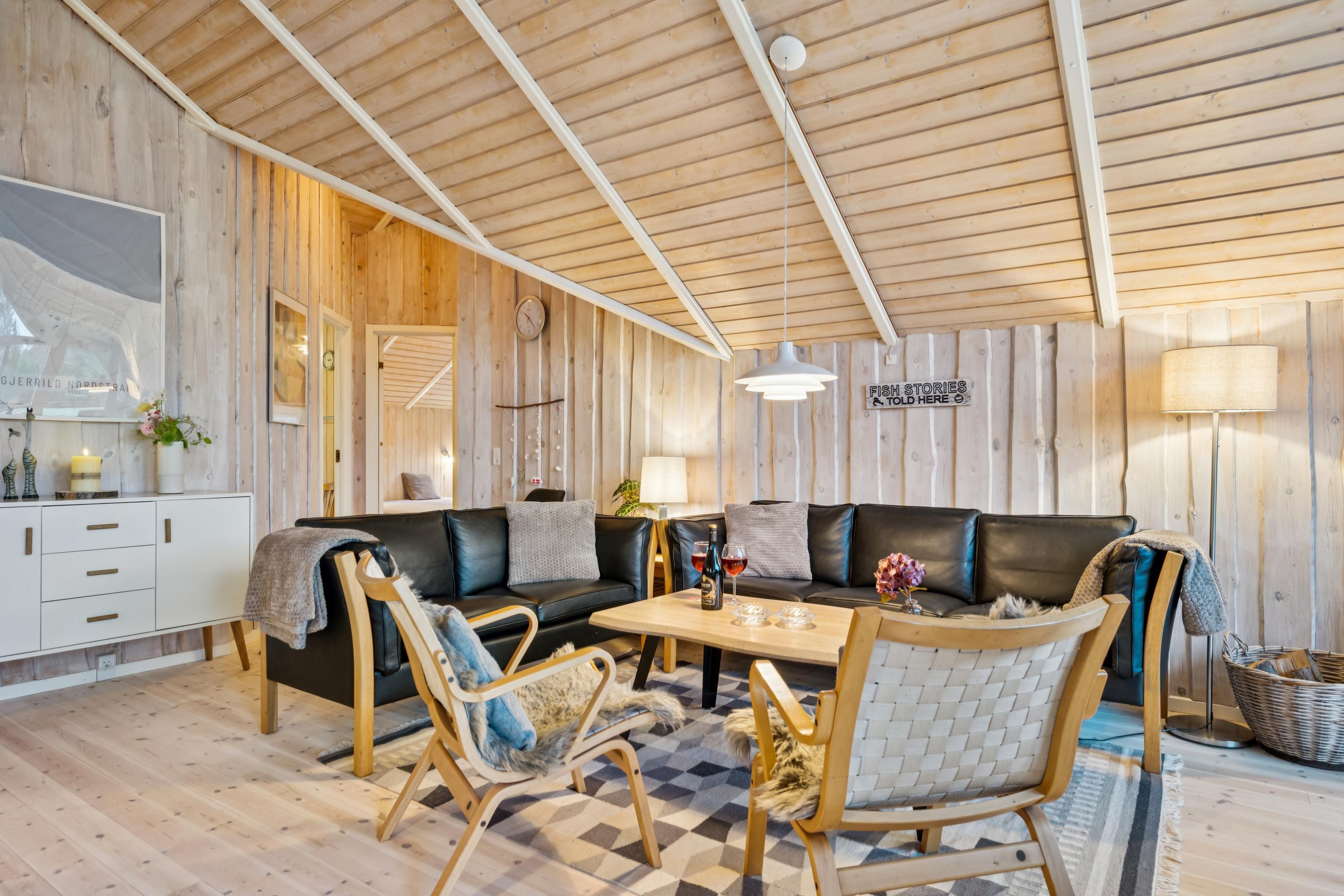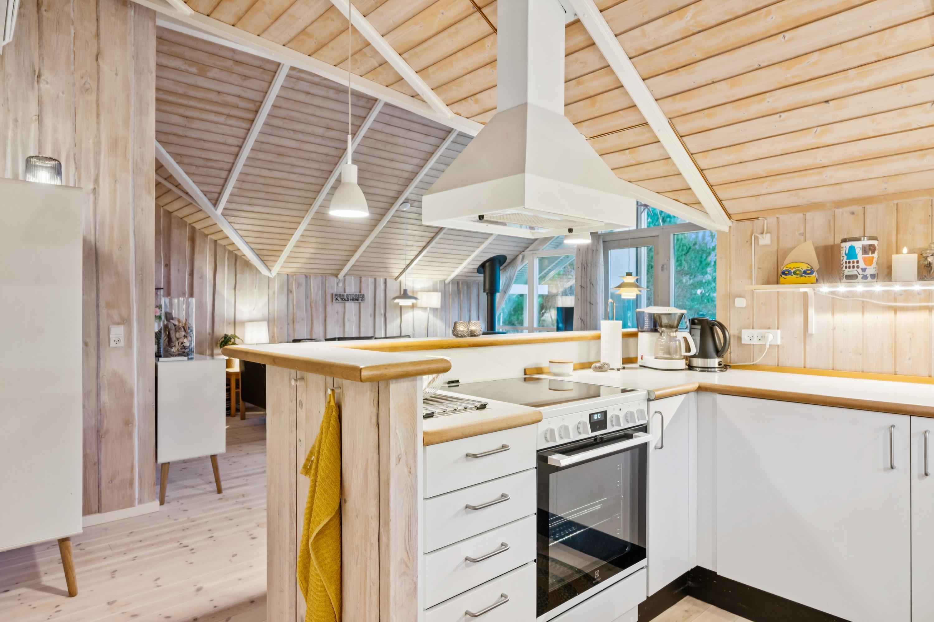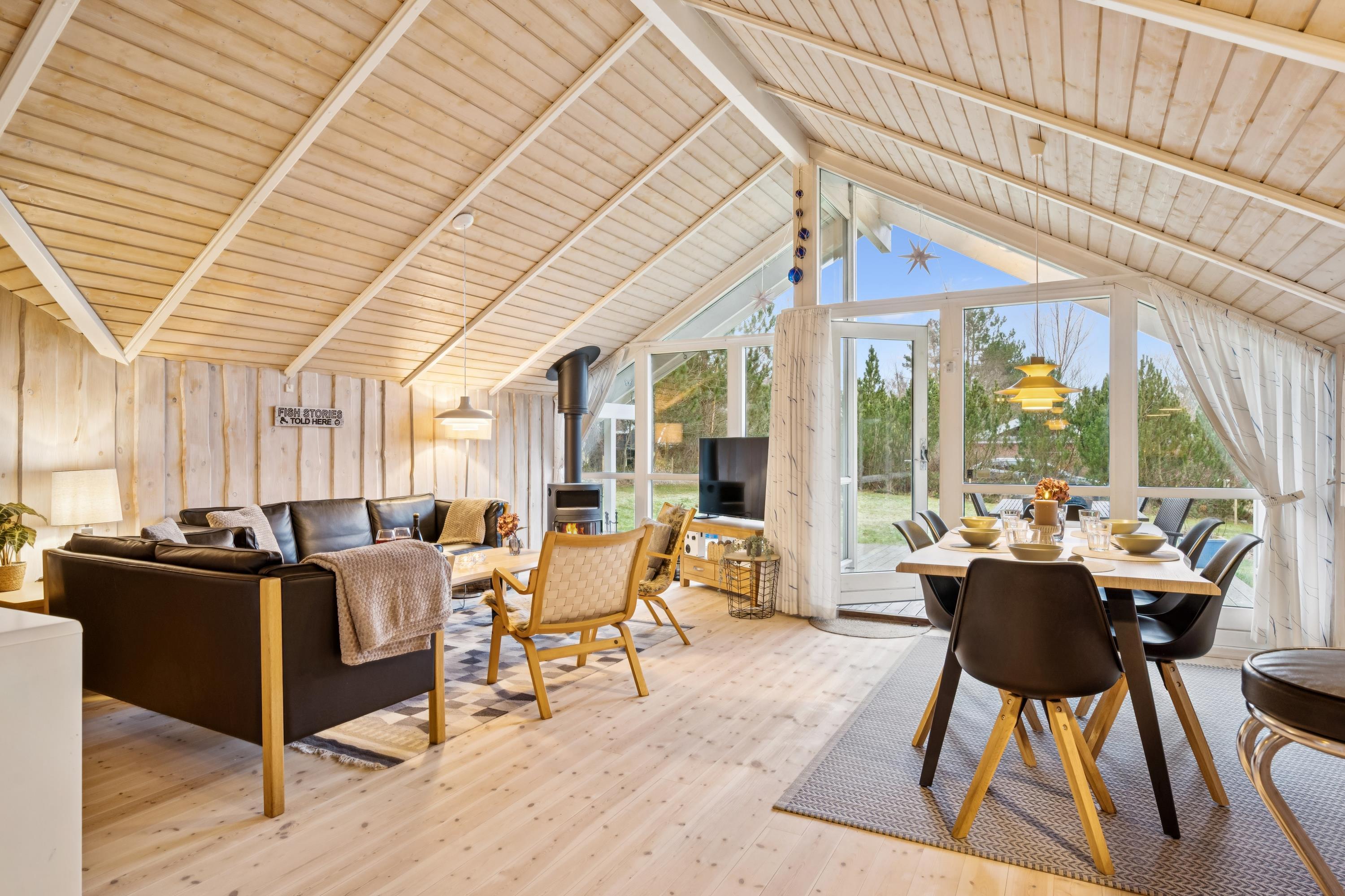 Willkommen in diesem besonders gemütlichen und sehr gepflegten Ferienhaus. Das Haus verfügt über ein geschmackvoll eingerichtetes und behagliches Wohnzimmer mit komfortablen Möbeln, Kaminofen und Wärmepumpe. Vom Wohnzimmer aus haben Sie Zugang zu einer schönen, überdachten Terrasse mit Gartenmöbeln. In Verbindung mit dem Wohnzimmer liegt die gemütliche Küche, die u. a. mit einem Geschirrspüler ausgestattet ist, sowie ein einladender Essbereich.