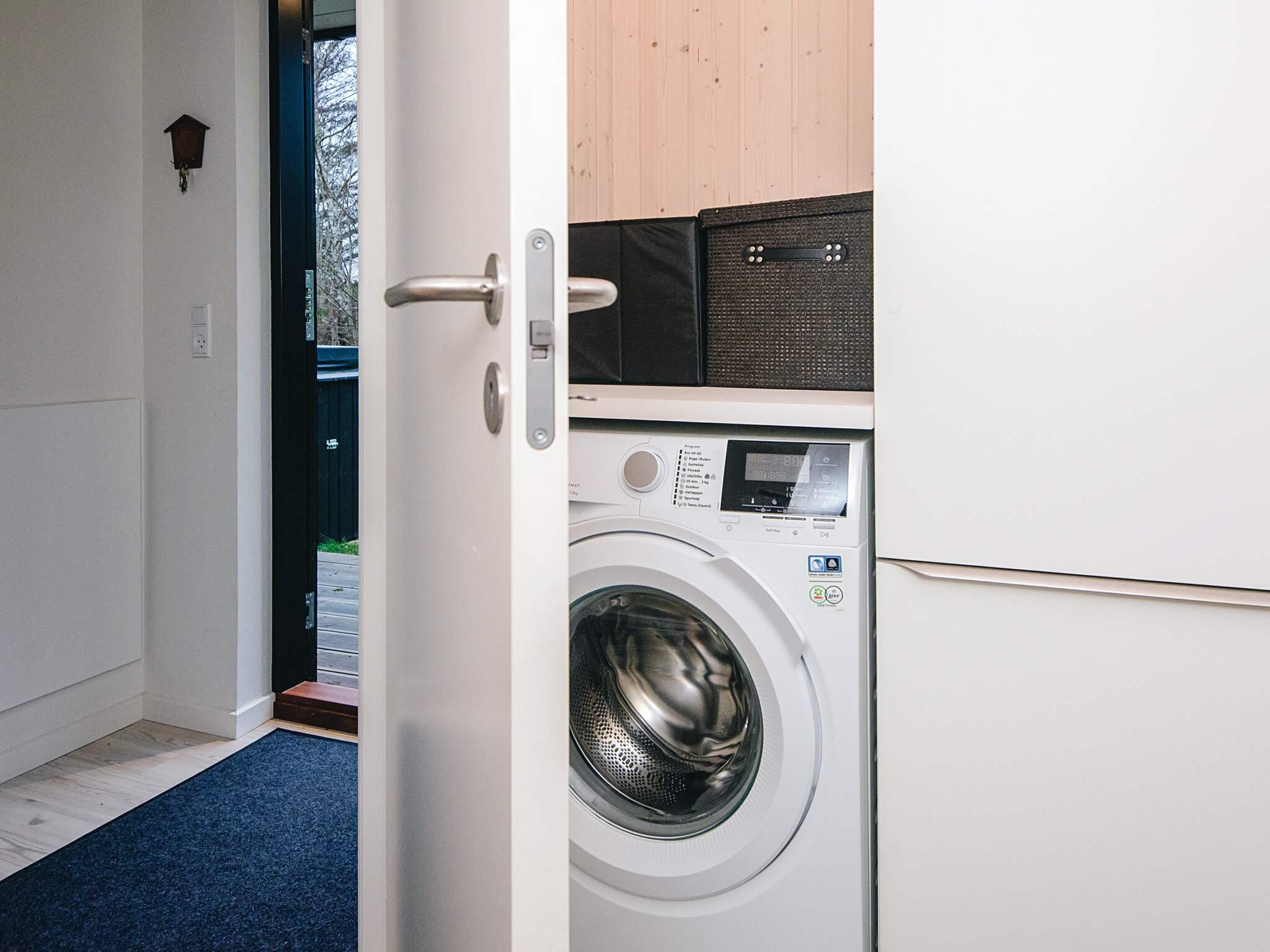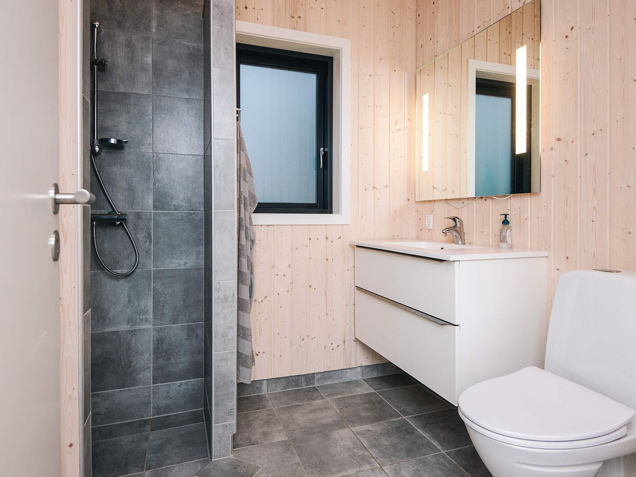 Badeværelset er moderne og funktionelt med bruser, WC, håndvask og vaskemaskine.