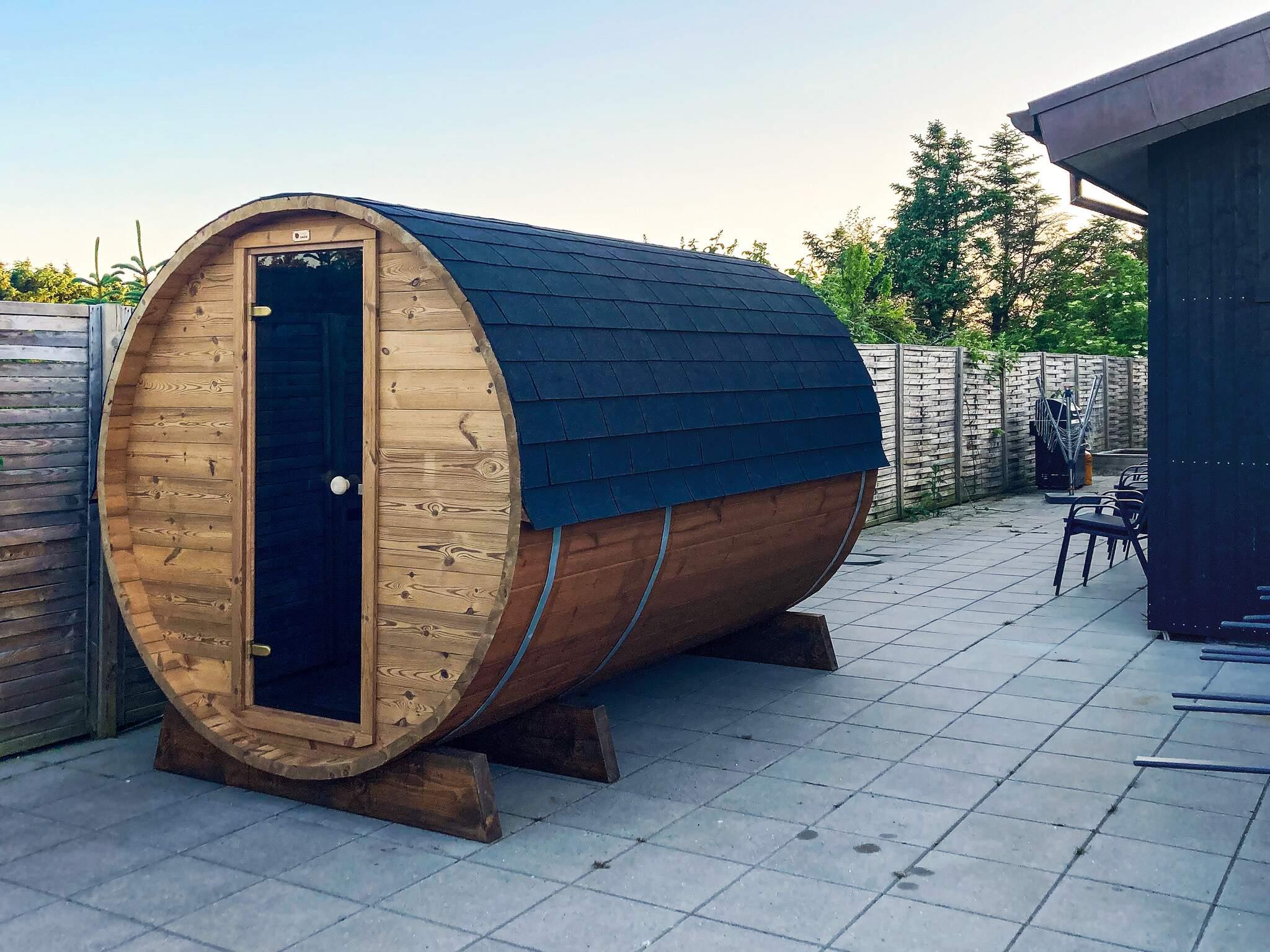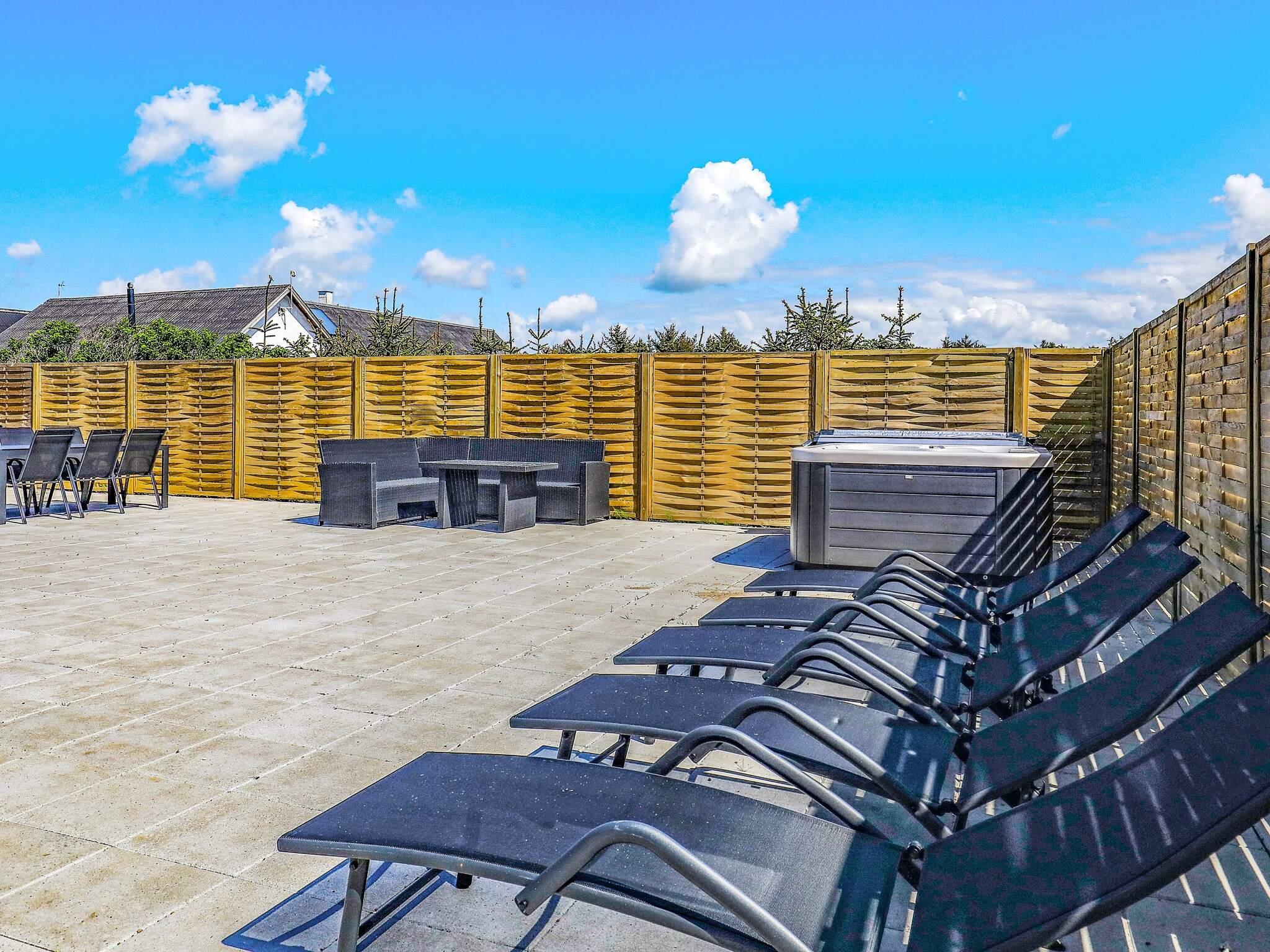 Im Freien steht hinter dem Haus eine etwa 250 m2 große, abgeschirmte Terrassenfläche mit Sitzgelegenheiten und Außenküche, inkl. Gasgrill, zur Verfügung. Noch dazu gibt es einen großen Außen-Whirlpool für bis zu sechs Personen. In Verbindung mit der Terrasse findet man auch eine praktische Außendusche für eine kurze Dusche zwischendurch. Zudem Saunafass im Außenbereich. Kleinkinder freuen sich über Kletterturm und Sandkasten am Ende der Terrasse.