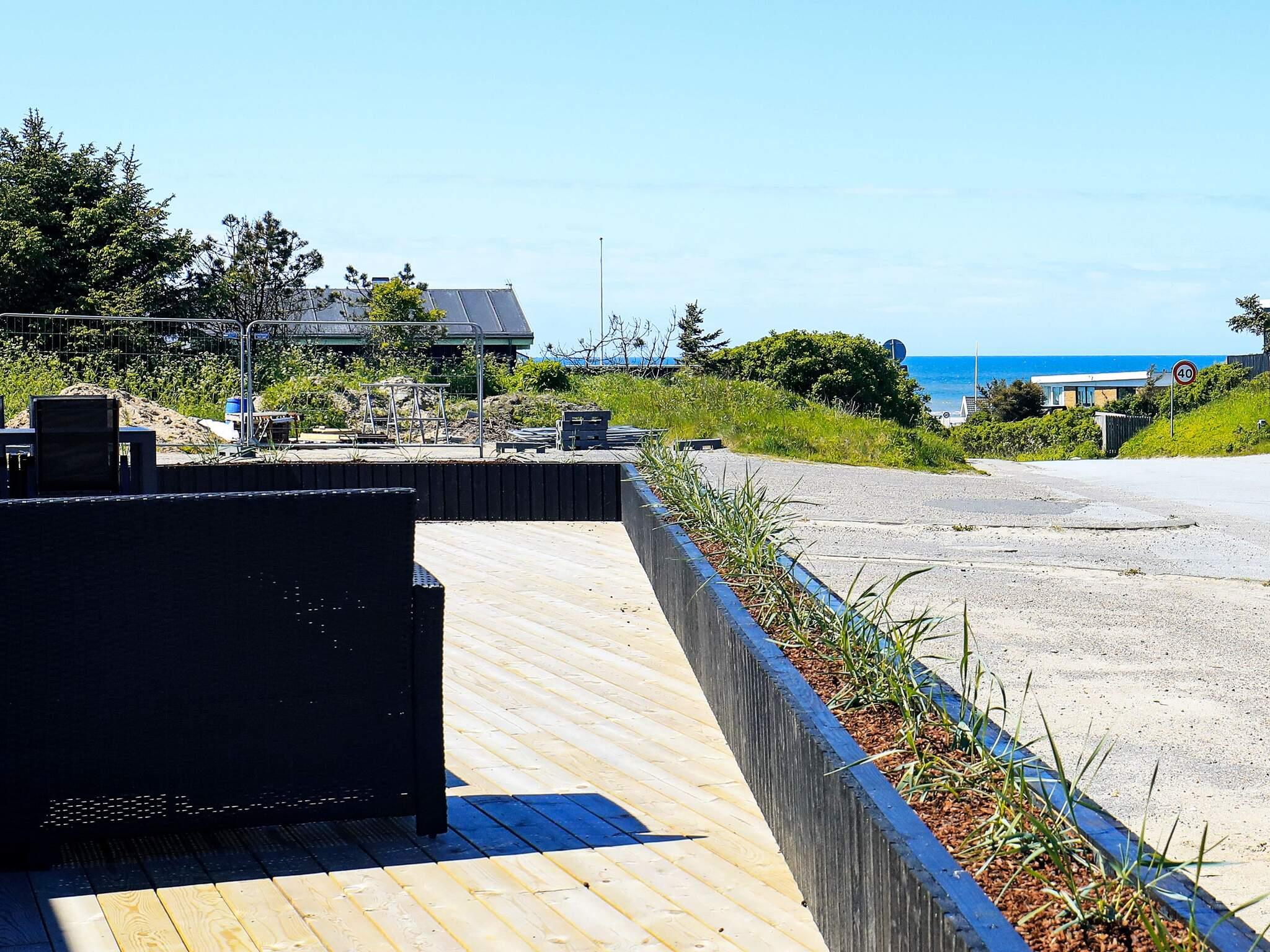 Vor dem Haus findet man weitere ca. 120 m2 große, offene Terrassenfläche mit Sitzgelegenheiten und Ausblick zum Grønhøj Strand, der sich keine 200 m von der Terrasse befindet. In Verlängerung der Terrasse stehen zudem sechs Stellplätze zur Verfügung.