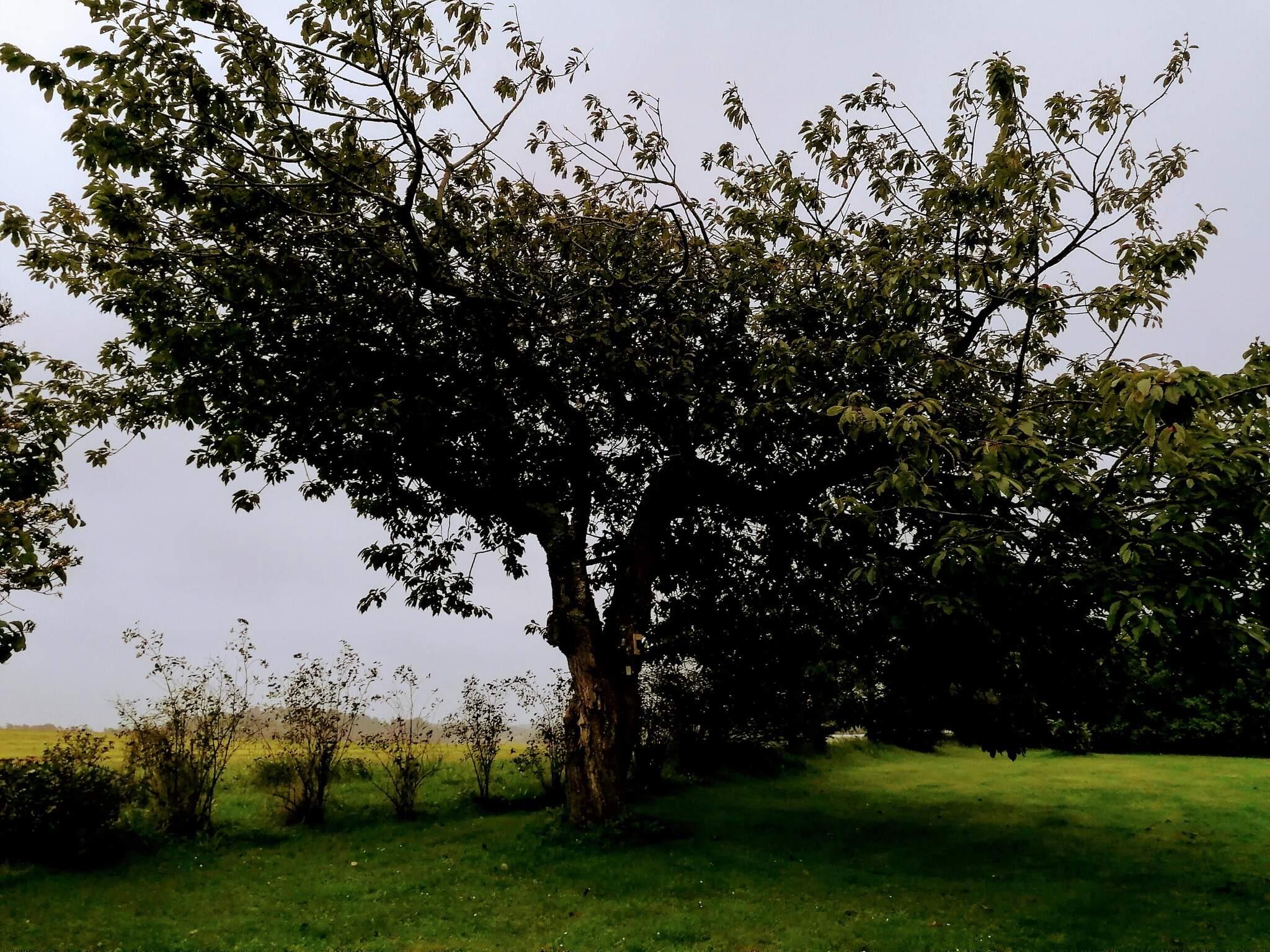 Die offene Terrasse erstreckt sich über mehrere Hausseiten. Das zugehörige Naturgrundstück ist flach und eignet sich prima zum Spielen und Toben. Es gibt auch eine Feuerstelle.
