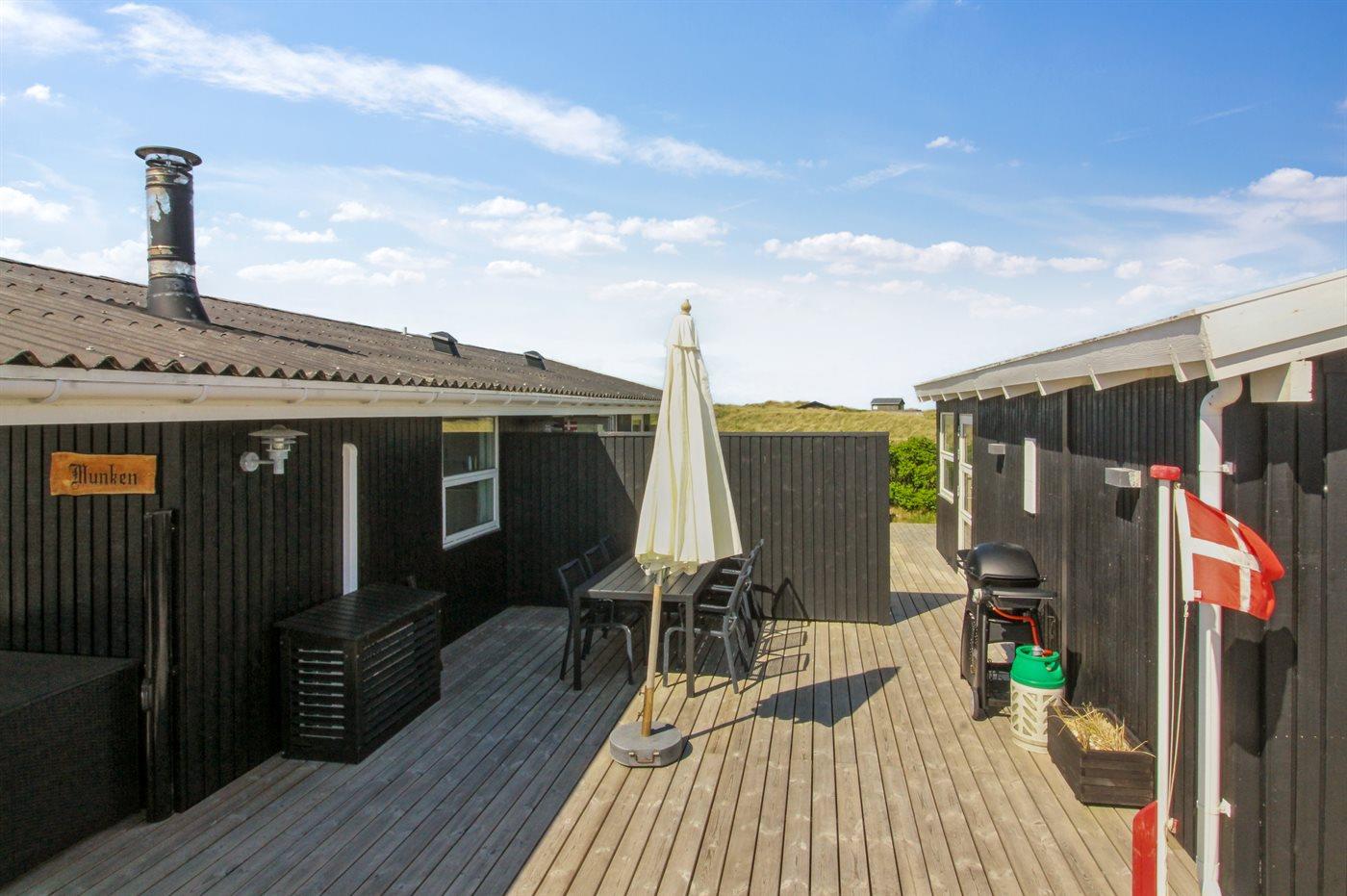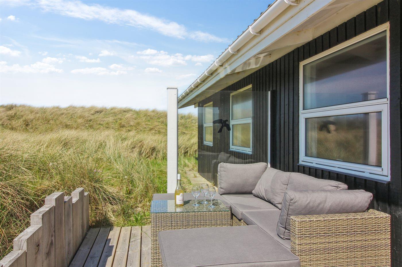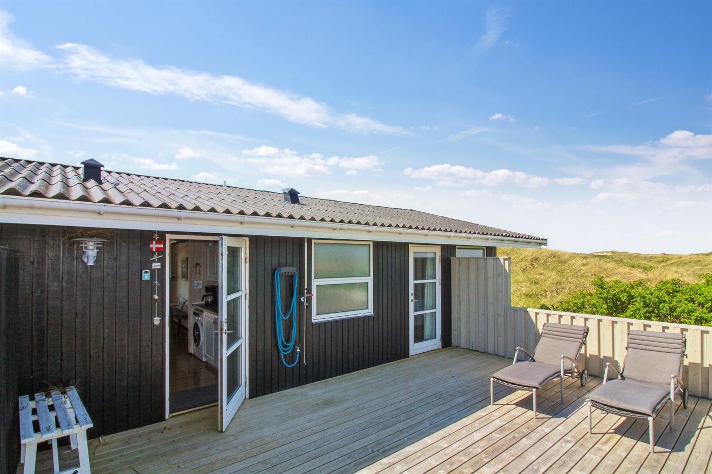In der Dünenlandschaft südlich von Løkken finden Sie dieses Ferienhaus, laufend renoviert. Zwischen den Dünen gibt es einen Fußweg zum Wasser sowie einen Natursandkasten. Zum Haus gehört ein großer abgeschirmter nach Südosten gerichteter Sonnenhof und nach Südwesten gerichtete, überdachte Terrasse mit diversen Gartenmöbeln. Besonders vom Grundstück haben Sie eine schöne Aussicht über die Dünen, das Ferienhausgebiet und die umgebene Landschaft.