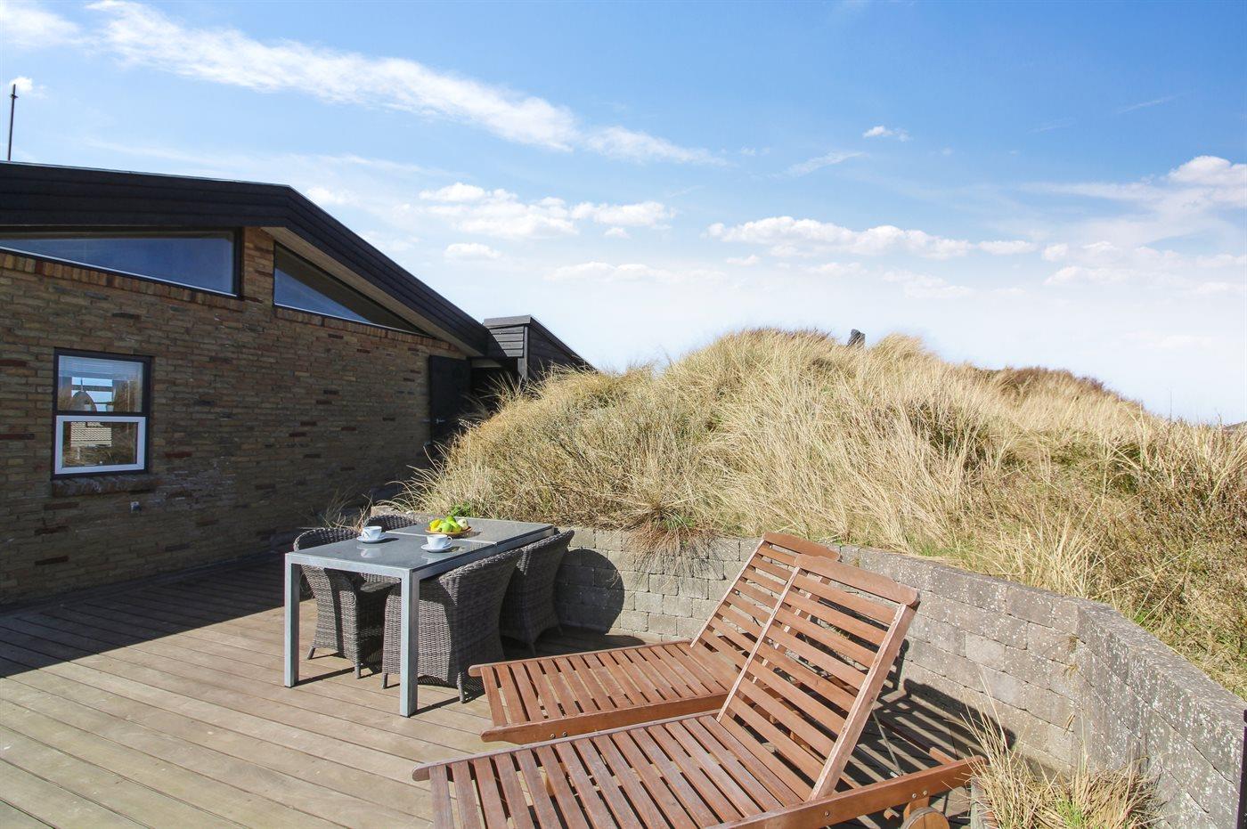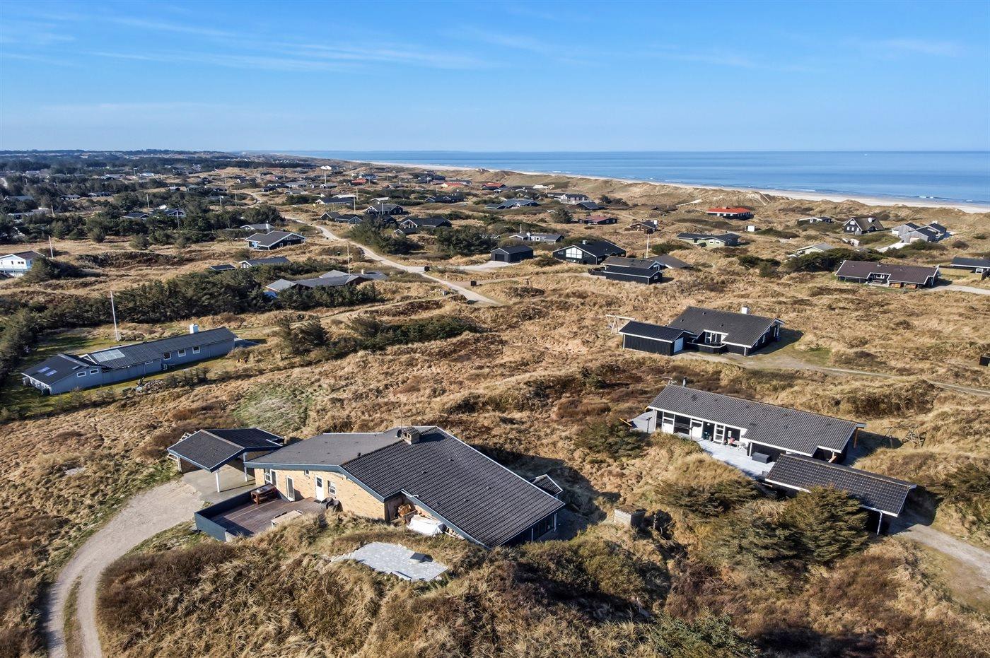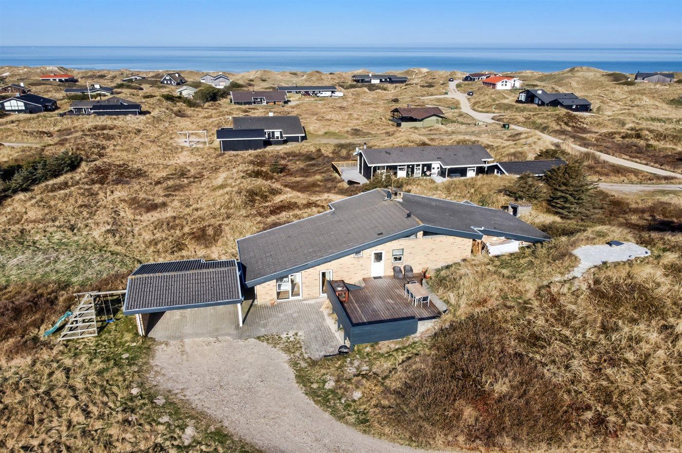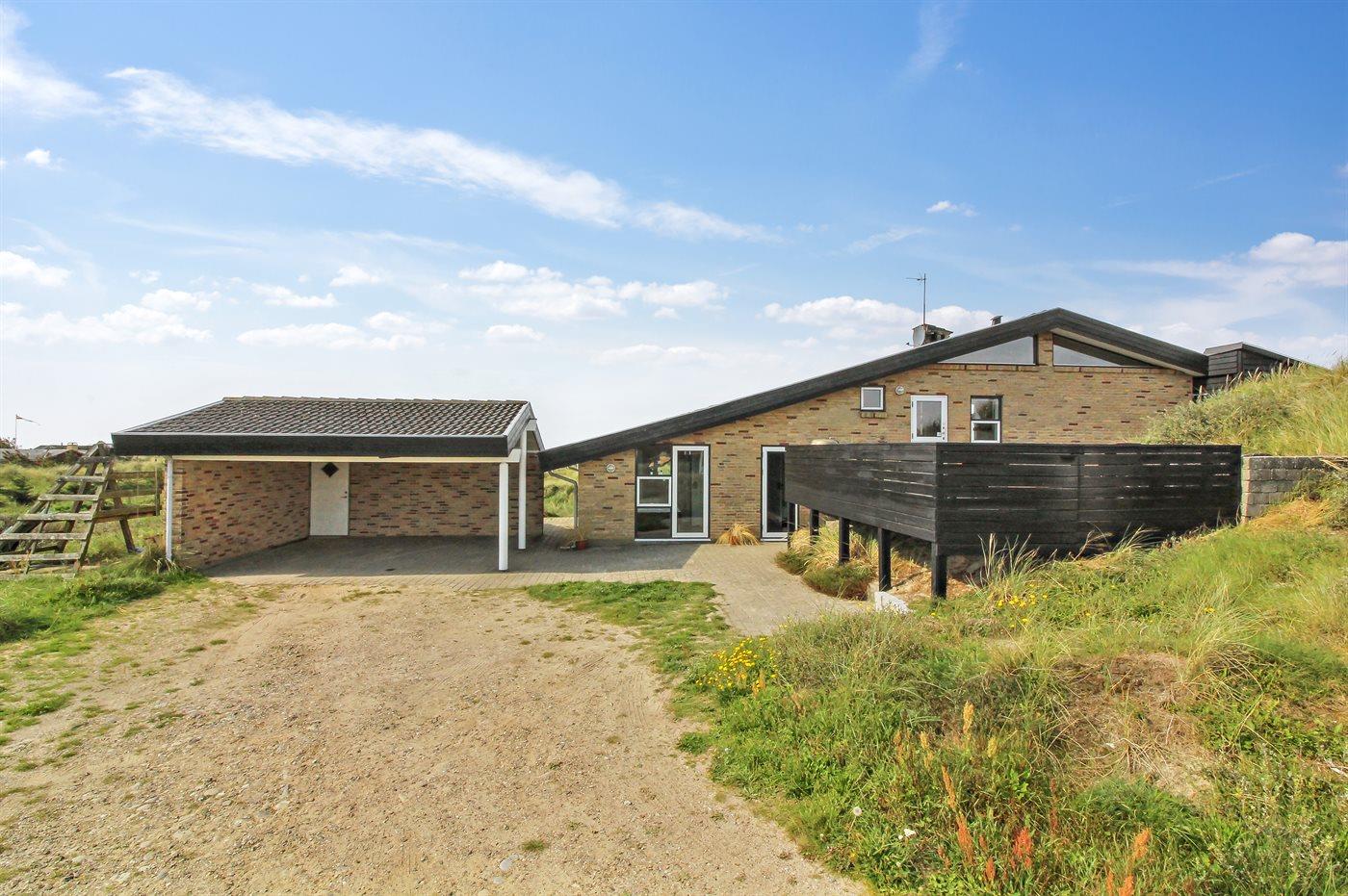 Auf einem großen, hügeligen Dünengrundstück liegt dieses von einem Architechten gezeichneten Ferienhaus hübsch im Grundstück angepasst, so dass die 2 Terrassen nach Osten mit natürlichem Schutz von dem Westenwind legen. Es gibt ferner 3 Terrassen nach Westen. Das Haus ist gut isoliert und mit energiegerechten Türen und Fenstern. Luft-zum-Wasser-Wärmepumpe, die Energie für Pool-Wasser und Nutzwasser sowie Heizung für Poolraum und Küche/Wohnzimmer produziert. Dieses bedeutet niedrige Energiekosten. Das Zugpflaster des Hauses ist die Poolabteilung mit Swimmingpool, Gegenstromanlage, Whirlpool und Bar. Es gibt direkten Zutritt zur Sauna und Badezimmer mit Waschmaschine und Wäschetrockner sowie Zutritt zu einer nach Westen gerichteten Terrasse. Die einzigartige Architektur in 3 versetzten Ebenen ist ein ganz besonderes Erlebnis. Die 2 Schlafplätze auf Matratzen finden Sie im offenen Obergeschoss. Überall im Haus sind erstklassige Materialien verwendet worden. Vom Wohnzimmer gibt es eine prachtvolle Aussicht über Dünen und Meer. Doppelcarport vorhanden. Auf dem Grundstück finden Sie die höchste Düne des Gebietes mit Treppe von der Terrasse zur Aussichtsbank mit einer 180 Grad Panoramaaussicht über die Nordsee.