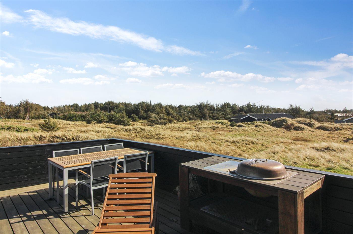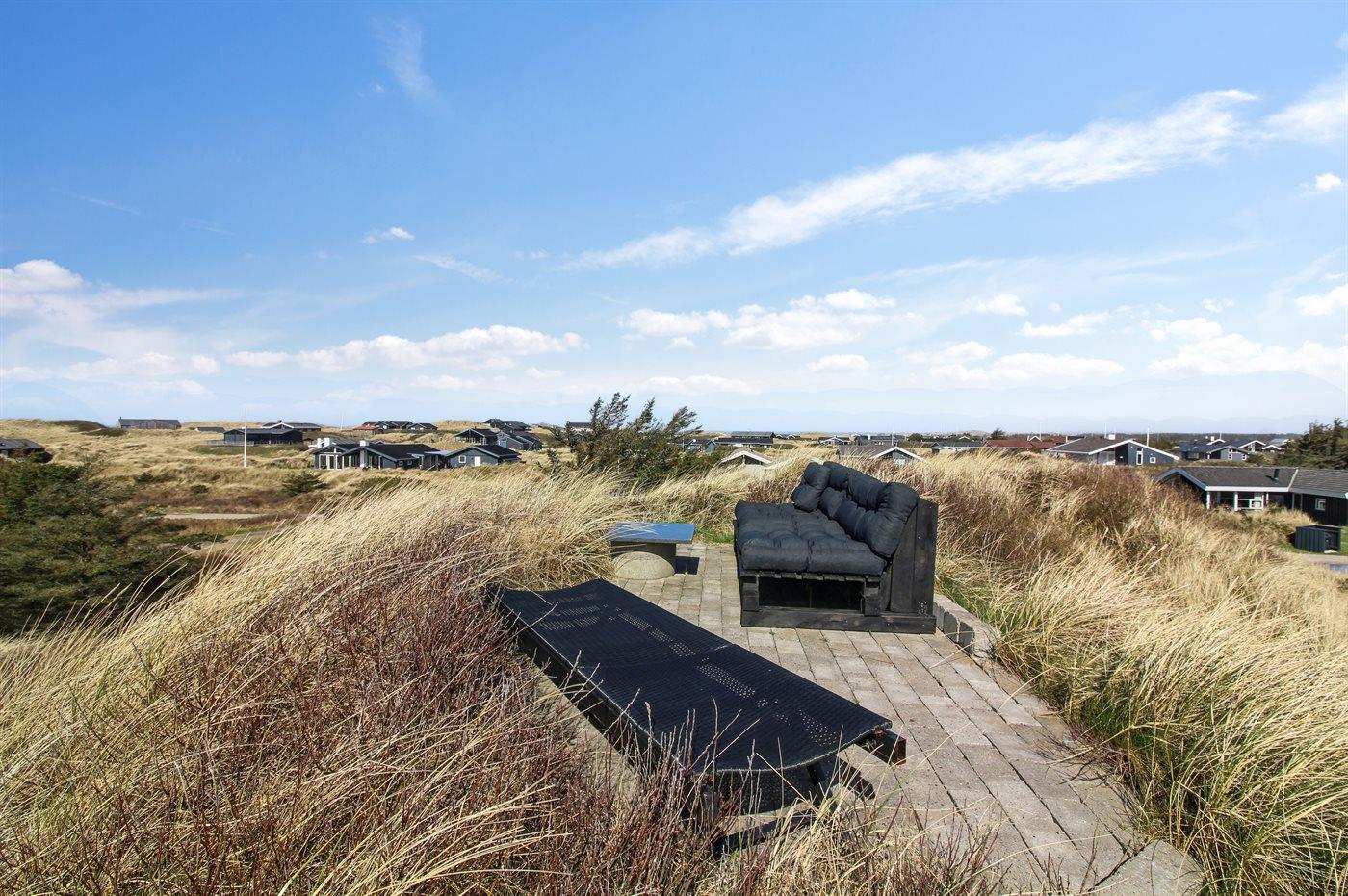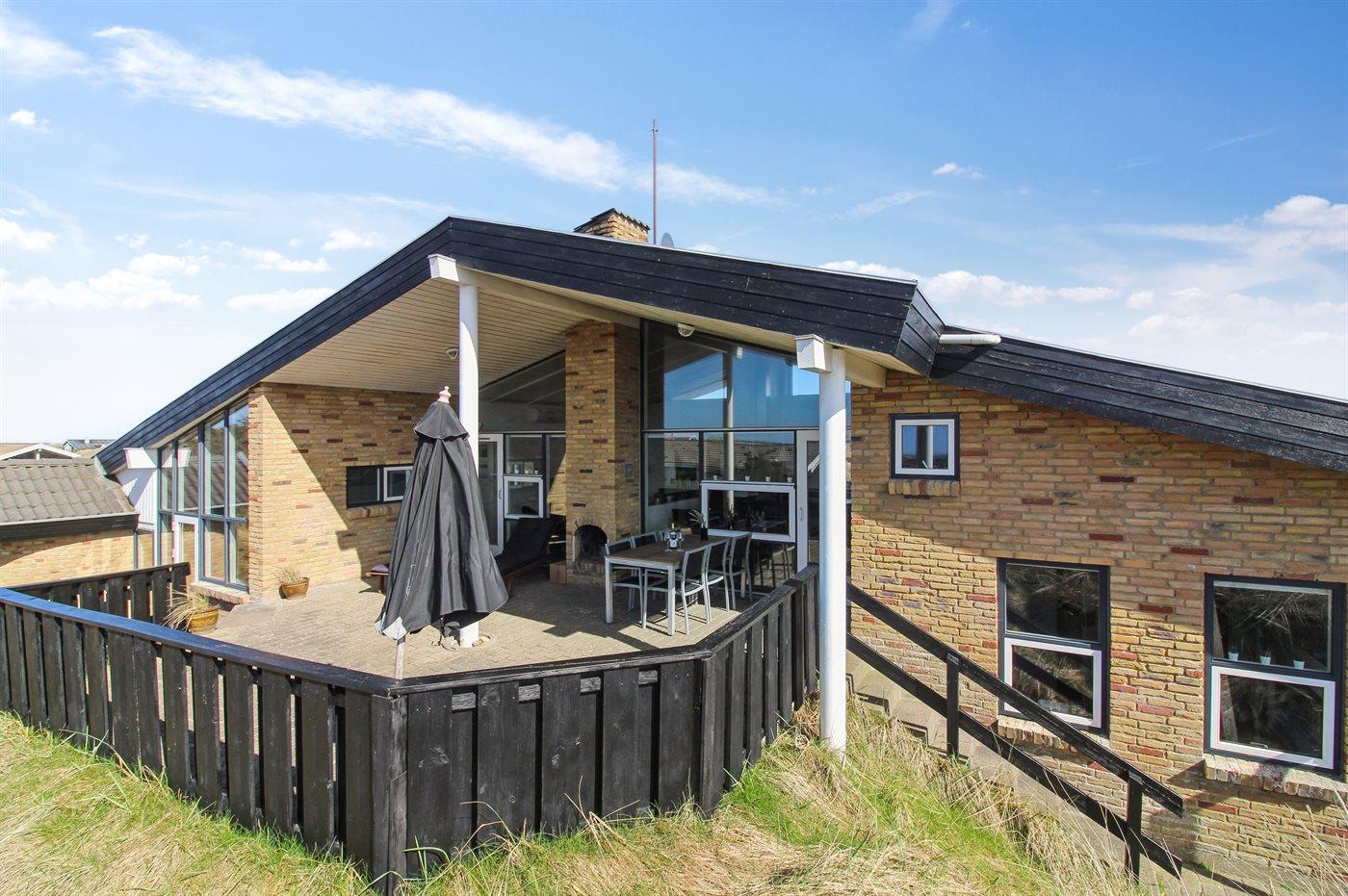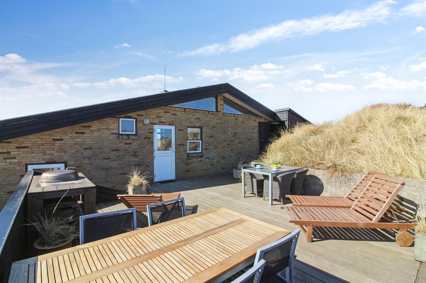 Auf einem großen, hügeligen Dünengrundstück liegt dieses von einem Architechten gezeichneten Ferienhaus hübsch im Grundstück angepasst, so dass die 2 Terrassen nach Osten mit natürlichem Schutz von dem Westenwind legen. Es gibt ferner 3 Terrassen nach Westen. Das Haus ist gut isoliert und mit energiegerechten Türen und Fenstern. Luft-zum-Wasser-Wärmepumpe, die Energie für Pool-Wasser und Nutzwasser sowie Heizung für Poolraum und Küche/Wohnzimmer produziert. Dieses bedeutet niedrige Energiekosten. Das Zugpflaster des Hauses ist die Poolabteilung mit Swimmingpool, Gegenstromanlage, Whirlpool und Bar. Es gibt direkten Zutritt zur Sauna und Badezimmer mit Waschmaschine und Wäschetrockner sowie Zutritt zu einer nach Westen gerichteten Terrasse. Die einzigartige Architektur in 3 versetzten Ebenen ist ein ganz besonderes Erlebnis. Die 2 Schlafplätze auf Matratzen finden Sie im offenen Obergeschoss. Überall im Haus sind erstklassige Materialien verwendet worden. Vom Wohnzimmer gibt es eine prachtvolle Aussicht über Dünen und Meer. Doppelcarport vorhanden. Auf dem Grundstück finden Sie die höchste Düne des Gebietes mit Treppe von der Terrasse zur Aussichtsbank mit einer 180 Grad Panoramaaussicht über die Nordsee.