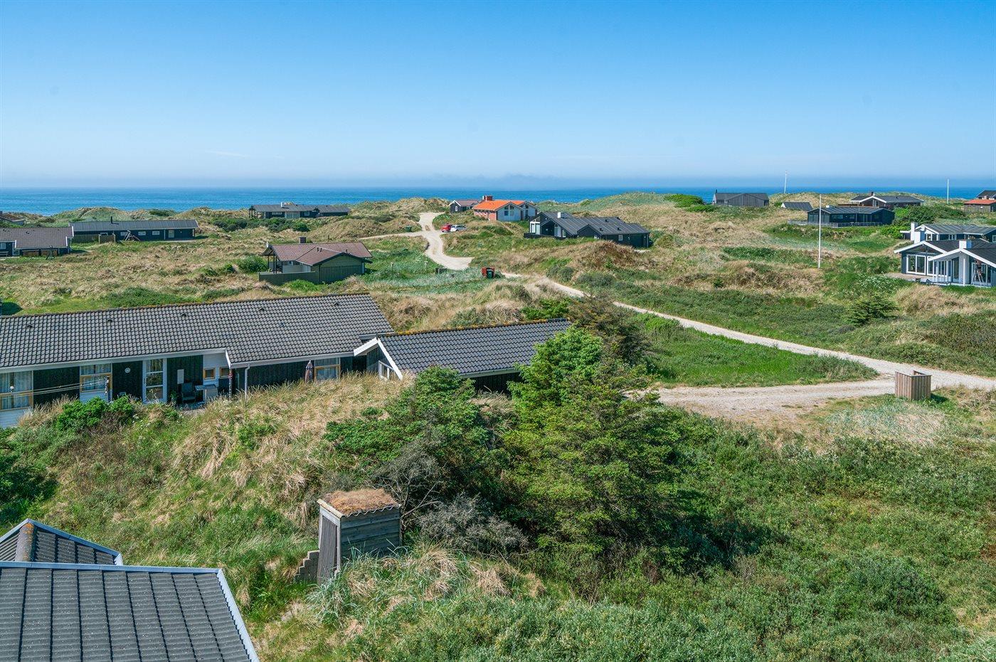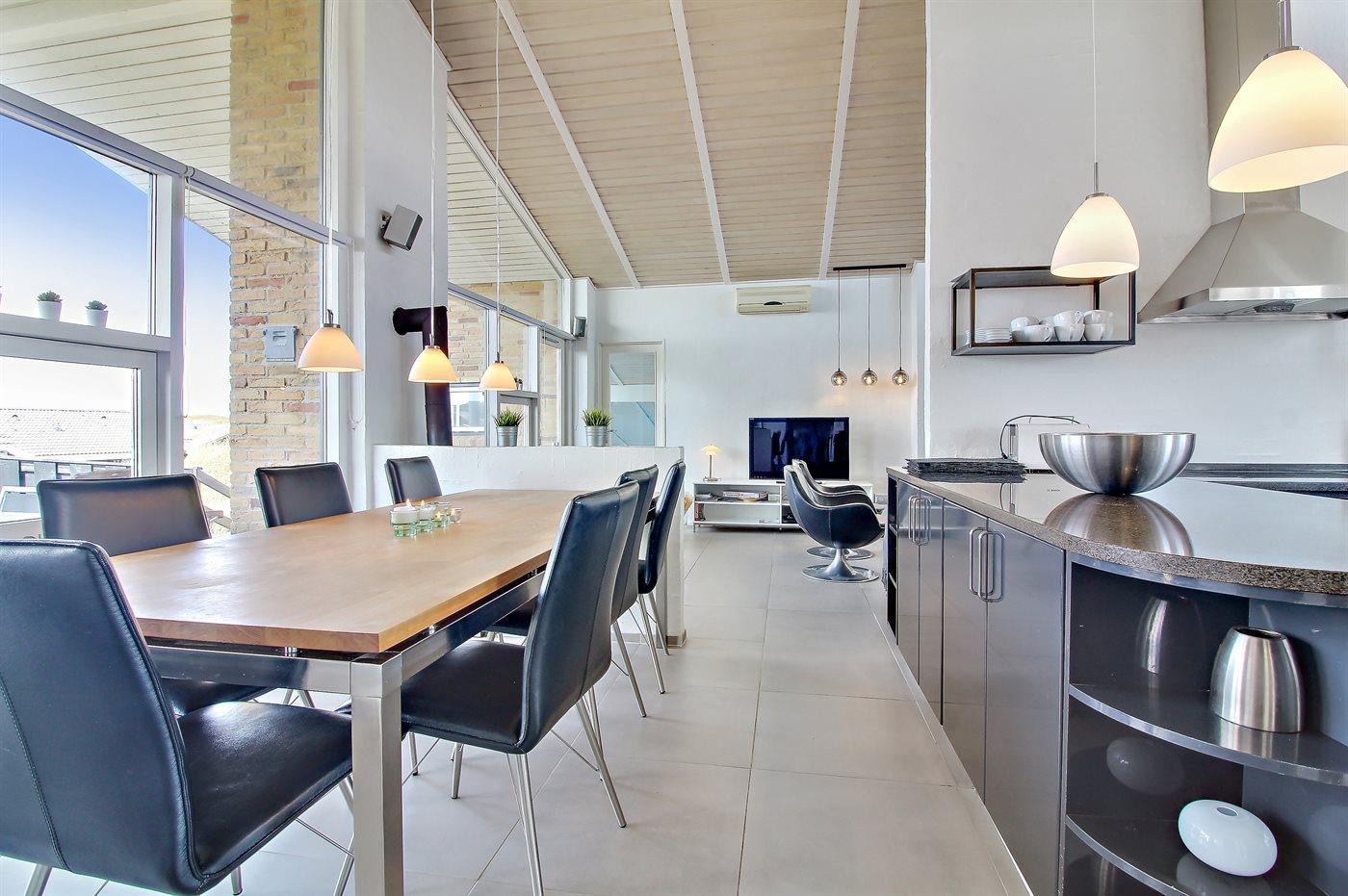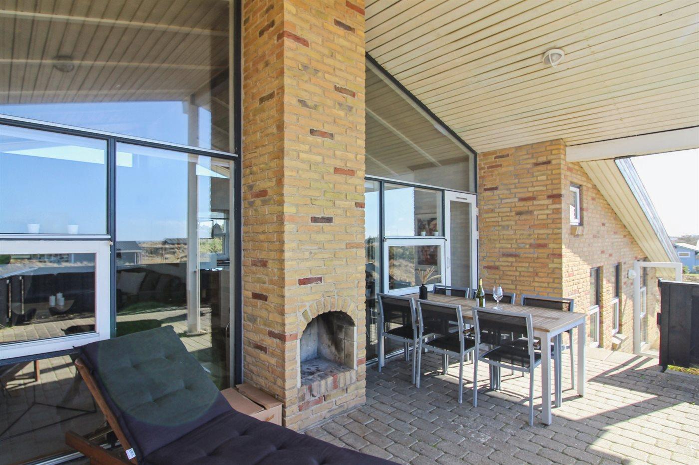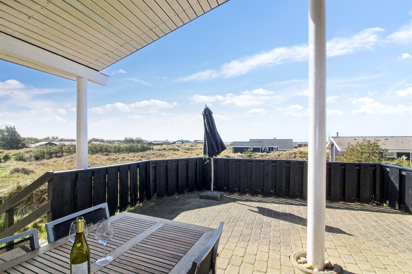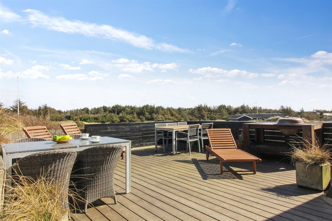 Auf einem großen, hügeligen Dünengrundstück liegt dieses von einem Architechten gezeichneten Ferienhaus hübsch im Grundstück angepasst, so dass die 2 Terrassen nach Osten mit natürlichem Schutz von dem Westenwind legen. Es gibt ferner 3 Terrassen nach Westen. Das Haus ist gut isoliert und mit energiegerechten Türen und Fenstern. Luft-zum-Wasser-Wärmepumpe, die Energie für Pool-Wasser und Nutzwasser sowie Heizung für Poolraum und Küche/Wohnzimmer produziert. Dieses bedeutet niedrige Energiekosten. Das Zugpflaster des Hauses ist die Poolabteilung mit Swimmingpool, Gegenstromanlage, Whirlpool und Bar. Es gibt direkten Zutritt zur Sauna und Badezimmer mit Waschmaschine und Wäschetrockner sowie Zutritt zu einer nach Westen gerichteten Terrasse. Die einzigartige Architektur in 3 versetzten Ebenen ist ein ganz besonderes Erlebnis. Die 2 Schlafplätze auf Matratzen finden Sie im offenen Obergeschoss. Überall im Haus sind erstklassige Materialien verwendet worden. Vom Wohnzimmer gibt es eine prachtvolle Aussicht über Dünen und Meer. Doppelcarport vorhanden. Auf dem Grundstück finden Sie die höchste Düne des Gebietes mit Treppe von der Terrasse zur Aussichtsbank mit einer 180 Grad Panoramaaussicht über die Nordsee.