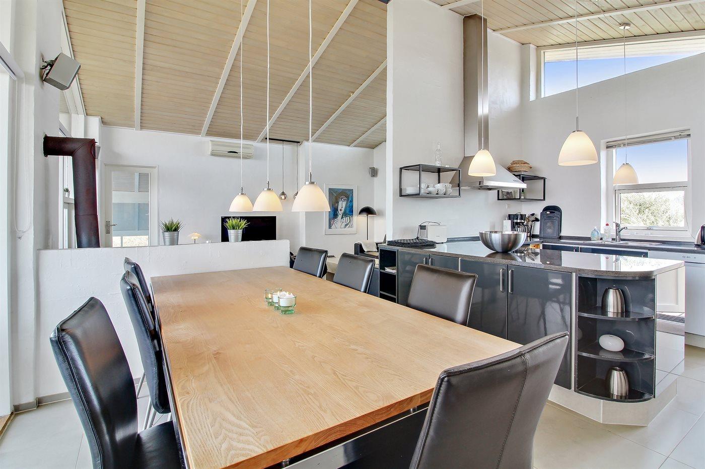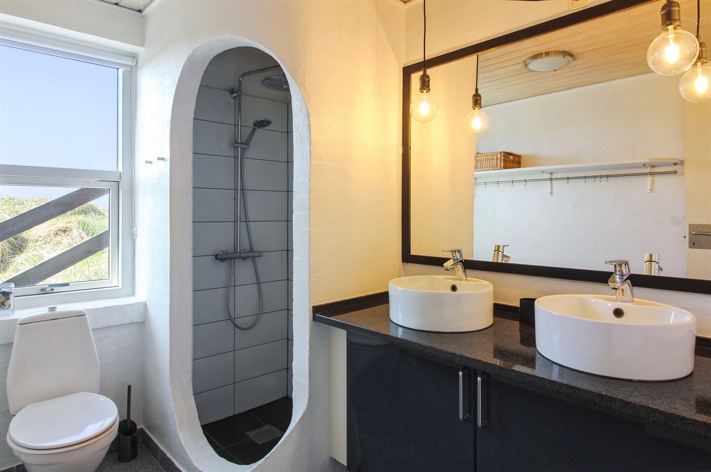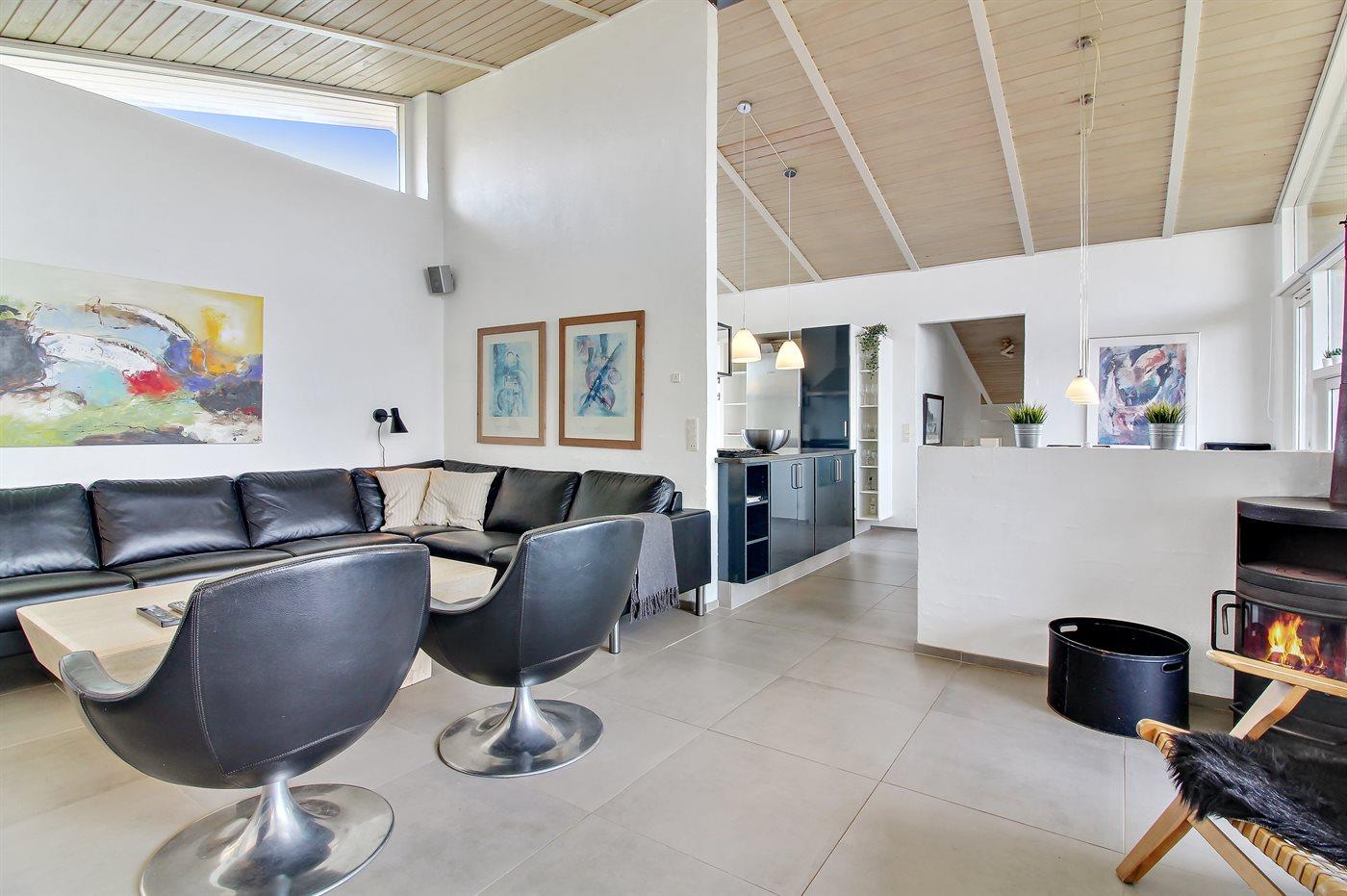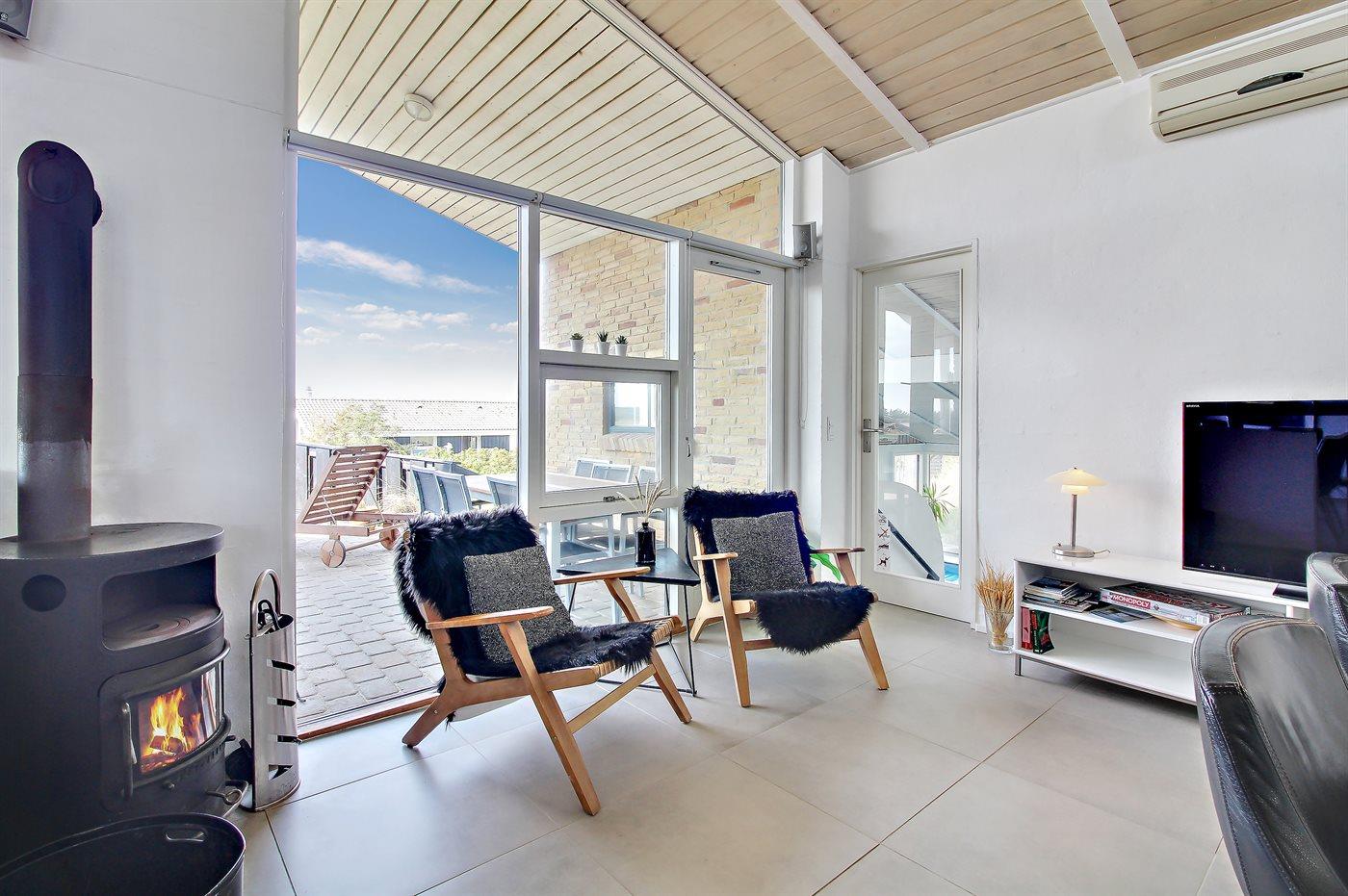 Auf einem großen, hügeligen Dünengrundstück liegt dieses von einem Architechten gezeichneten Ferienhaus hübsch im Grundstück angepasst, so dass die 2 Terrassen nach Osten mit natürlichem Schutz von dem Westenwind legen. Es gibt ferner 3 Terrassen nach Westen. Das Haus ist gut isoliert und mit energiegerechten Türen und Fenstern. Luft-zum-Wasser-Wärmepumpe, die Energie für Pool-Wasser und Nutzwasser sowie Heizung für Poolraum und Küche/Wohnzimmer produziert. Dieses bedeutet niedrige Energiekosten. Das Zugpflaster des Hauses ist die Poolabteilung mit Swimmingpool, Gegenstromanlage, Whirlpool und Bar. Es gibt direkten Zutritt zur Sauna und Badezimmer mit Waschmaschine und Wäschetrockner sowie Zutritt zu einer nach Westen gerichteten Terrasse. Die einzigartige Architektur in 3 versetzten Ebenen ist ein ganz besonderes Erlebnis. Die 2 Schlafplätze auf Matratzen finden Sie im offenen Obergeschoss. Überall im Haus sind erstklassige Materialien verwendet worden. Vom Wohnzimmer gibt es eine prachtvolle Aussicht über Dünen und Meer. Doppelcarport vorhanden. Auf dem Grundstück finden Sie die höchste Düne des Gebietes mit Treppe von der Terrasse zur Aussichtsbank mit einer 180 Grad Panoramaaussicht über die Nordsee.
