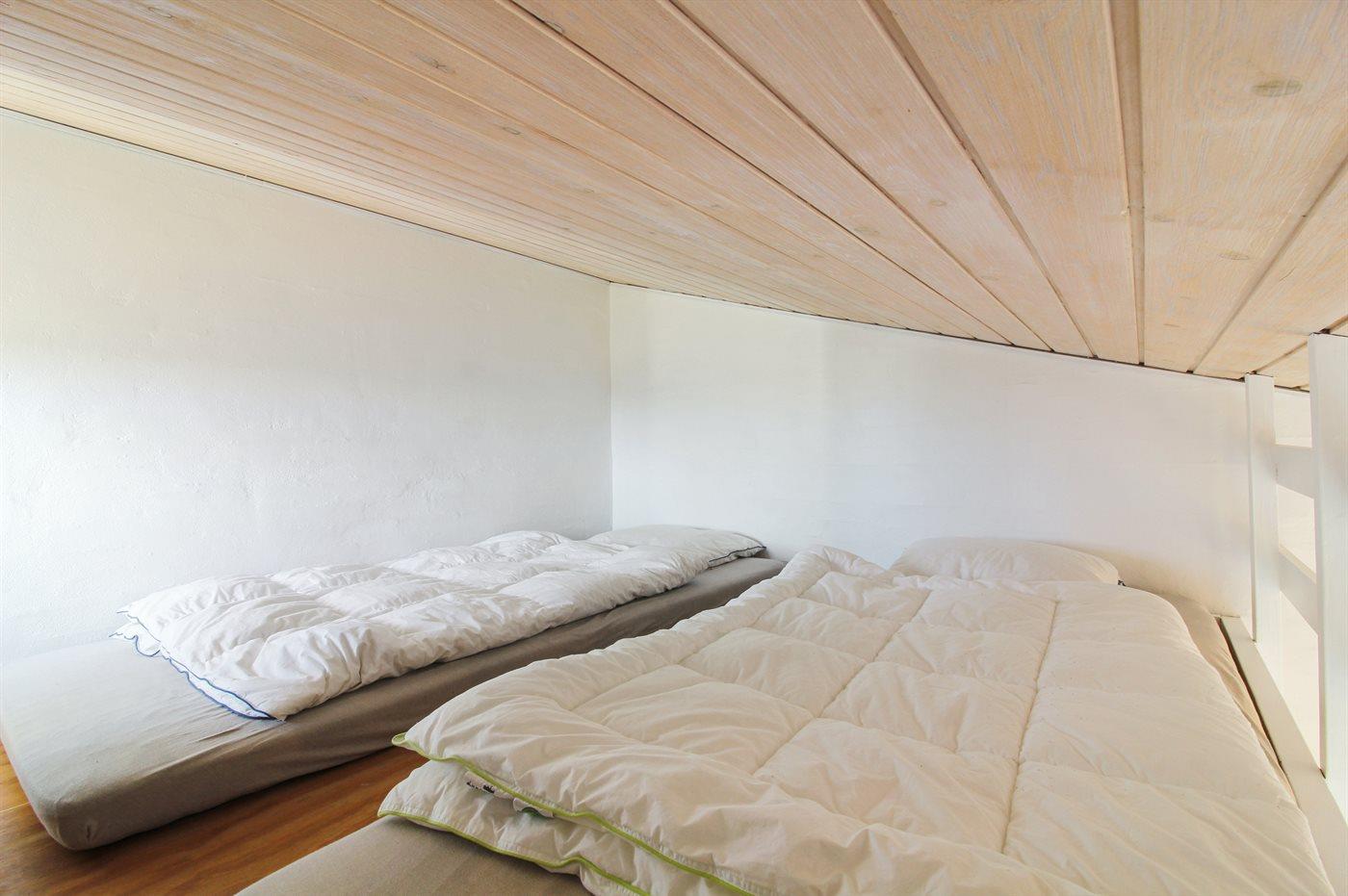 Die Schlafplätze verteilen sich auf 4 Schlafräume. 4 Schlafplätze in Doppelbetten. 2 Schlafplätze in Einzelbetten. 2 Schlafplätze in einem Etagenbett. 2 Schlafplätze auf Matratzen. 2 von diesen Schlafplätzen befinden sich im offenen Obergeschoss.