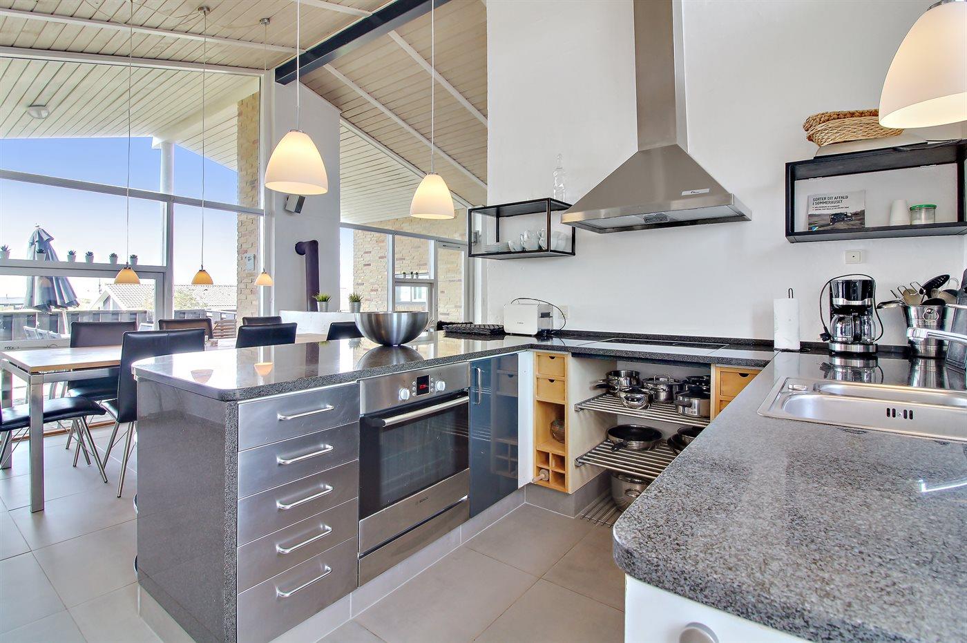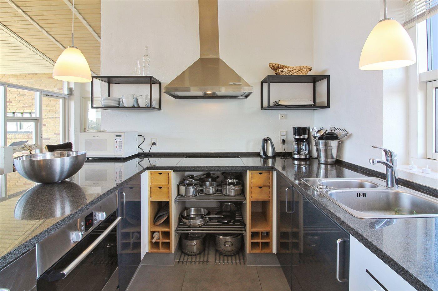 Die Küche ist mit Kühlschrank ausgestattet. Außerdem gibt es 4 Keramik-Kochfelder, Umluftofen, Mikrowelle sowie Geschirrspüler.