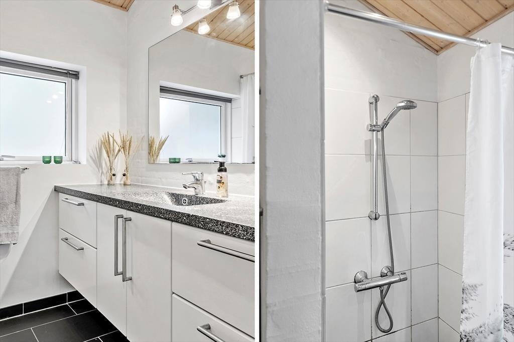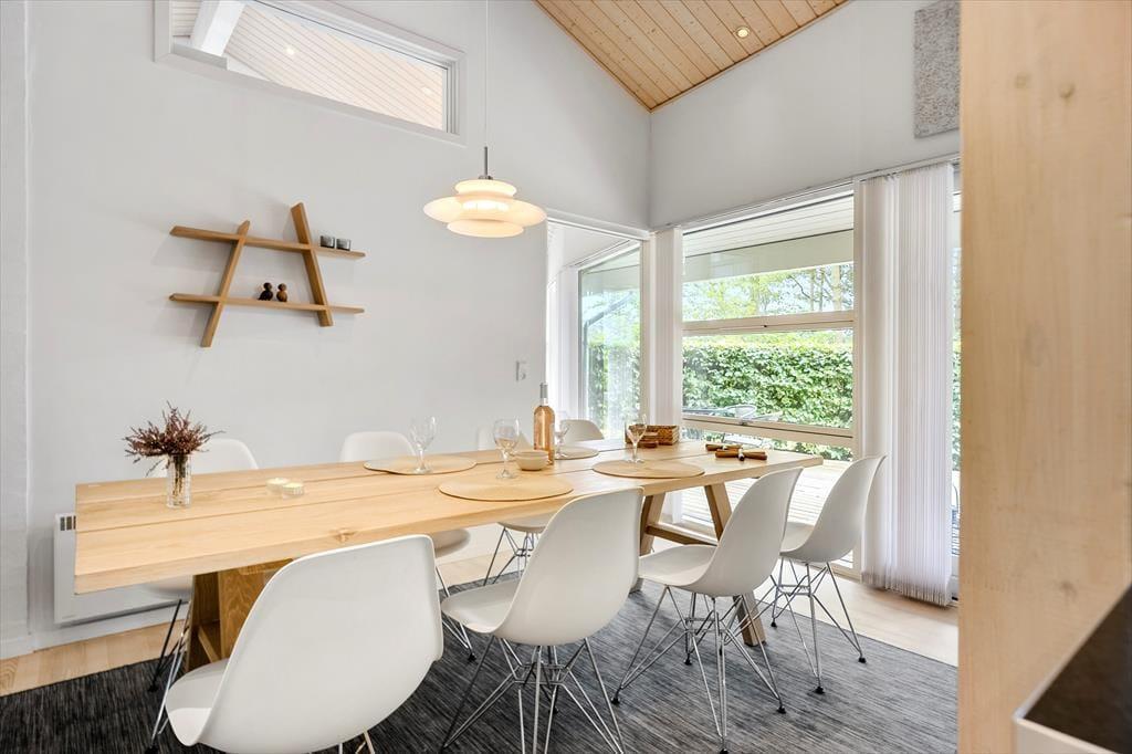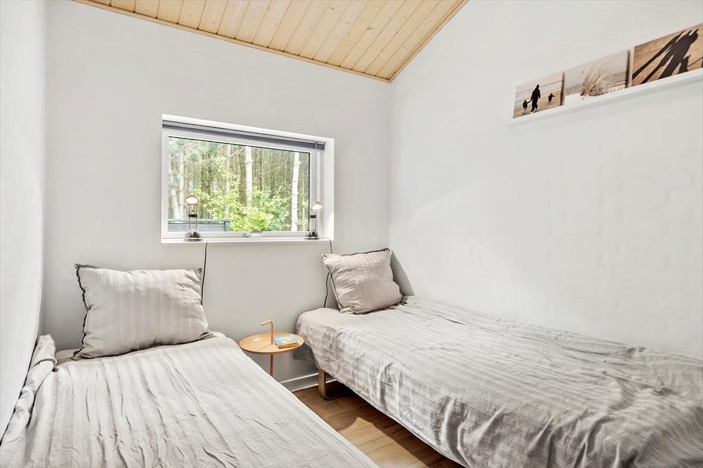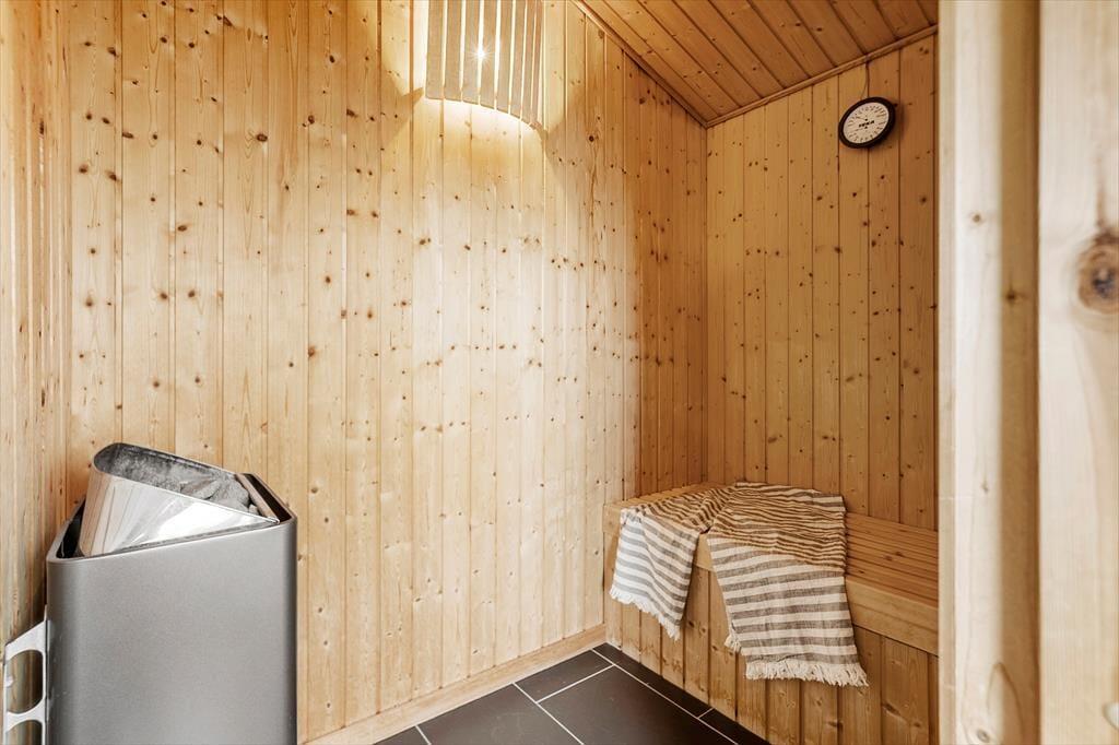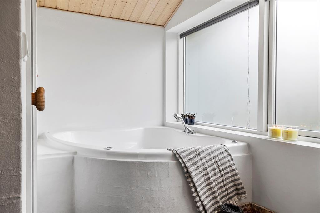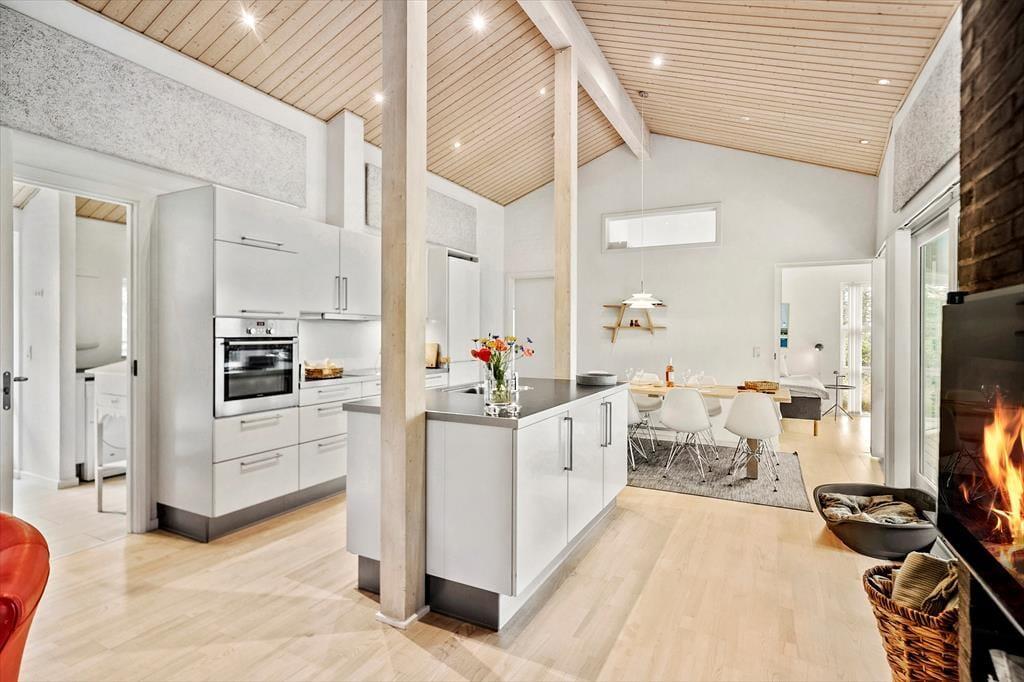 Beim Betreten dieses Sommerhauses fällt zunächst der Kamin auf, der vor der großen Fensterfront steht – hier wird in den kalten Monaten viel Wärme und Gemütlichkeit verbreitet. "Einladend" ist das Wort, das das Haus am besten beschreibt, mit Möglichkeiten, im schönen Küchen-Essbereich zu sitzen, wo man viel Zeit verbringen wird und dabei die fantastischen Panoramafenster genießen kann, die die gesamte Wand des Raums einnehmen. Das Haus ist mit allem ausgestattet, was man sich im Urlaub wünschen kann, und ist in vier Zimmer unterteilt – zwei an jedem Ende des Hauses. Es gibt zwei Badezimmer, von denen eines mit Whirlpool und Sauna ausgestattet ist, was jedem dabei helfen wird, einen wunderbaren und ungestörten Urlaub in der schönen Gegend von Grønhøj Strandpark zu genießen.