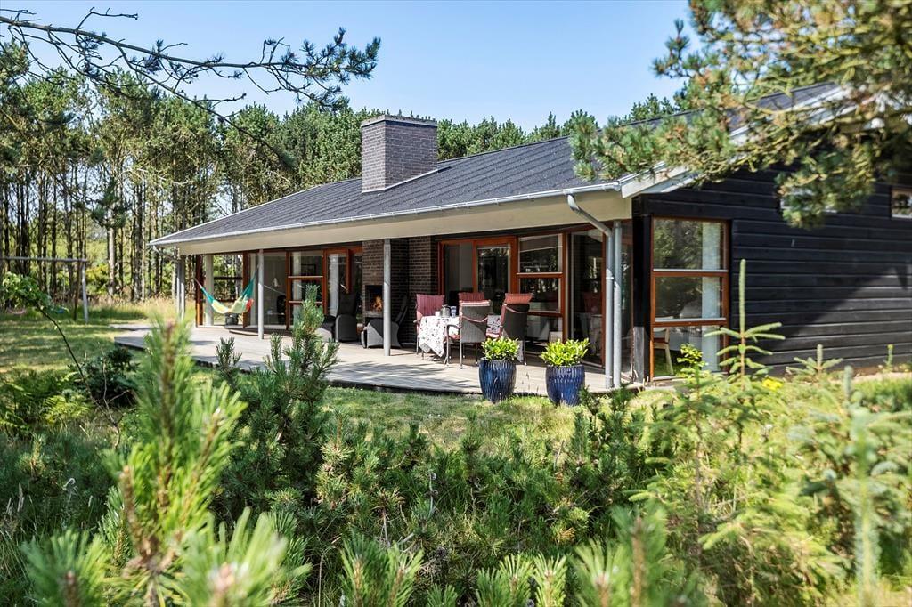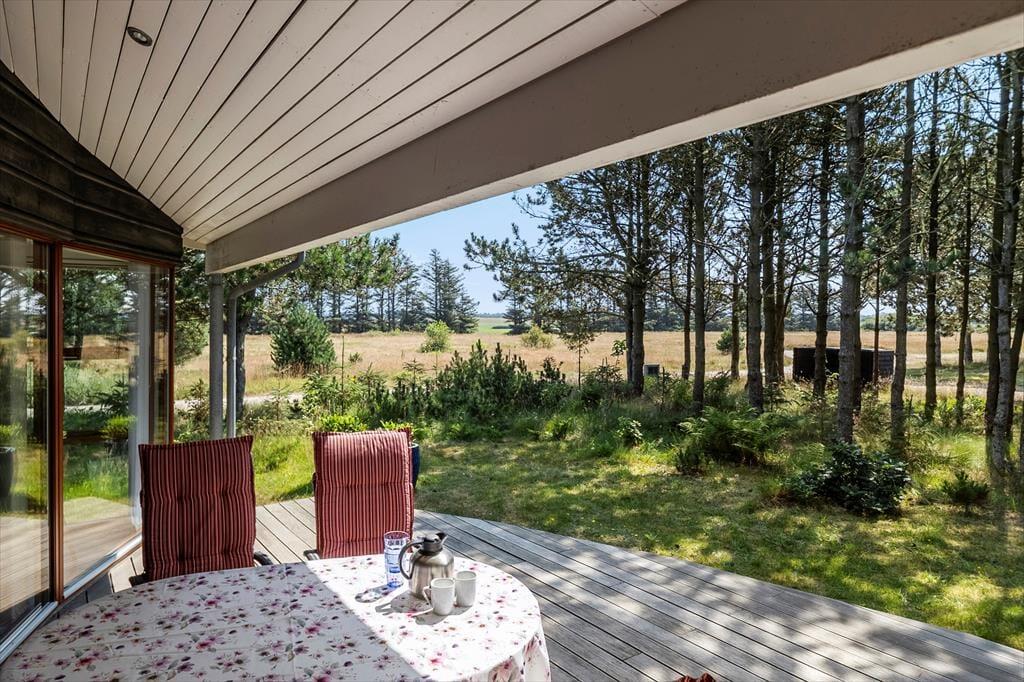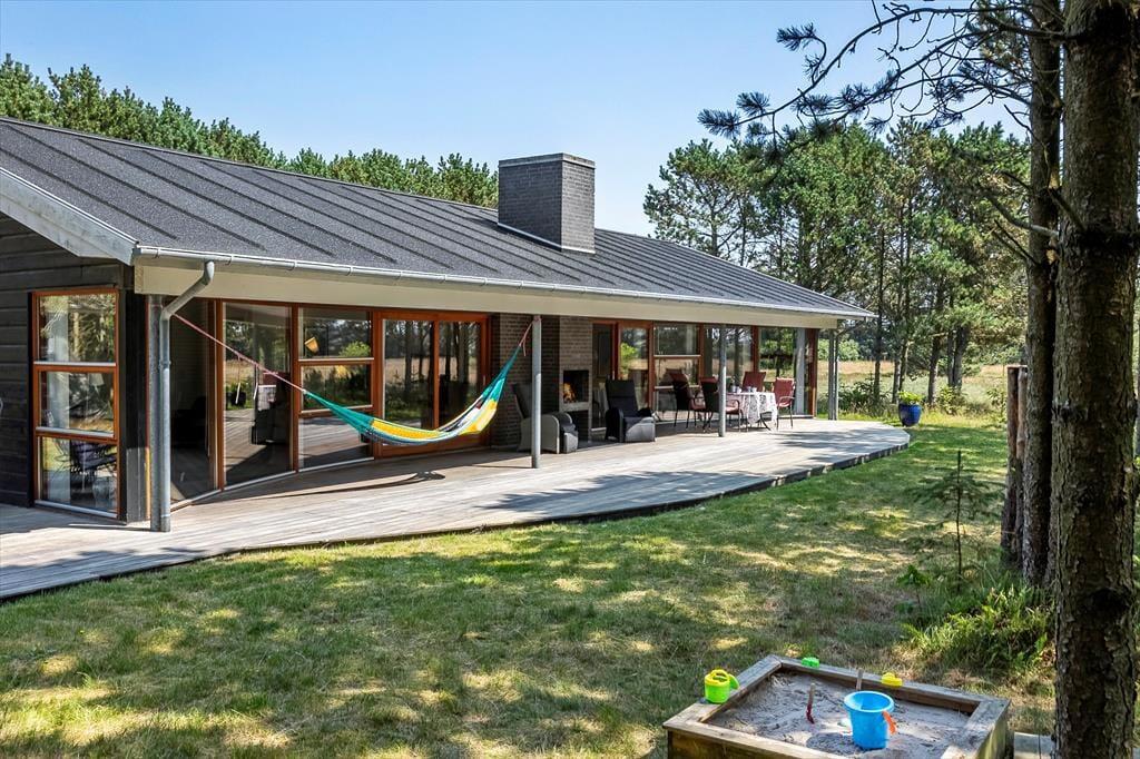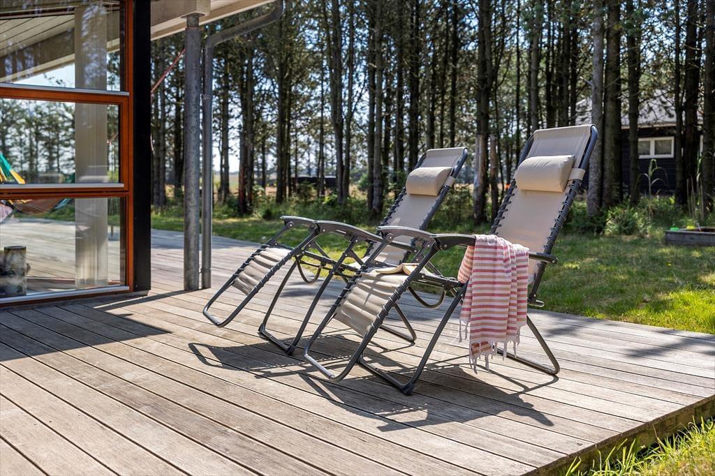 Umgeben von einem schönen, ebenen Naturgrundstück mit Bäumen rund um das Haus, bietet dies eine fantastische Möglichkeit für ein Naturerlebnis, sei es, um im Herbst Tannenzapfen zu sammeln oder im Sommer die Sonne zu genießen. Vom Wohnzimmer aus gelangt man auf eine herrliche, teilweise überdachte Terrasse nach Westen, die sich perfekt für gemütliche Grillabende eignet. Gartenmöbel, Grill und Liegestühle können von den Ferienhausgästen frei genutzt werden.