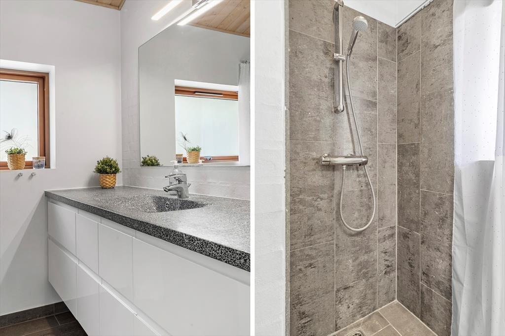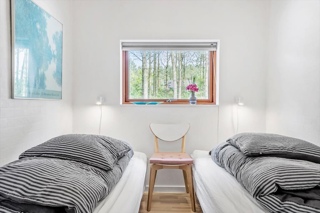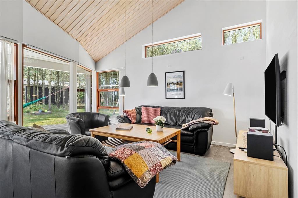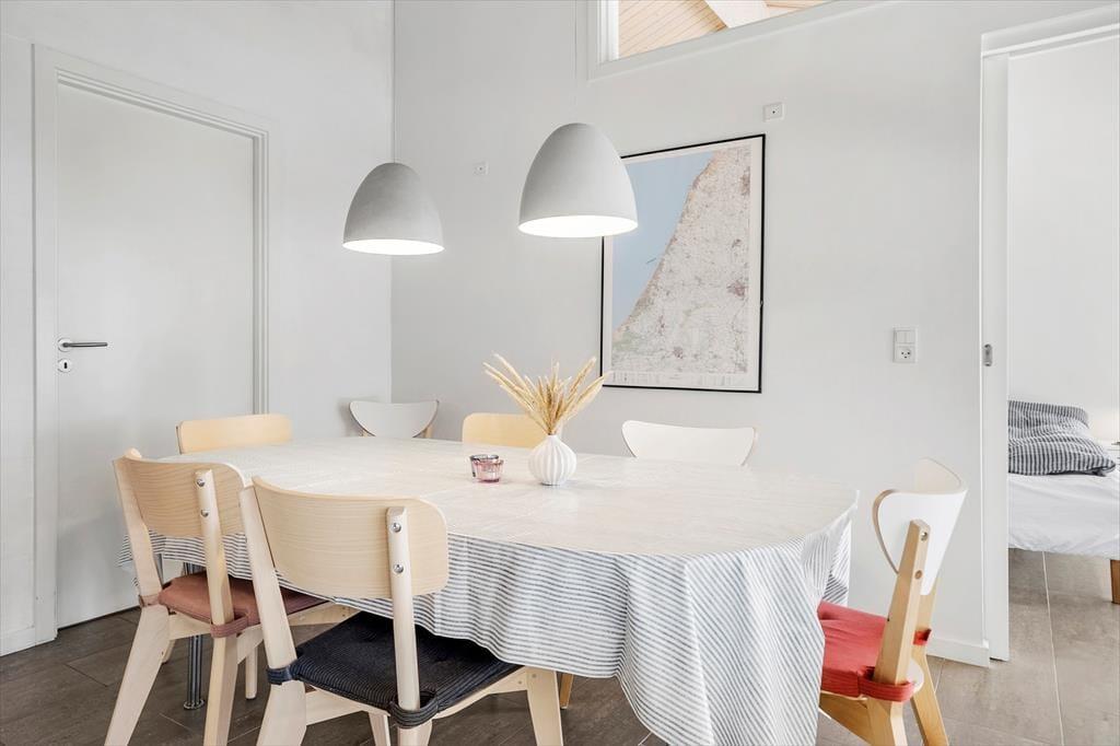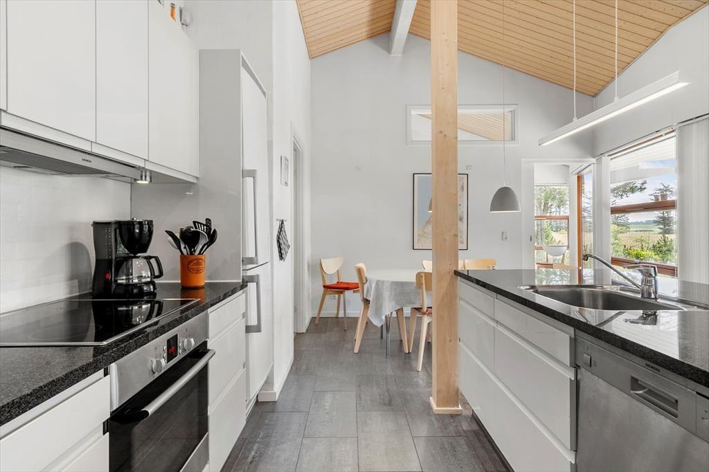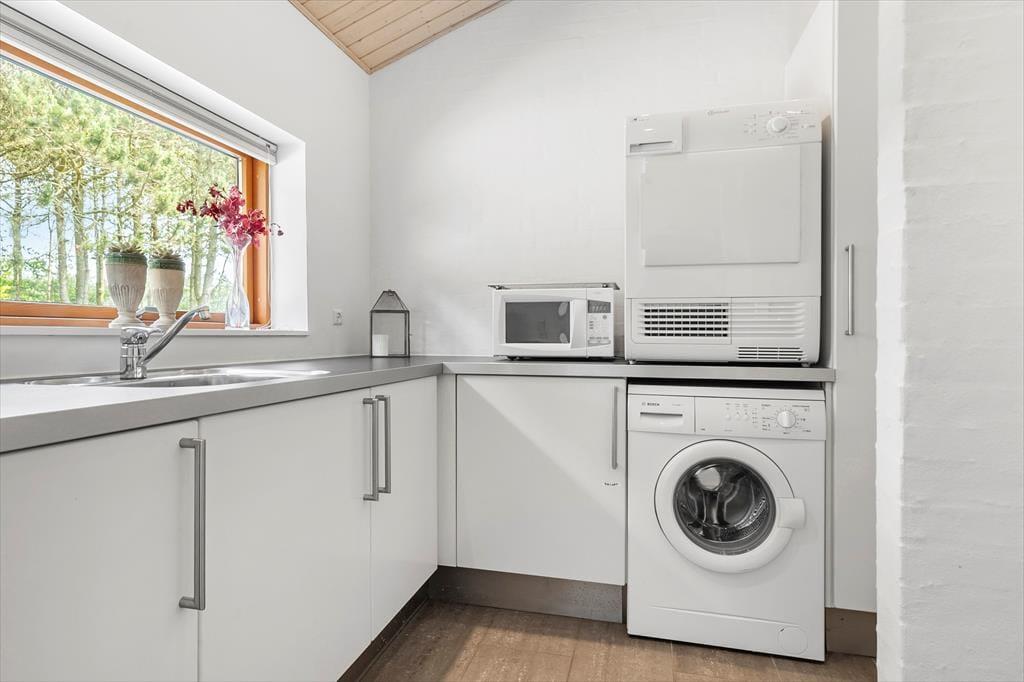 Beim Betreten dieses Ferienhauses wird einem zuerst der Kamin auffallen, der vor der großen Fensterfront steht – von hier aus wird im Winter viel Wärme und Gemütlichkeit verbreitet. Das Haus ist modern und hell eingerichtet. Die gut ausgestattete Küche ist offen mit dem Wohnzimmer und dem Essbereich verbunden. Die fantastischen Panoramafenster lassen Licht und Natur herein, sodass man die Aussicht auf die umliegende Natur genießen kann. Vom Wohnzimmer aus gelangt man in die vier Schlafzimmer des Hauses – zwei mit Doppelbetten und zwei mit Boxspringbetten. Es gibt zwei Badezimmer, eines davon ist mit einer neuen Dusche und einem luxuriösen Whirlpool ausgestattet, der auf jeden Fall dabei helfen wird, einen entspannten Urlaub in der schönen Gegend von Grønhøj Strandpark zu genießen. Außerdem gibt es eine Waschmaschine und einen Trockner, die nach den vielen Badeausflügen sicher von Nutzen sein werden.