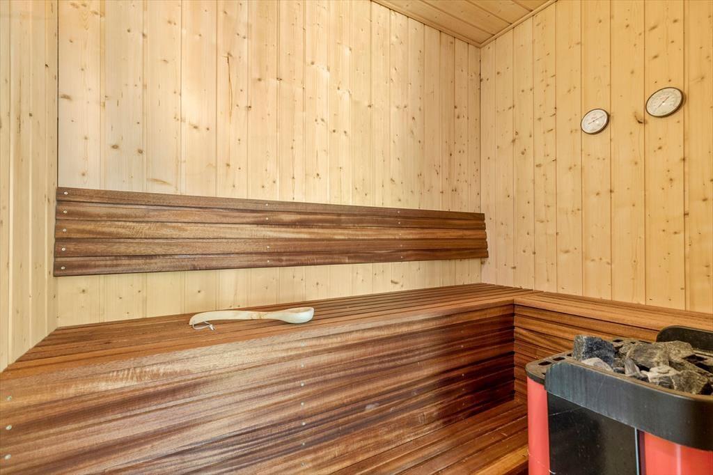 Sommerhuset rummer tre gode værelser – to med dobbeltsenge og ét med køjeseng – samt en hems med to madrasser, hvor børnene kan lave deres egen lille hule. Når dagens oplevelser er slut, kan I forkæle jer selv med en tur i spaen eller nyde varmen i saunaen. Badeværelset har også vaskemaskine og tørretumbler. Udover badeværelset er der gæstetoilet.