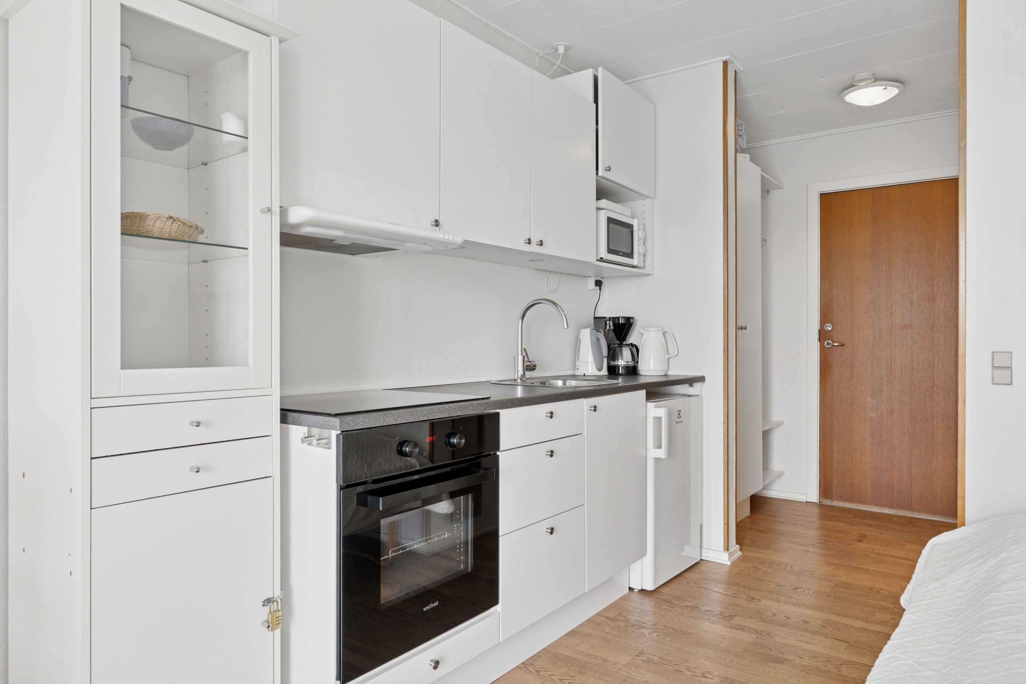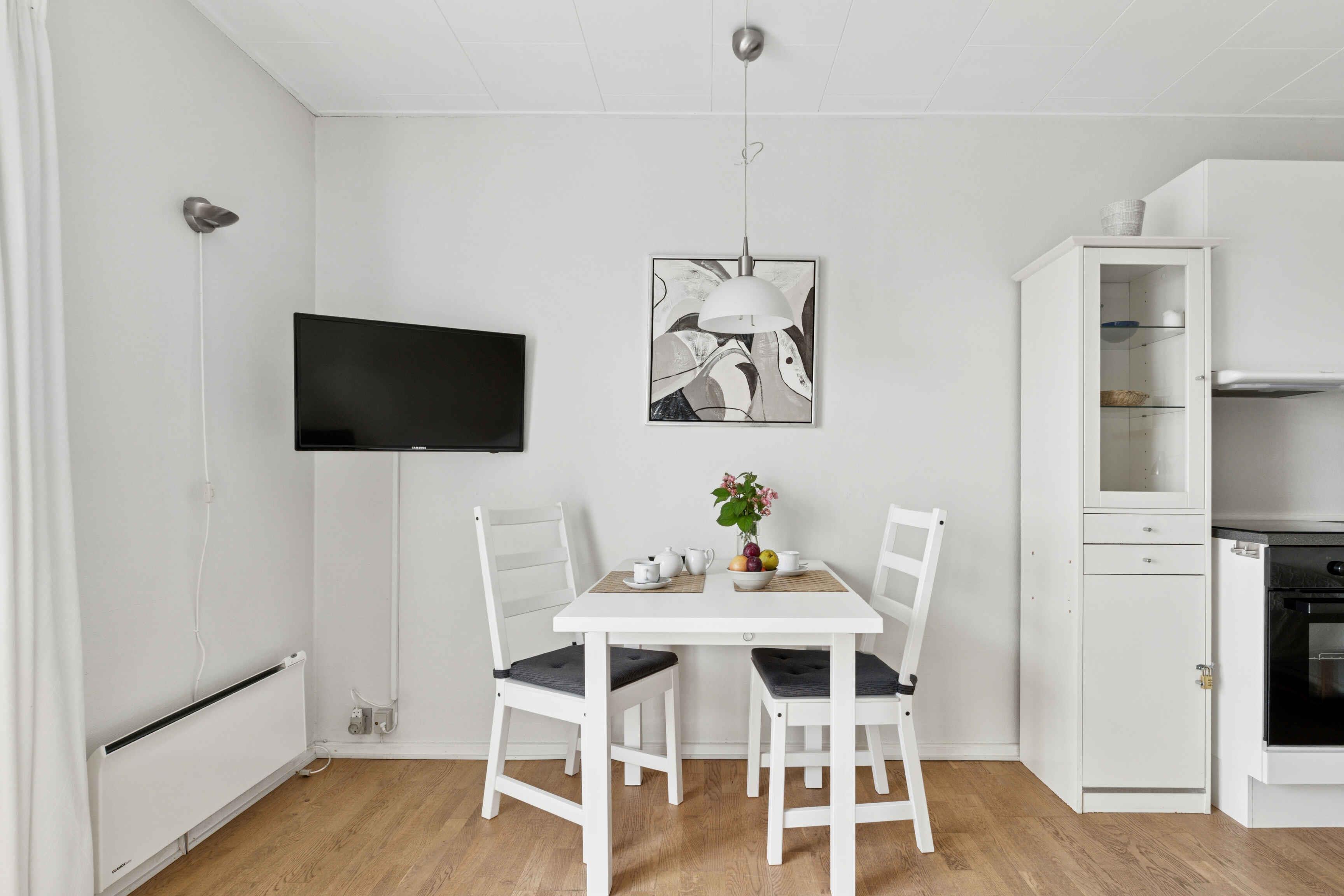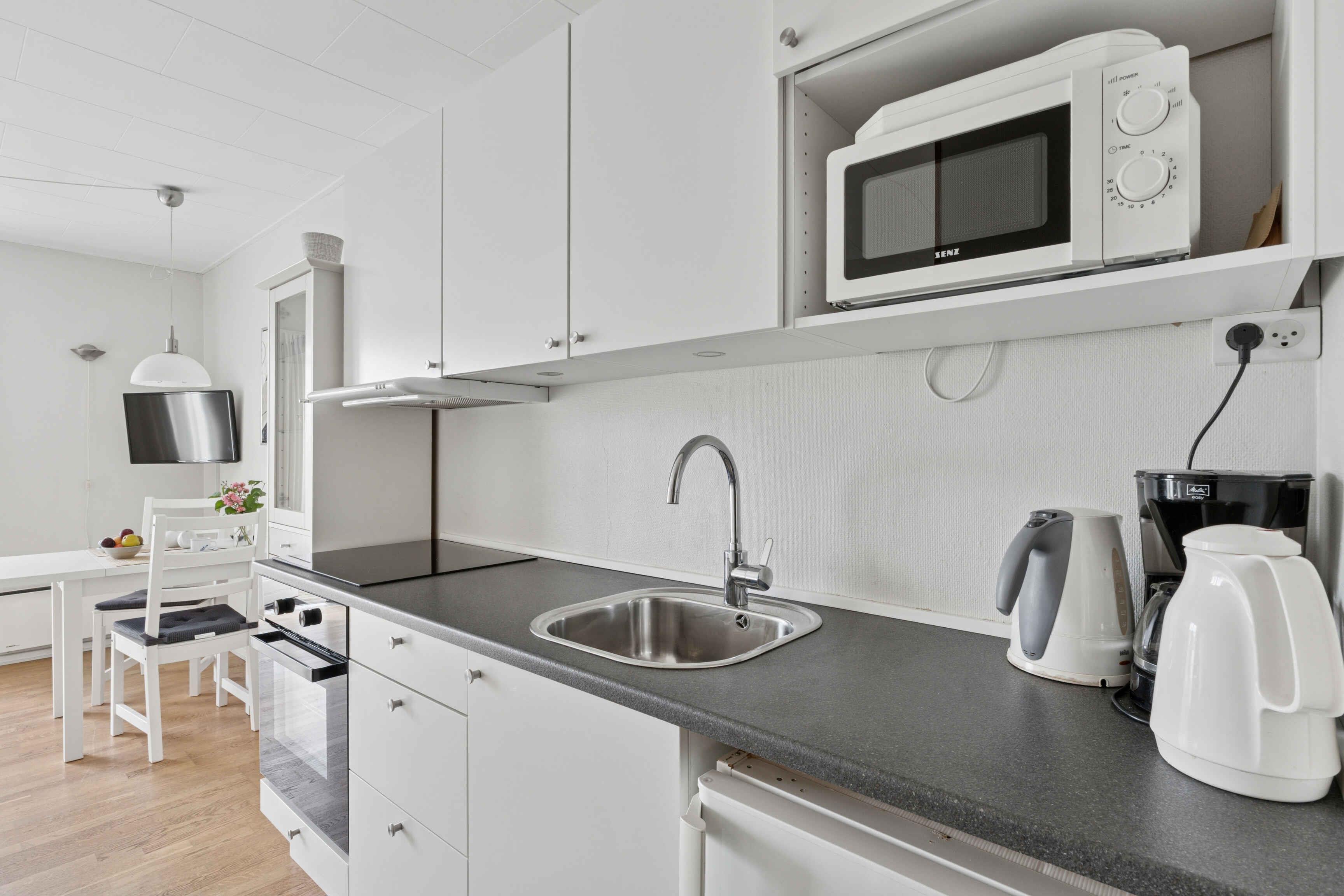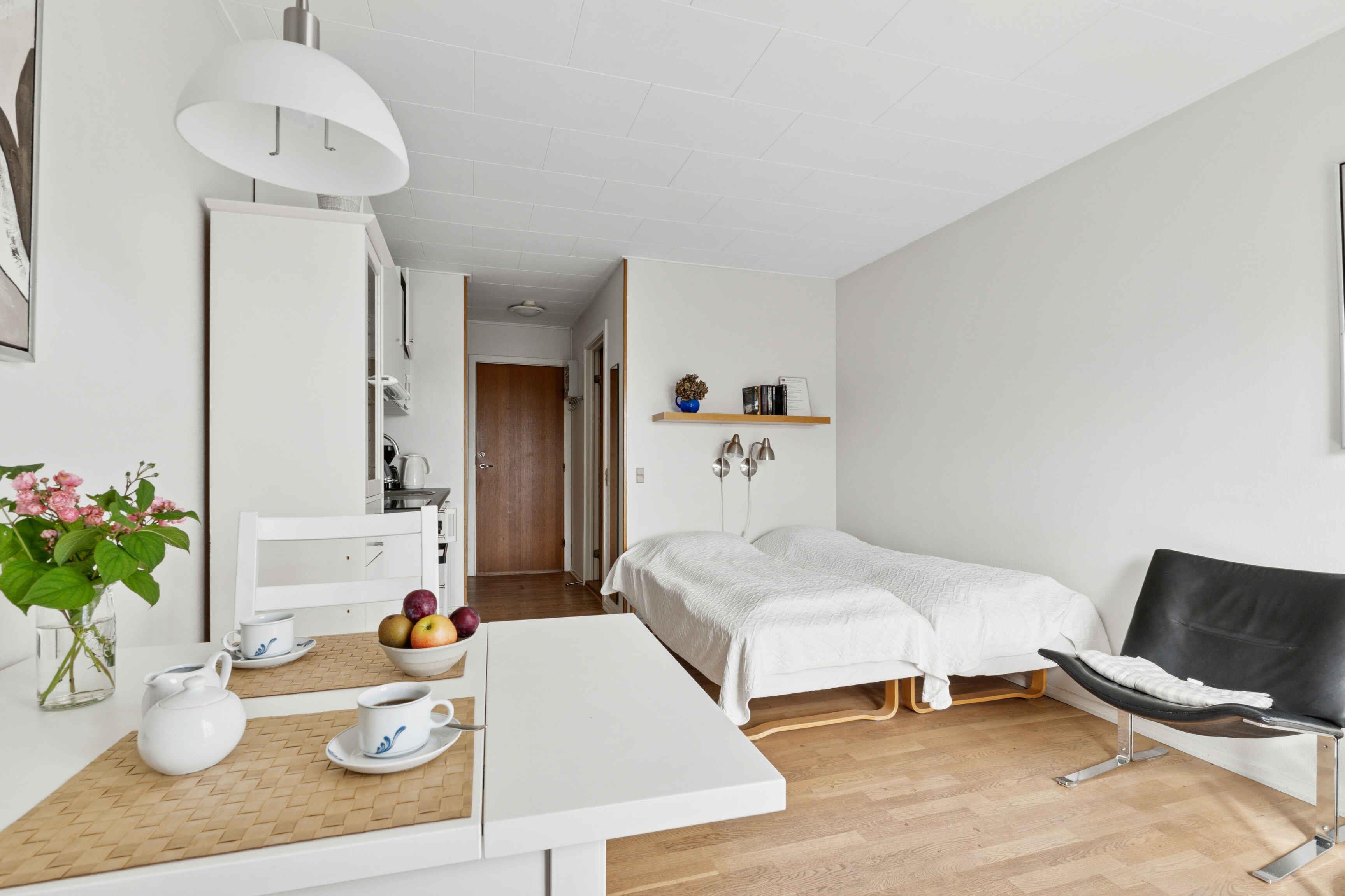 Ferienwohnung für 2 Personen – mit Meerblick in Gudhjem Dieses charmante Studio-Apartment liegt oben in Gudhjem und bietet einen wunderschönen Blick über die Stadt und die Ostsee. Einkaufsmöglichkeiten, Geschäfte, das Wasser und die Restaurants der Stadt sind bequem zu Fuß erreichbar. Die Wohnung verfügt über einen Eingangsbereich, einen kombinierten Schlaf- und Wohnraum mit TV, eine Küchenzeile sowie ein großes Badezimmer. Von der Wohnung aus gelangen Sie direkt auf Ihre eigene Terrasse mit Blick auf den großen Garten. Hier können Sie Ihren Morgenkaffee mit Meerblick bis nach Christiansø genießen oder den Abend in Ruhe bei einem wunderschönen Sonnenuntergang ausklingen lassen. Die Wohnung befindet sich im Erdgeschoss, im nördlichen Nebengebäude der schönen Pension Koch. Parkplätze stehen auf dem Grundstück zur Verfügung und in wenigen Minuten zu Fuß erreichen Sie den Supermarkt für den täglichen Einkauf. Die Lage ist ideal für Spaziergänge, ohne dass Sie das Auto benutzen müssen. Gudhjem gilt als Dänemarks einzige „Bergstadt“, und die kleinen Straßen mit Geschäften und Restaurants liegen in unmittelbarer Gehweite. Außerdem können Sie zum Wasser hinuntergehen, entlang der Klippen bis zum Hafen von Melsted, wo Sie ein erfrischendes Bad in der Ostsee nehmen können. In der Villa Koch haben Sie die Möglichkeit, Frühstück dazuzubuchen, damit Sie entspannt und ganz unkompliziert in den Tag starten können.