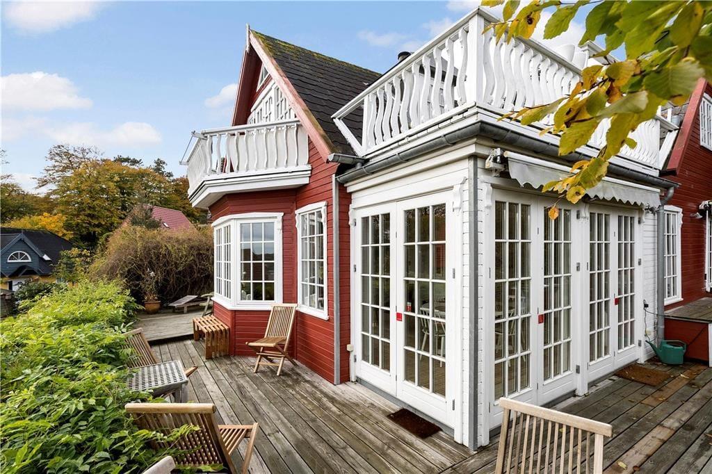 Dieses Urlaubsdomizil liegt auf einer kleinen Anhöhe, an einer kleinen ruhigen Straße. Es strahlt Dank seiner rot gestrichenen Holzfassade, den weißen Sprossenfenstern, den schönen Giebeln und den Holzornamenten nur so vor Charme. Wir reden hier von einem Haus mit Seele. Das Hausinnere ist unglaublich hell und die Aussicht durch die zahlreichen Fenster ist atemberaubend. Dies macht sich besonders im schönen Wohnzimmer mit Kaminofen bemerkbar, von wo Sie auch direkten Zugang zur sonnigen Terrasse genießen. Die Küche im Landhausstil entspricht vollkommen dem idyllischen Ambiente. Sämtliche Renovierungsarbeiten wurden mit Respekt für den ursprünglichen Stil des Hauses vorgenommen. Im ersten Stock erwarten Sie gemütliche schräge Wände. Hier oben können Sie sich auf eine Aussicht freuen, die, wenn überhaupt möglich, noch beeindruckender ist.