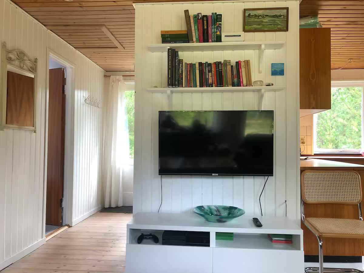 Gemütliches Ferienhaus auf großem Naturgrundstück, 800 m vom Kattegat. 5 Betten + Etagenbetten, Wohnzimmer mit Holzofen und offener Küche. Überdachte Terrasse mit Waldblick und 4 Fahrräder. Nahe Natur und Spielplätze. Rauchfrei, keine Tiere.