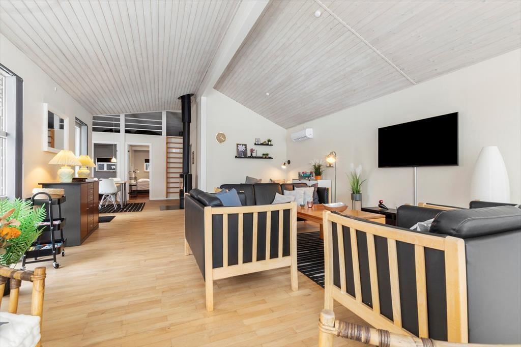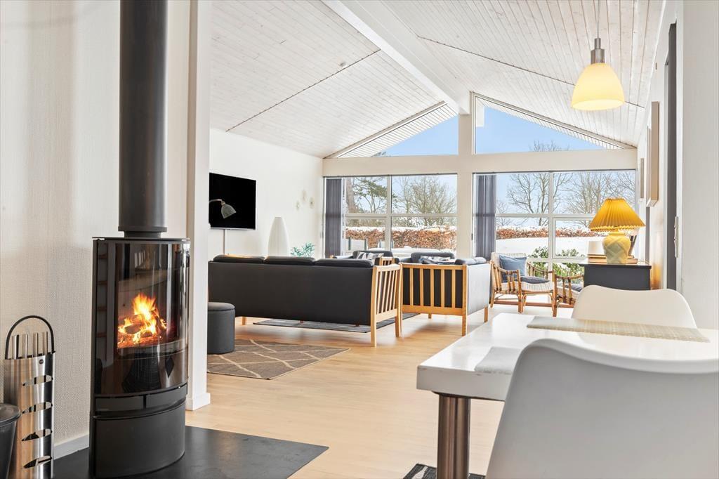 Mit einer schönen Aussicht über die Ebeltoft Vig und mit einer Entfernung von nur 100 Metern bis zu einem ansprechenden Badestrand, bietet dir dein Ferienhaus alles, was das Herz begehrt. Das Haus empfängt dich mit einer schönen offenen Küche, die moderne Annehmlichkeiten wie einen Geschirrspüler beinhaltet. An die Küche schließt ein gemütlicher Essplatz vor dem Kaminofen, der an kühlen Abenden mit behaglicher Wärme verwöhnt. Eines der beiden Badezimmer lädt nach einem langen, erlebnisreichen Tag mit seinem Whirlpool und einer Sauna zu traumhaft erholsamen Momenten voller Wellnessflair ein. Das zweite Badezimmer beinhaltet eine praktische Duschnische. Die drei komfortablen Schlafräume, die jeweils mit einem Doppelbett ausgestattet sind, bieten Platz für deine gesamte Familie. Unterhaltung und Abwechslung verspricht der Fernseher, der skandinavische und deutsche Sender empfängt.