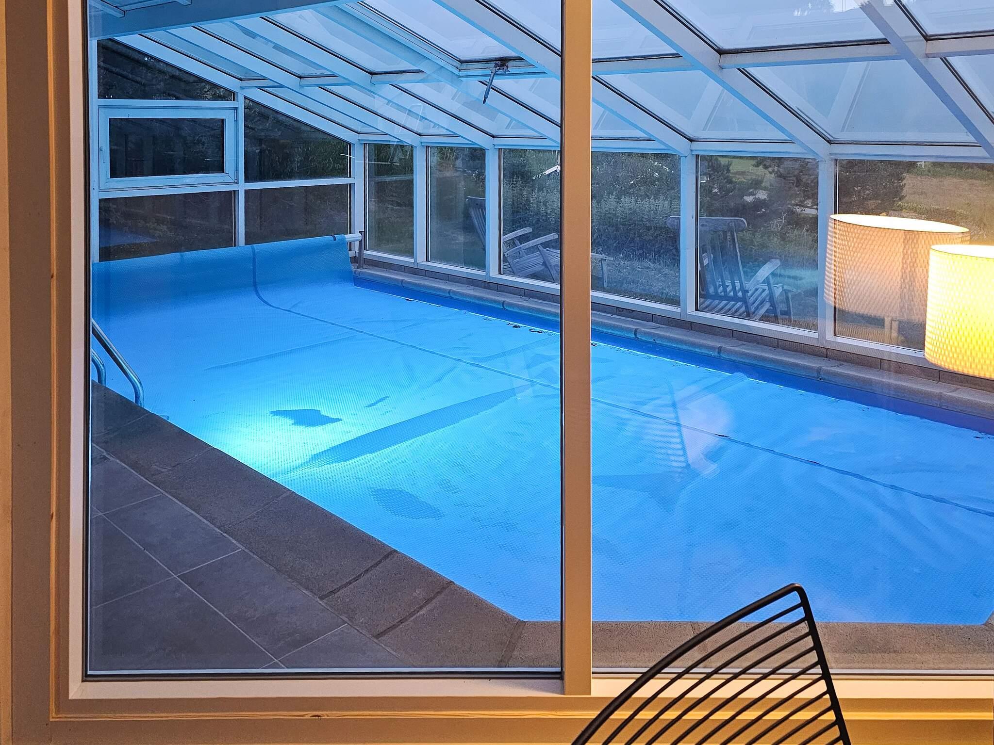 Der Pool des Hauses ist 18 m² groß und wird mittels einer energieeffizienten Wärmepumpe aufgeheizt. Er befindet sich im hellen Poolbereich, von dem aus ein Badezimmer und die Sauna zu erreichen sind. Lassen Sie sich auf einer Luftmatratze auf dem Wasser des Pools treiben und genießen Sie dabei die herrliche Panoramaaussicht.