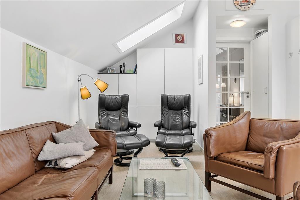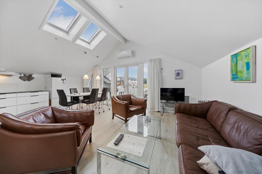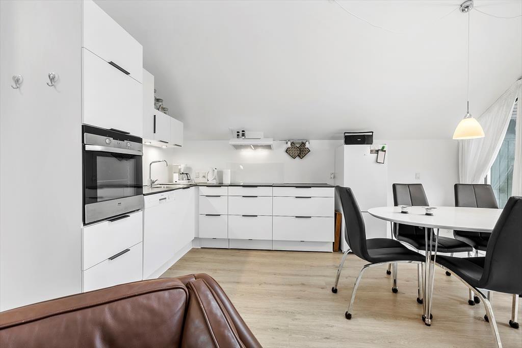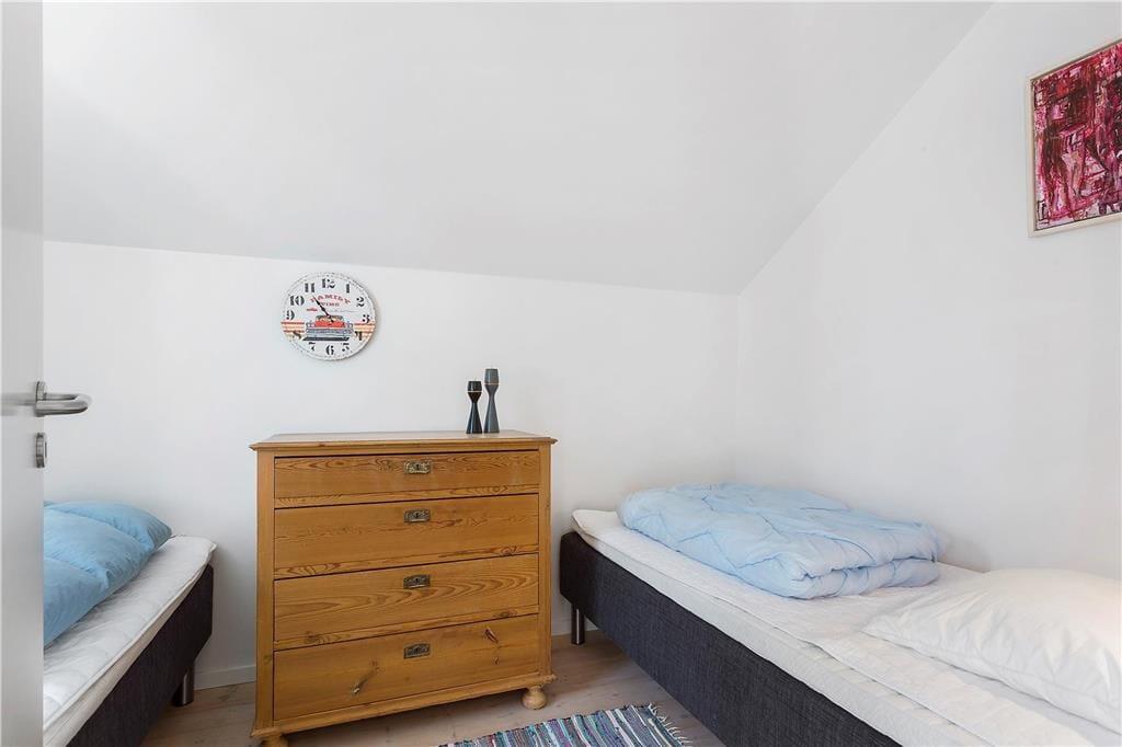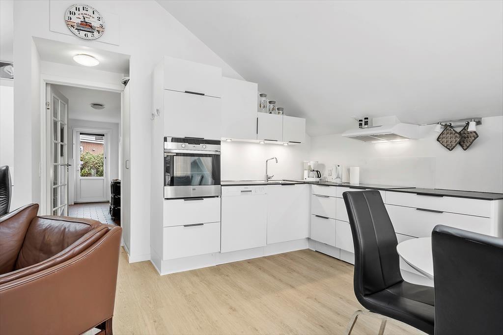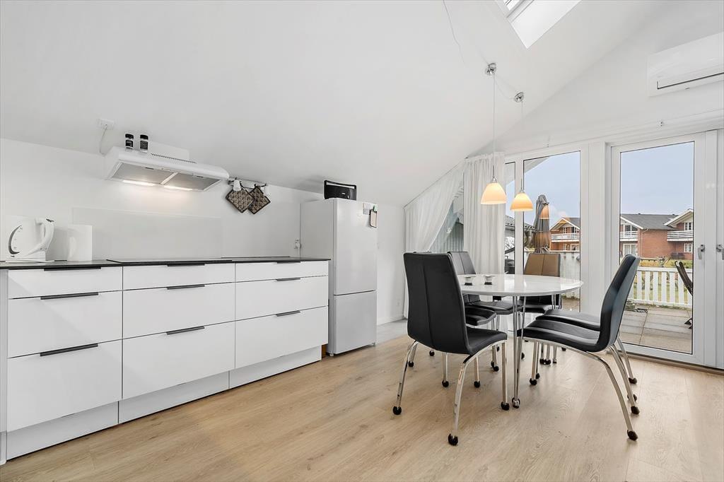 Das Ferienhaus ist genauer gesagt ein Reihenhaus, das 2013 liebevoll renoviert wurde. Dank der erfolgreichen Modernisierung präsentieren sich alle Zimmer auf einladende Weise mit schönen Möbeln und gemütlichen Details. Im Wohnzimmer, dem größten Raum des Hauses, ist das Licht sehr gut, denn hier gibt es ein großes Fenster nach Westen und ein Oberlicht. In den Raum ist eine moderne Küche integriert, die zusätzlich mit einem Esstisch und mehreren bequemen Sitzmöbeln ausgestattet ist. Der Grundriss besteht auch aus zwei Schlafzimmern und einem Badezimmer mit Dusche und Waschmaschine.