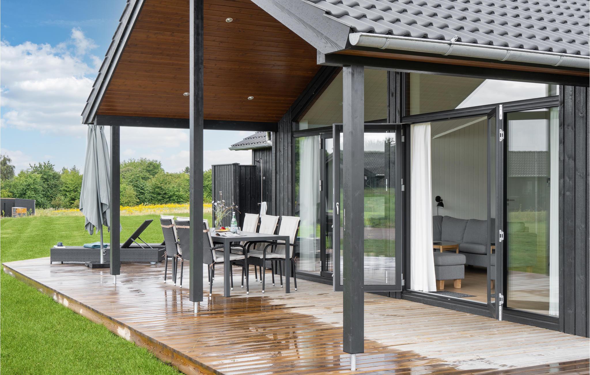 Nehmen Sie auf der Terrasse ein Sonnenbad in bequemen Liegestühlen und lassen Sie den Blick weit über die Landschaft schweifen. Später versammeln Sie die ganze Familie am Esstisch im Freien und bereiten leckere Gerichte auf dem Grill zu - so werden die langen Sommerabende zum Genuss.
