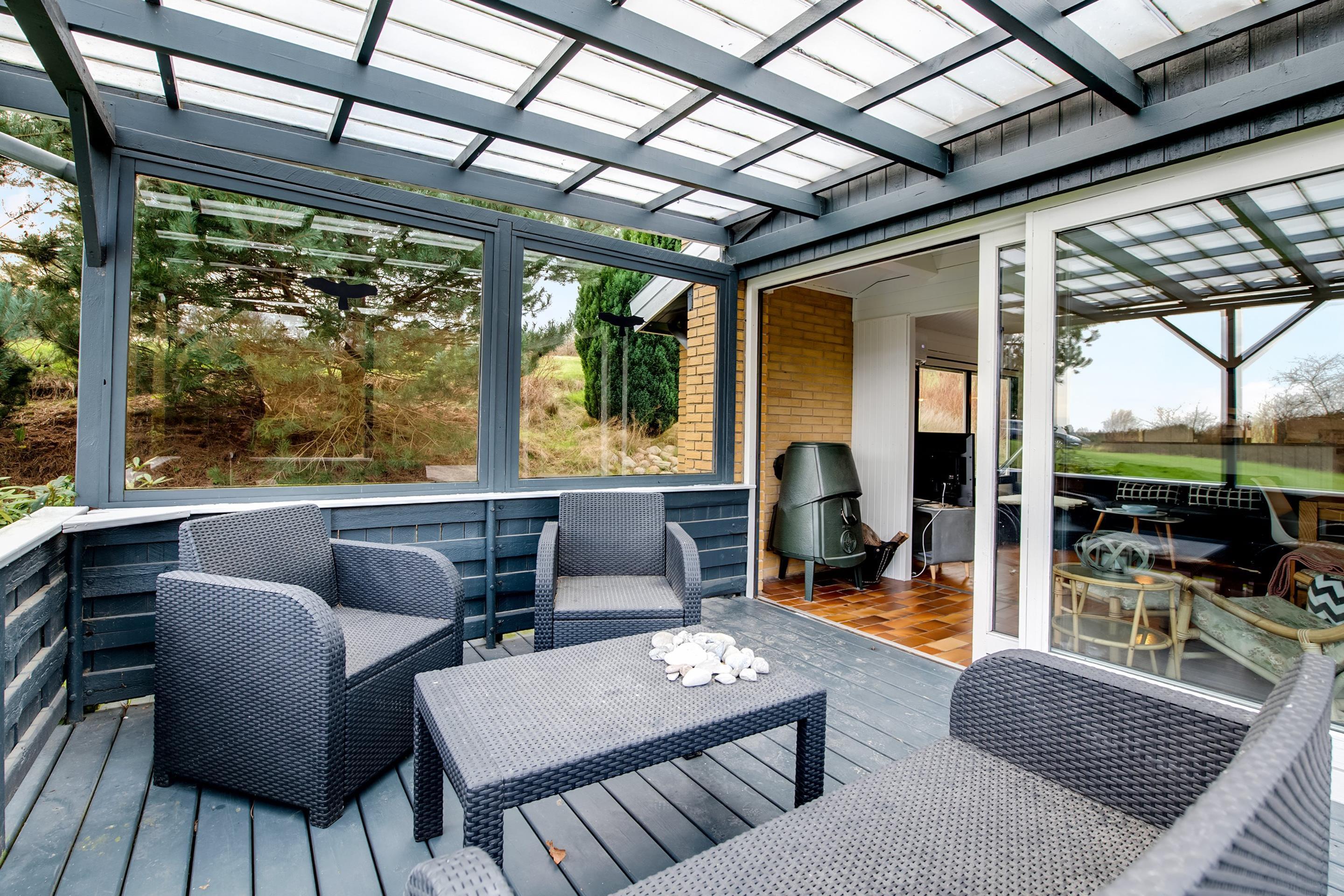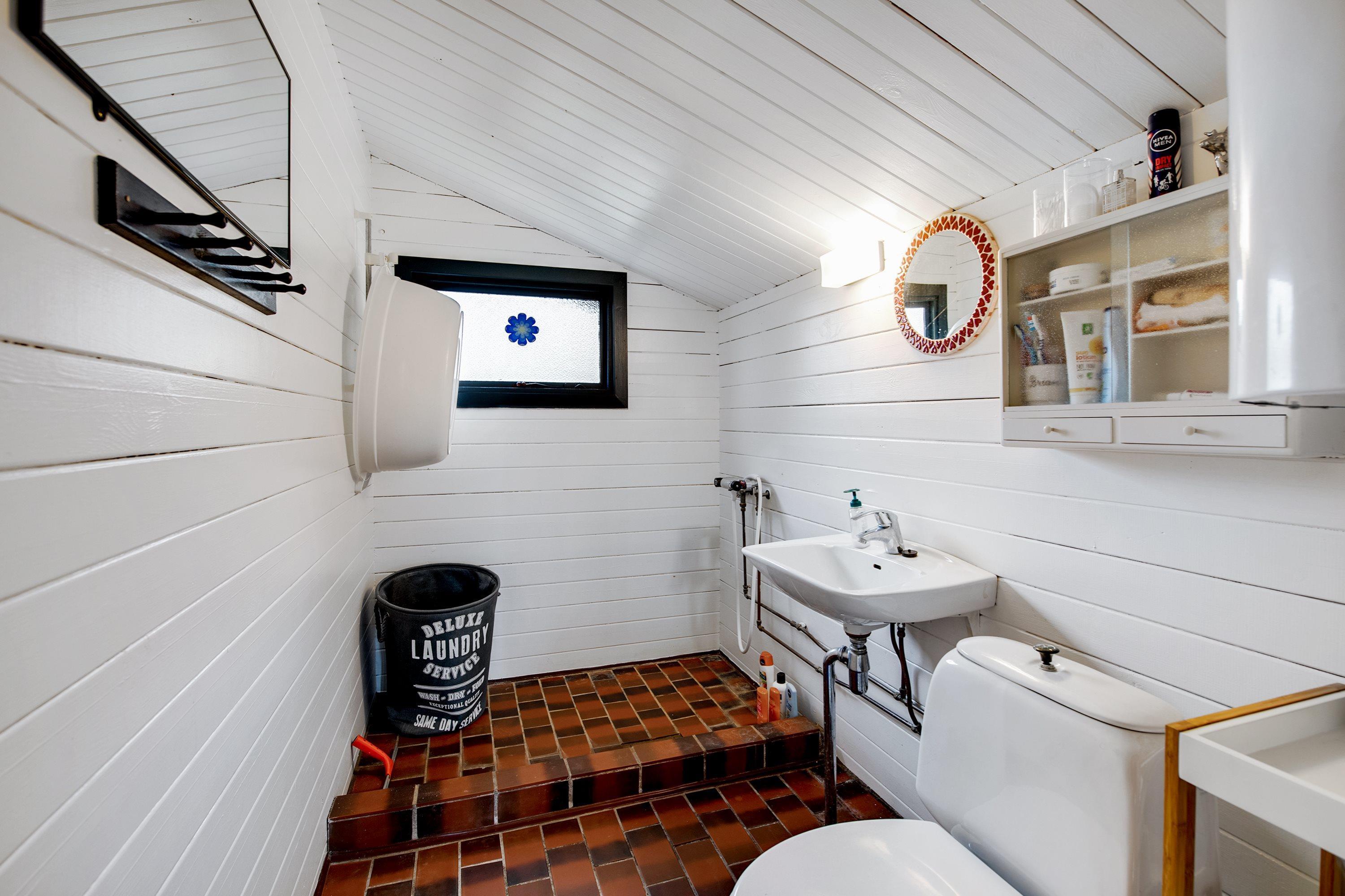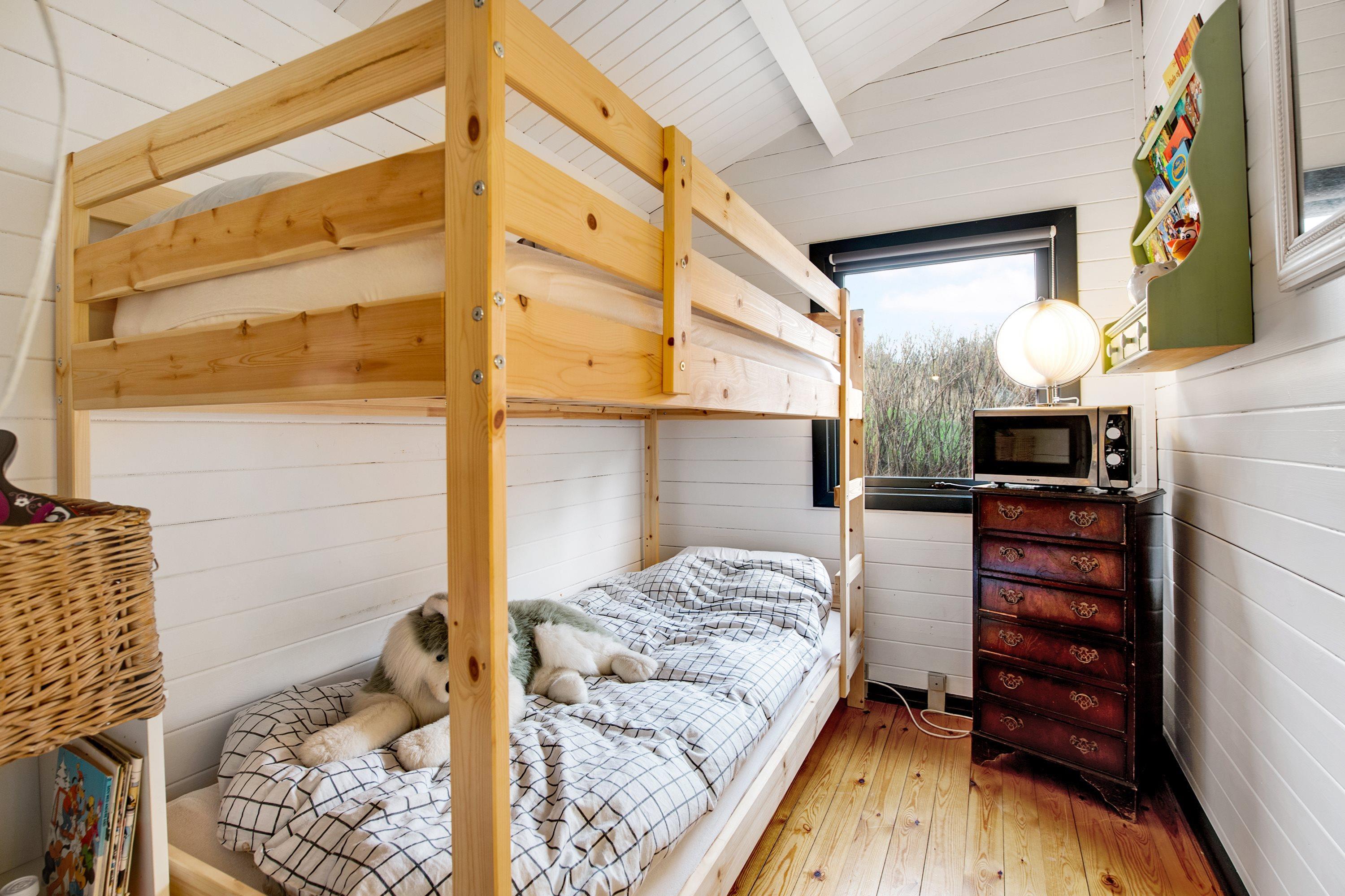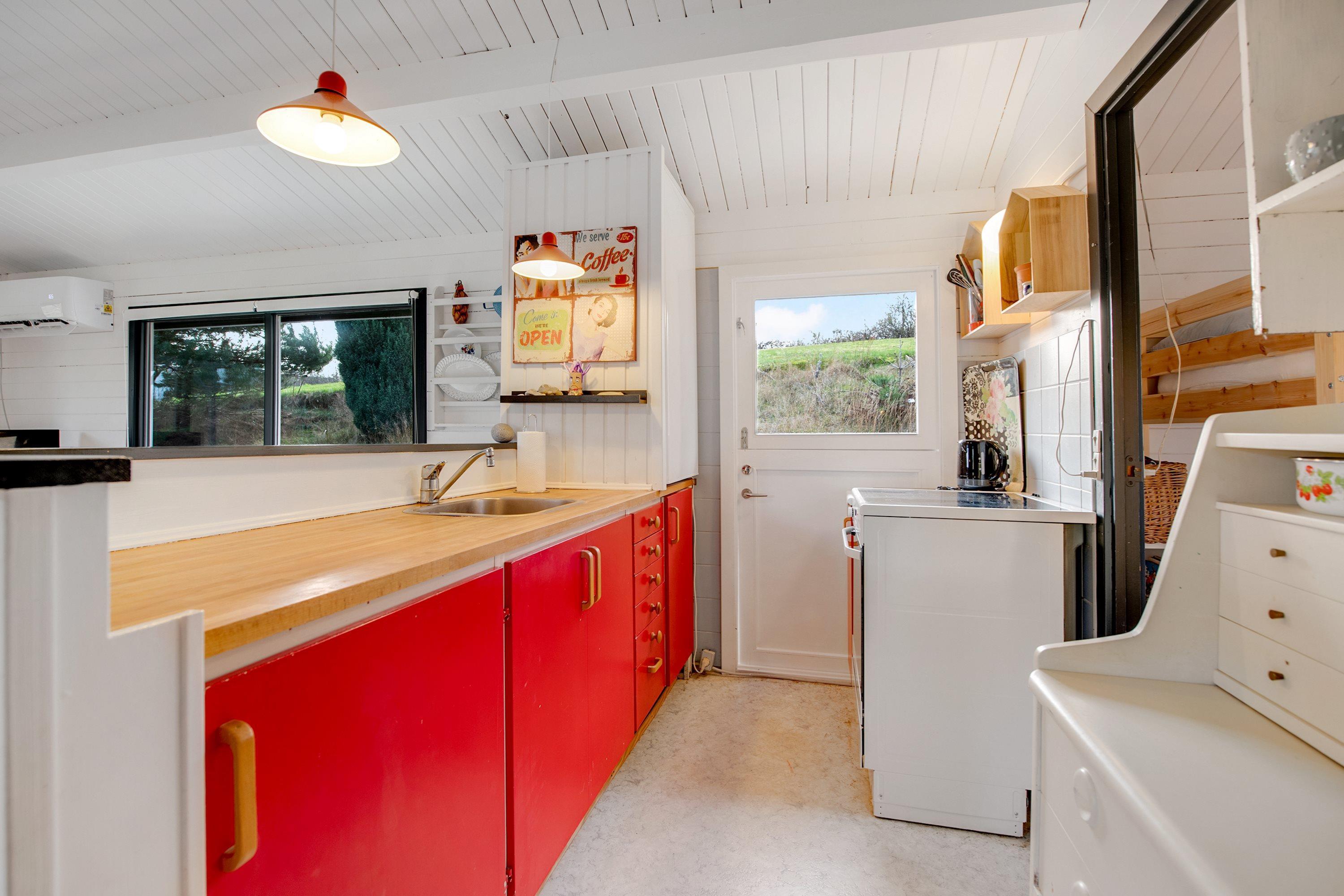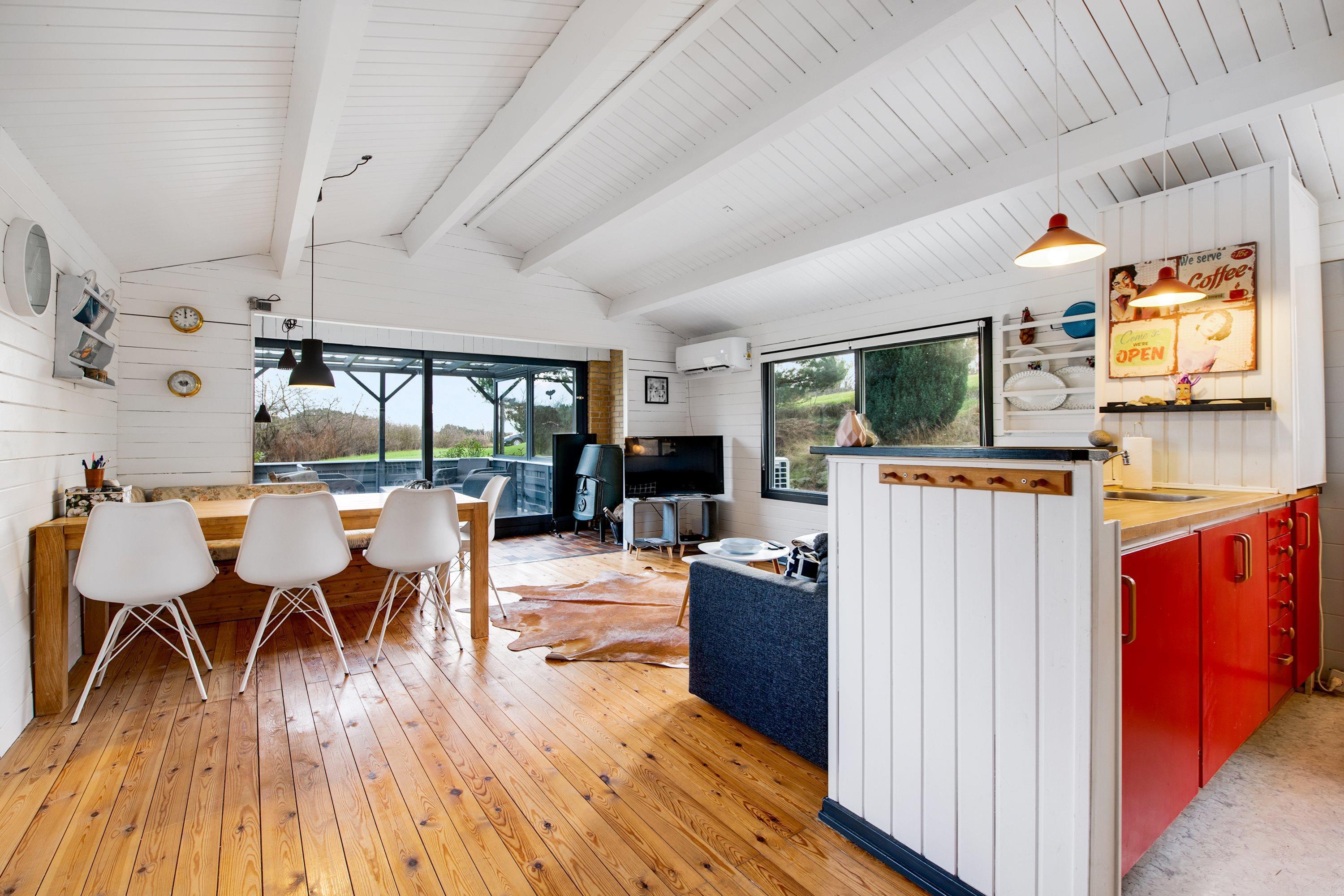 Das gemütliche und gut möblierte Wohnzimmer mit Ausgang auf die überdachte Terrasse präsentiert sich wie der Rest des Hauses hell und freundlich mit weiß gestrichenen Wänden und bis zum Dachfirst offener Bauweise. Es ist mit Essplatz für sechs Personen, Kaminofen, schöner Sitzecke und TV mit Dänische kostenlose Kanäle. In offener Verbindung dazu liegt die kleine, aber funktionelle Küche mit Glaskeramikherd und Kühlschrank. Die insgesamt sechs Schlafplätze verteilen sich auf ein Schlafzimmer mit Doppelbett, ein Zimmer mit Etagenbett sowie ein großes Nebengebäude mit Doppelbett und eigenem WC. Im Haupthaus hat eine Wärmepumpe und es befindet sich ein helles und praktisch eingerichtetes Badezimmer mit Dusche und Babywanne. Auch im Nebengebäude ist eine Wärmepumpe. Internetzugang.