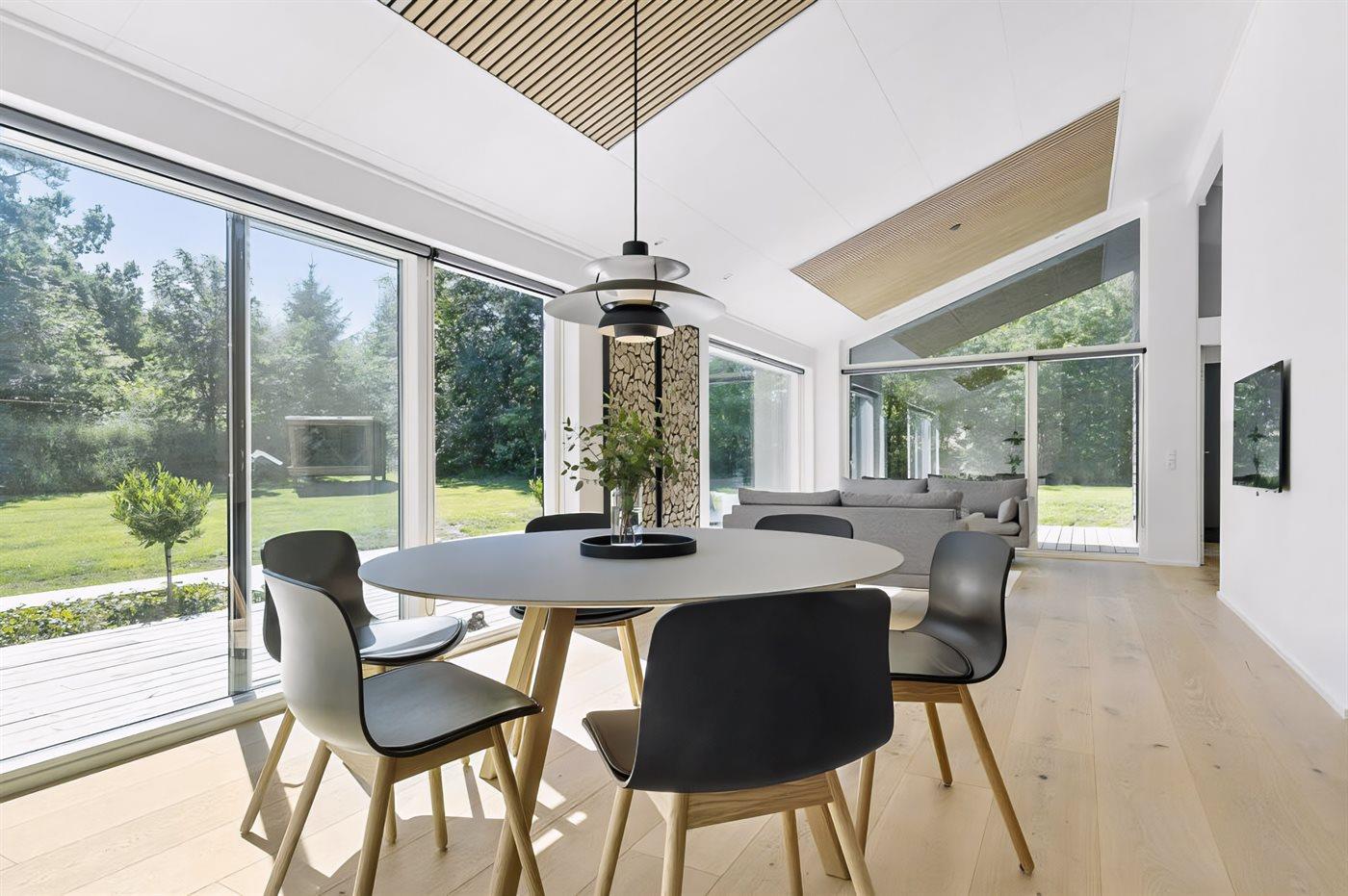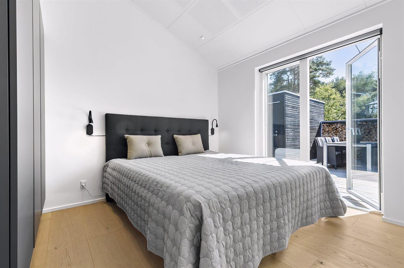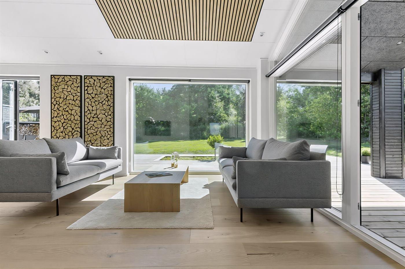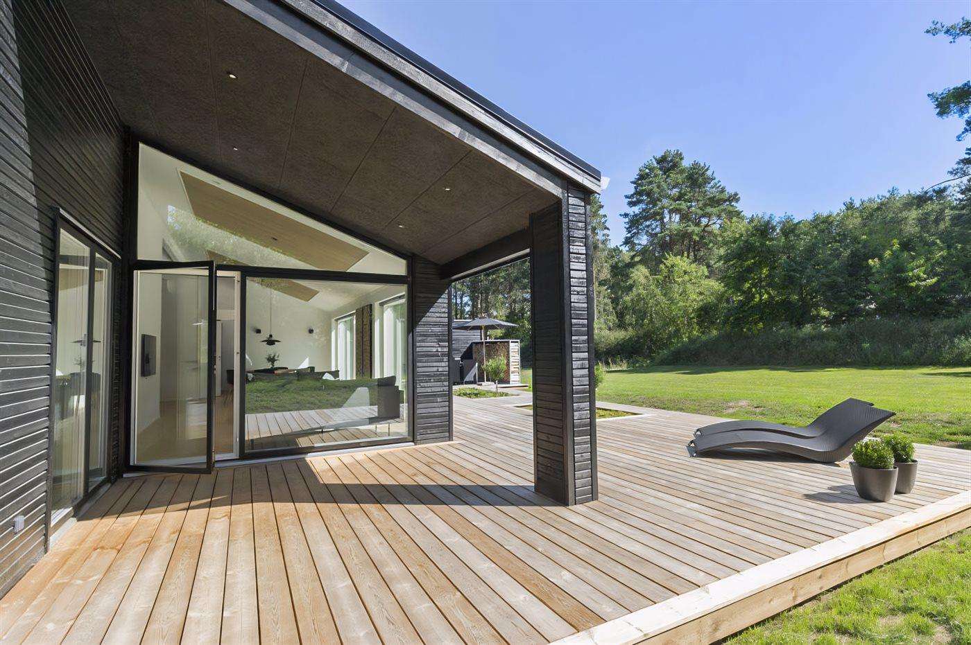 Vom Wohnbereich aus hast du Zugang zur großzügigen Terrasse, auf der sich die Urlaubstage ganz selbstverständlich nach draußen verlagern. Hier kannst du die erste Kaffee am Morgen genießen, während der Blick über die Landschaft bis hin zum Meer in der Bucht ”Aarhus Bugt” schweift.