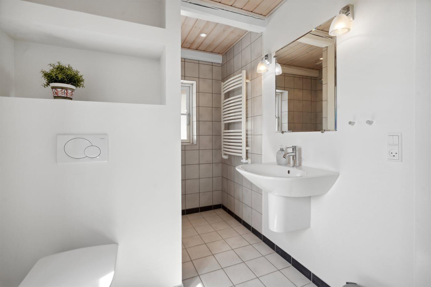 Es gibt 1 Badezimmer mit Duschnische und 2 Toiletten, davon 1 Gästetoilette. Fußbodenheizung in 1 Badezimmer.