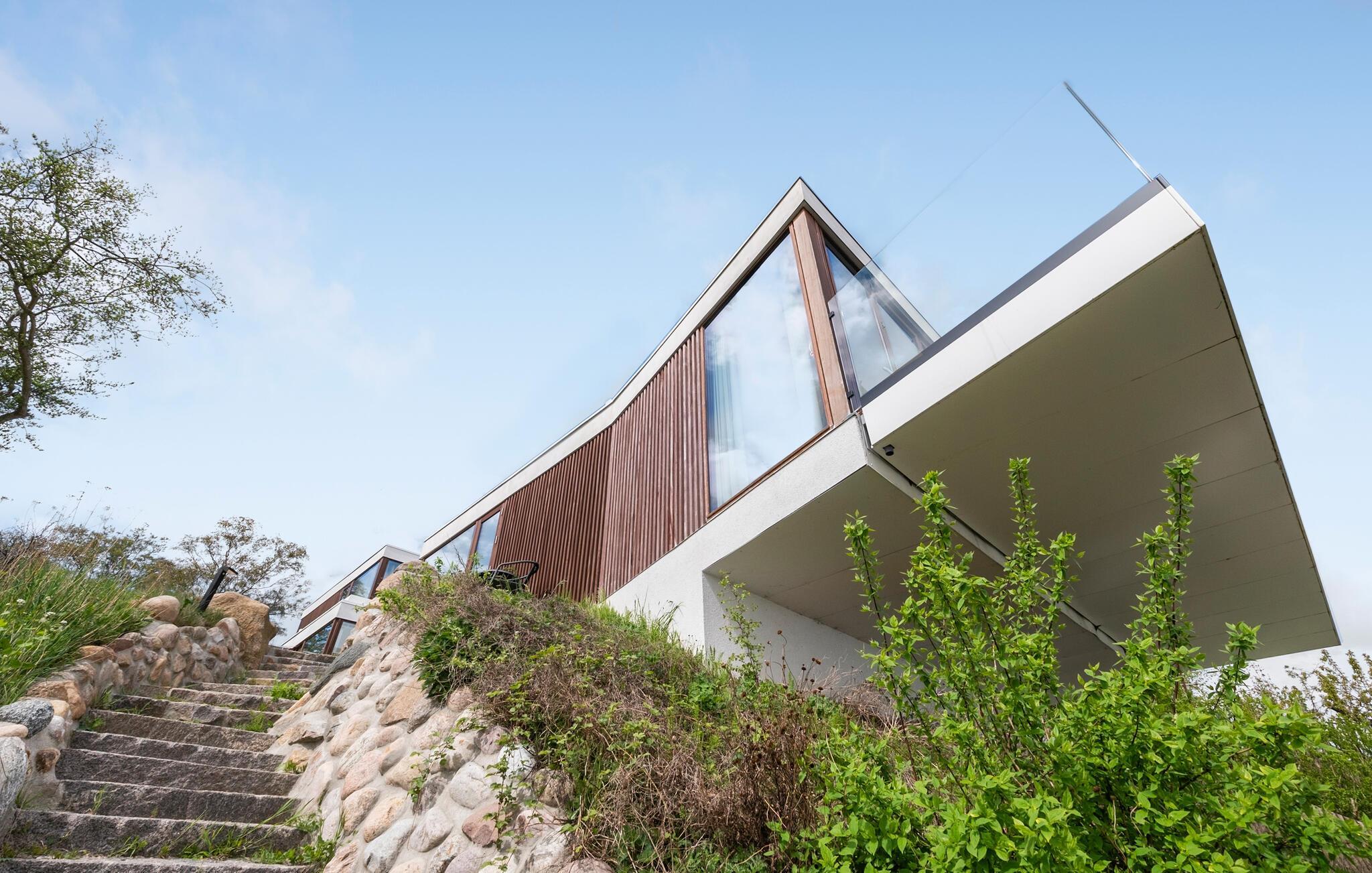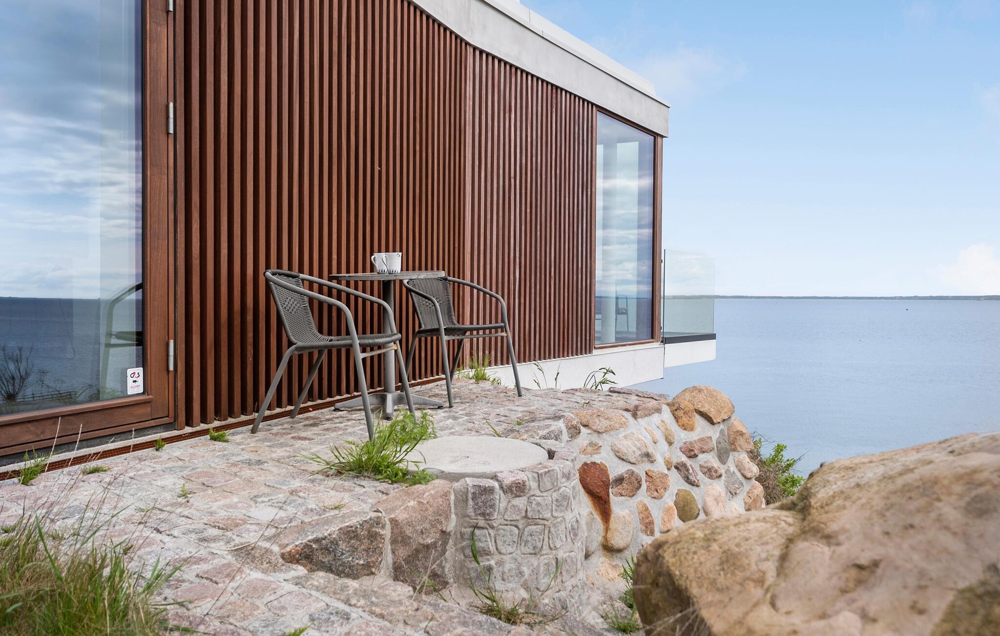 Treten Sie hinaus auf die großzügige Holzterrasse mit Glasbrüstung, lassen Sie den Blick über das Meer schweifen oder beobachten Sie die Umgebung durch das Teleskop. Setzen Sie sich in den geschützten Gartenbereich oder nehmen Sie Ihre Mahlzeiten auf der Rundterrasse mit direktem Zugang vom Wohnzimmer ein. Sonnenliegen, moderne Sitzgruppen und viel Grün sorgen für ein harmonisches Outdoor-Erlebnis.