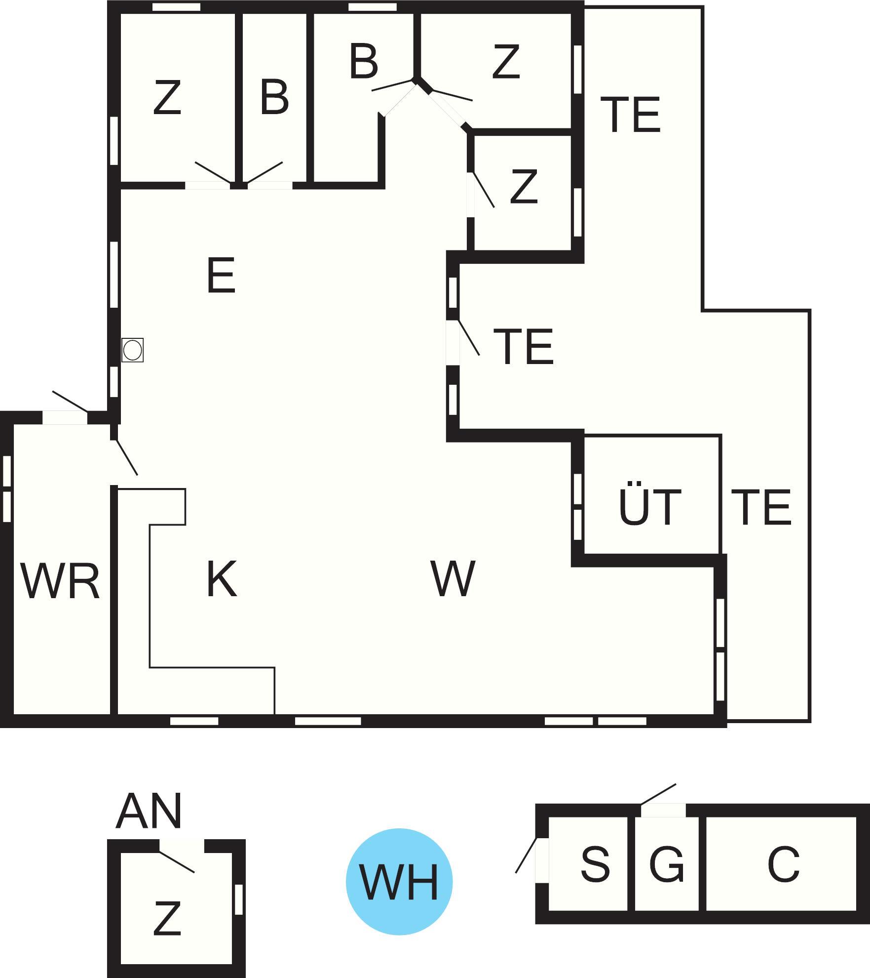 Das Ferienhaus verfügt über eine praktische Gästetoilette und ein Badezimmer mit Doppeldusche. Darüber hinaus gibt es einen großen Hauswirtschaftsraum mit Waschmaschine und Wäschetrockner. Es stehen auch drei Schlafzimmer bereit: zwei davon mit jeweils einem Doppelbett, das dritte mit zwei Einzelbetten. Zudem kleinerer Annex nebenan auf dem Grundstück mit zwei weiteren Schlafplätzen in einem Etagenbett für Sommergäste.