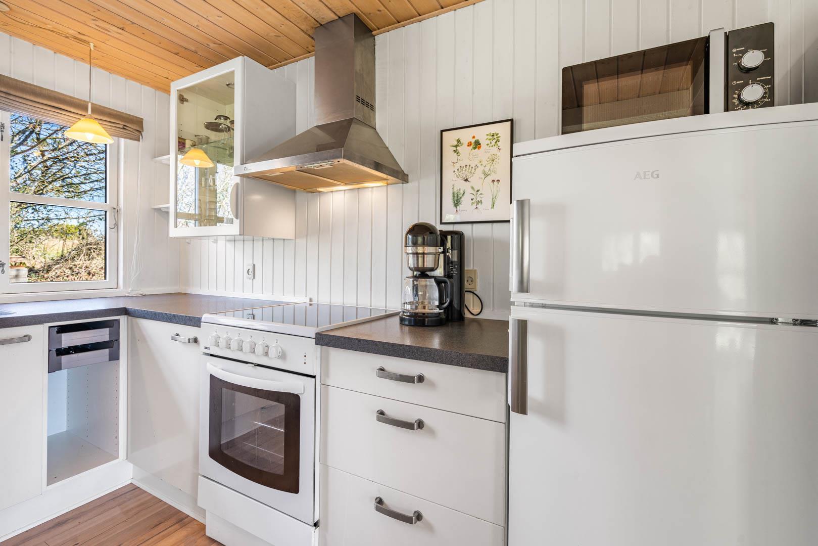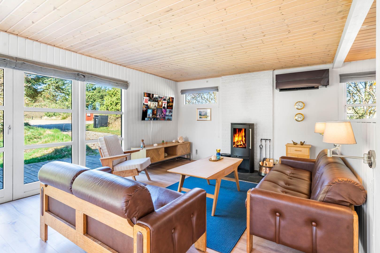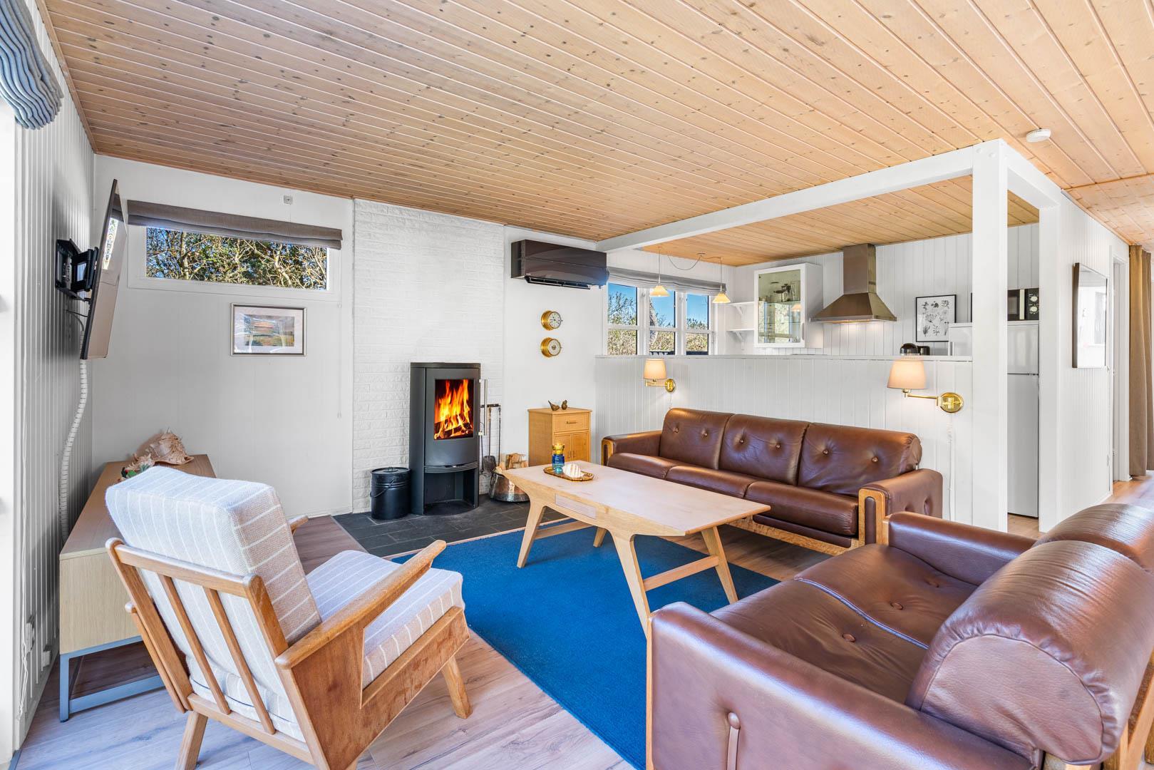 Auf einem herrlichen, hügeligen Naturgrundstück befindet sich dieses schöne Ferienhaus, das vor Charme nur so sprüht. Das Haus verfügt über eine gepflegte und gut ausgestattete Küche, die offen mit dem hellen und einladenden Wohnzimmer verbunden ist. Hier können Sie sich in den bequemen Möbeln vor dem Kamin mit Glastür entspannen, der an kühlen Tagen für eine gemütliche Atmosphäre sorgt.