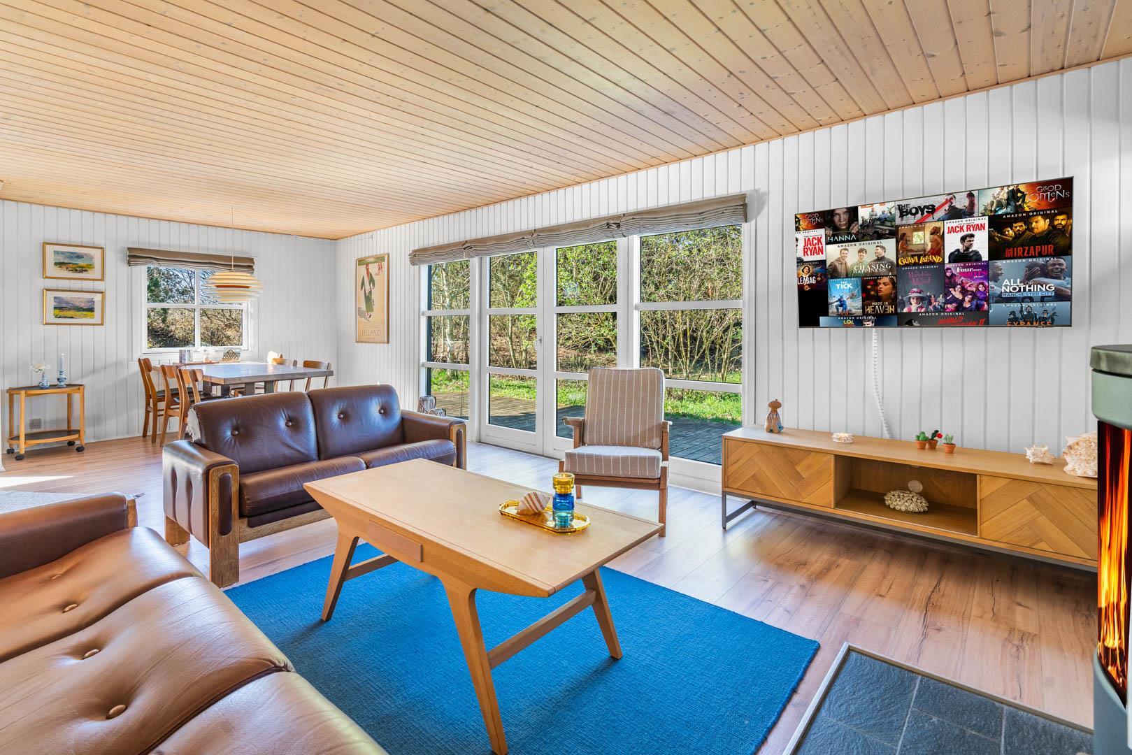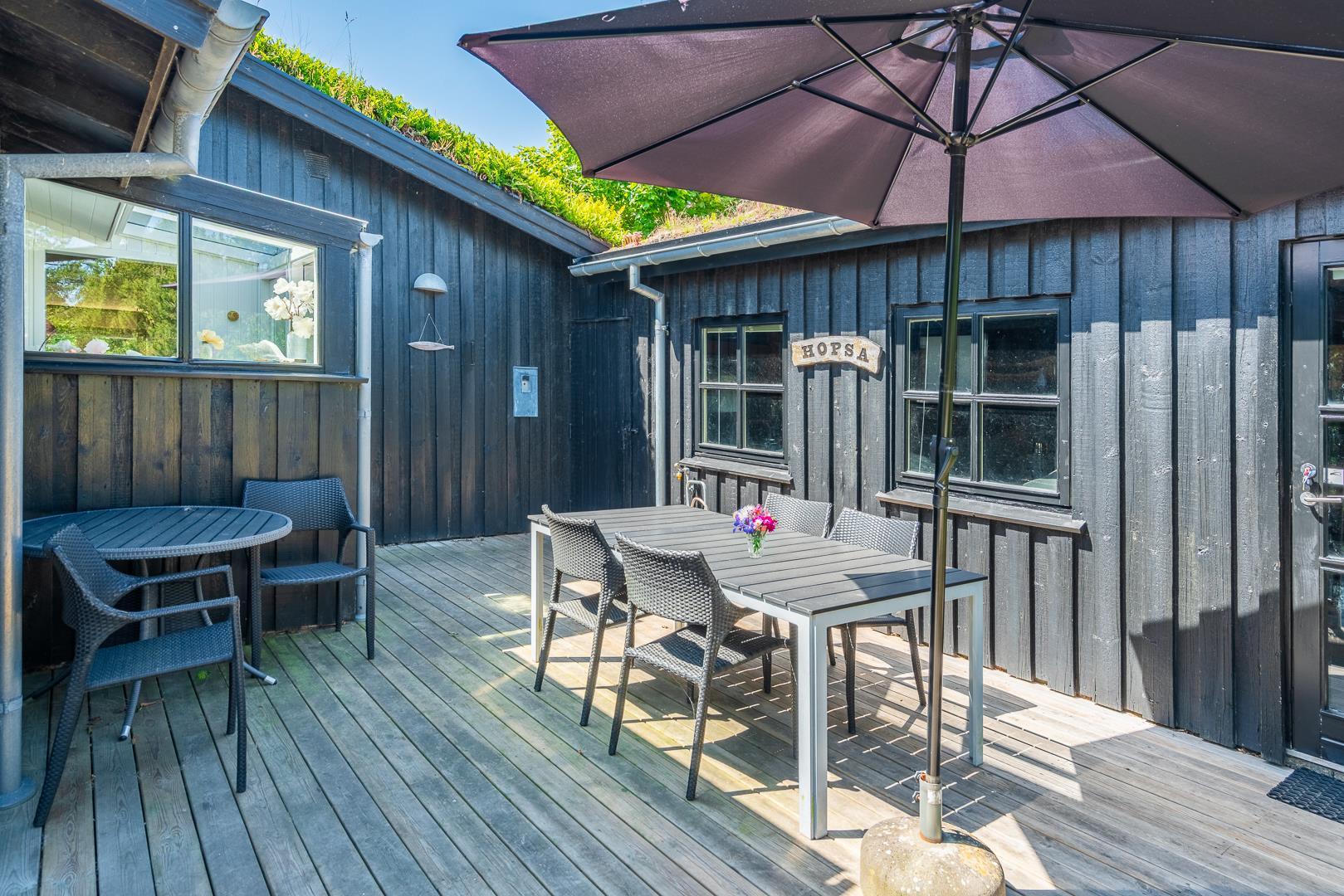 Vom Wohnzimmer aus gelangen Sie direkt auf eine große Holzterrasse, die das Haus auf drei Seiten umgibt. So können Sie die Sonne von morgens bis abends genießen. Hinter dem Haus befindet sich eine völlig uneinsehbare und windgeschützte Terrasse – perfekt für entspannte Stunden in Ruhe.