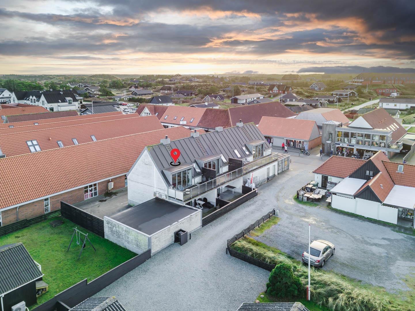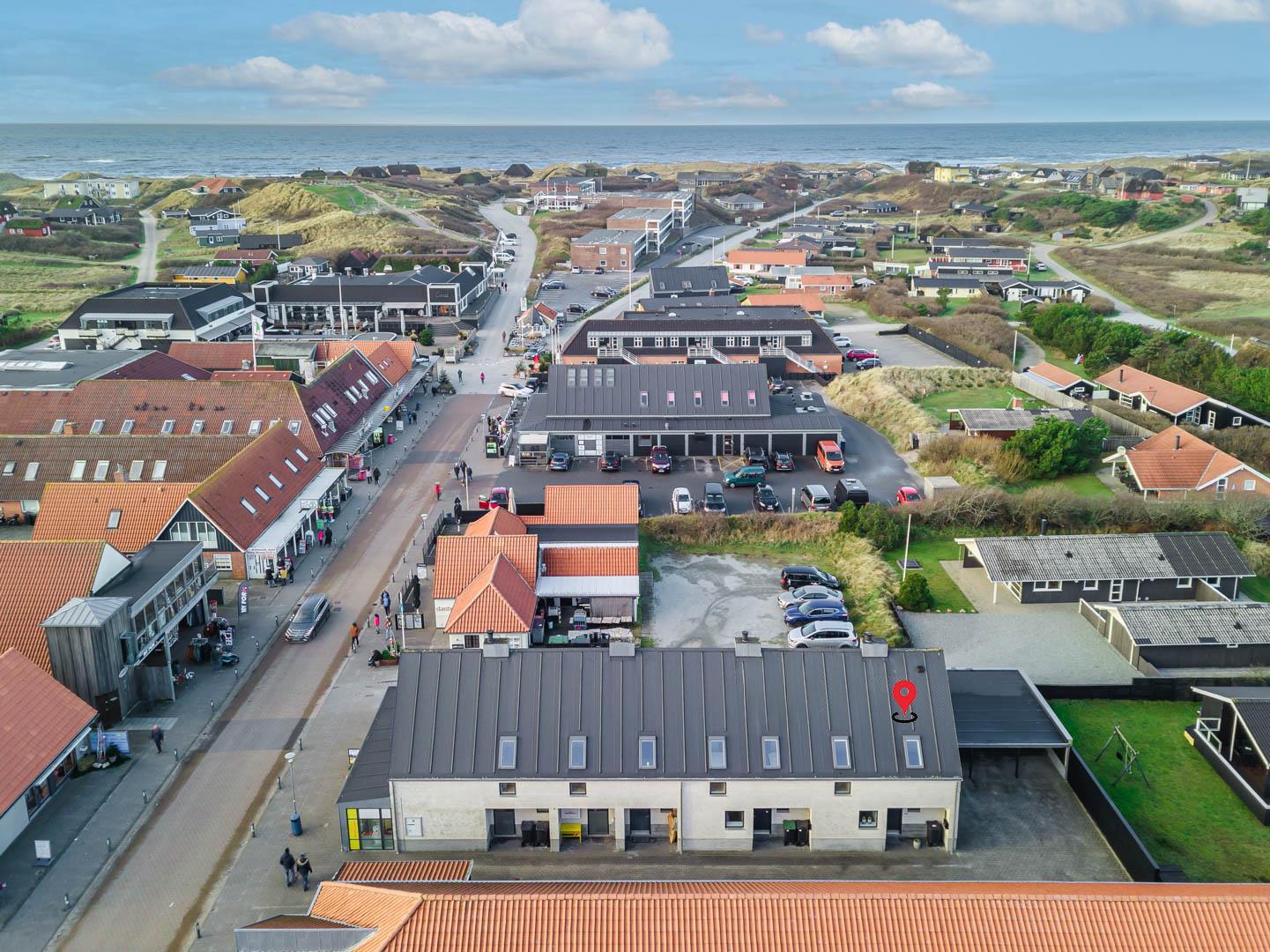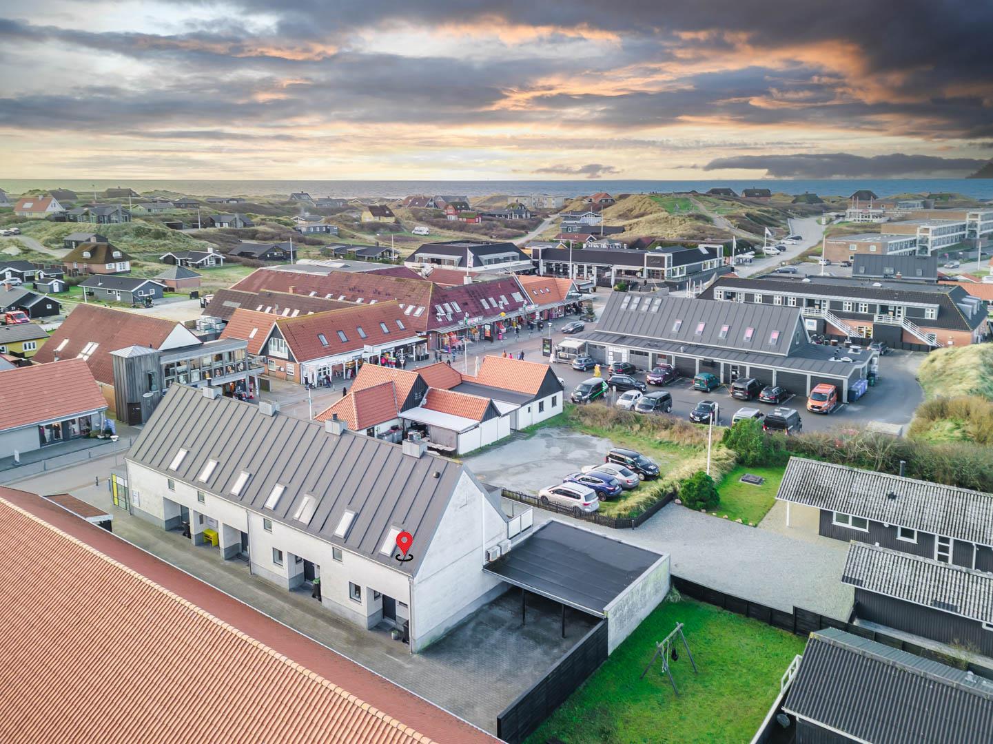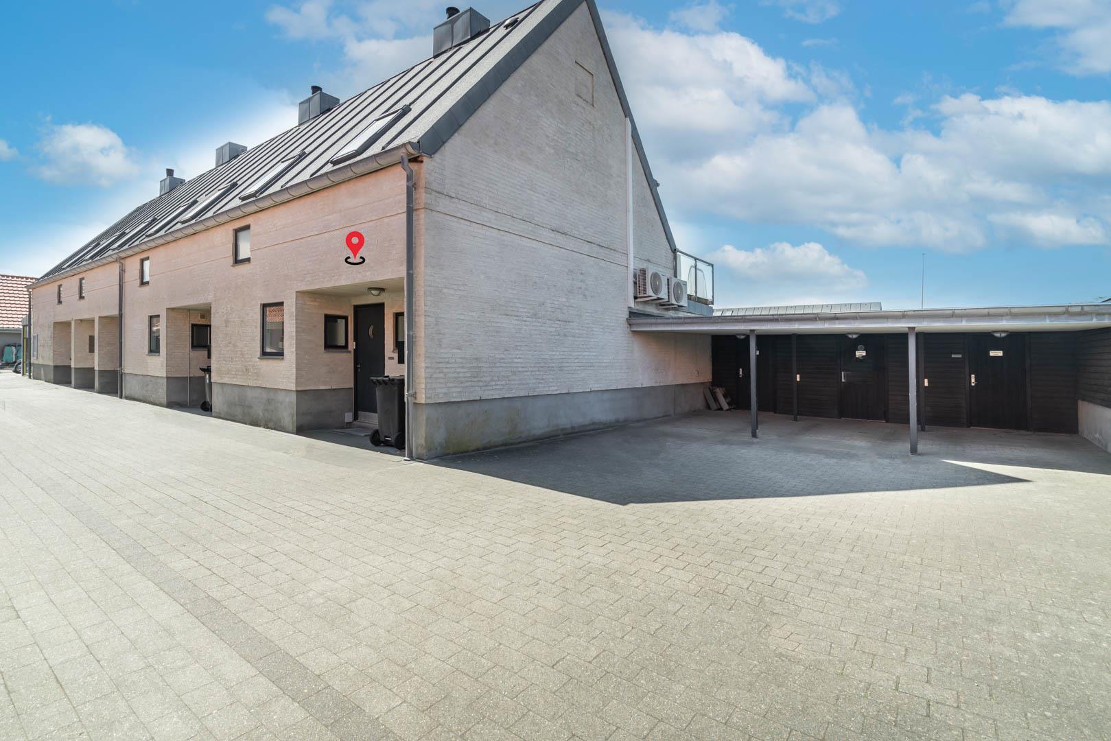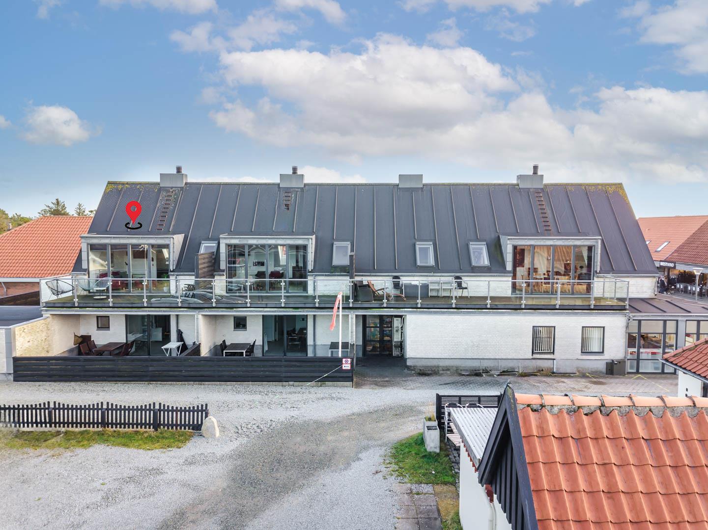 Die mit hoher Qualität gebaute Wohnung befindet sich im Herzen von Henne Strand. Die Wohnung ist überall hell und freundlich und auf einem hohen Qualitätsniveau. Die Wohnung besteht aus 2 Ebenen. In der ersten Ebene ist der Eingang, Schlafzimmer, Wohnzimmer, Bad und eine geschützte Terrasse gegen Westen gerichtet. In der zweiten Ebene befinden sich 2 Schlafzimmer, Wohnzimmer und Balkon. In allen Zimmern sind Flachbildschirme vorhanden. Mit Warmepumpe. Abstellraum für Fahrräder beim Carport.