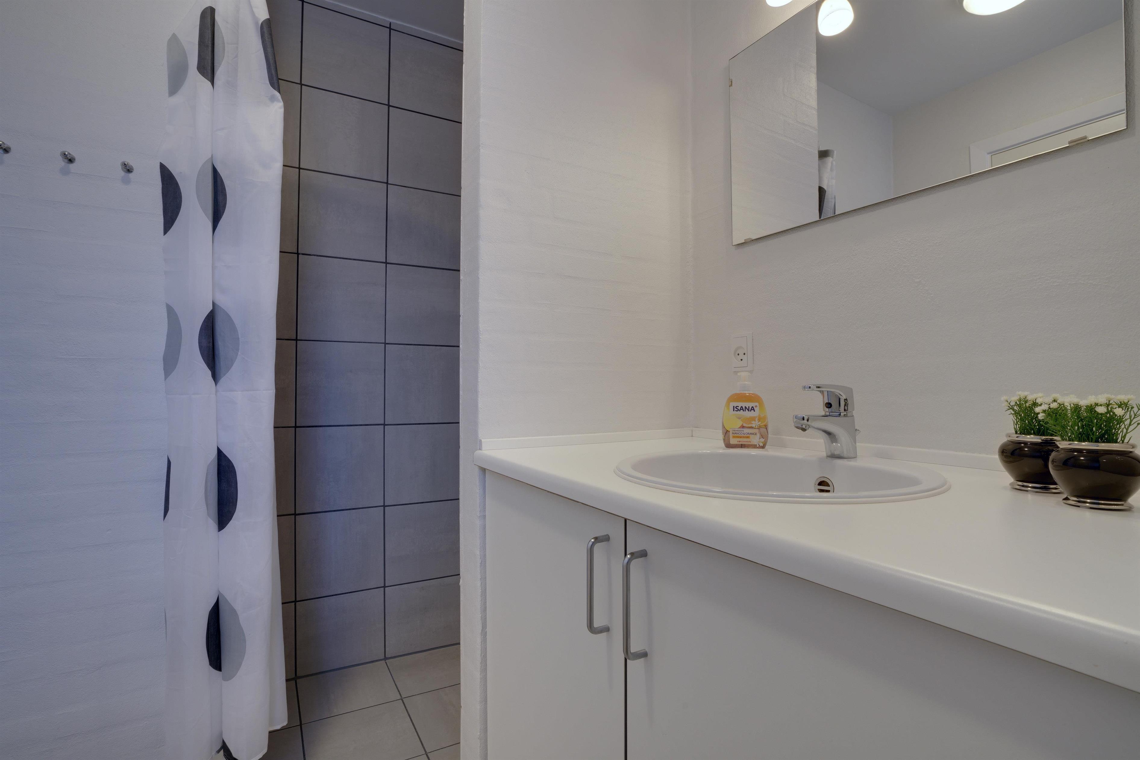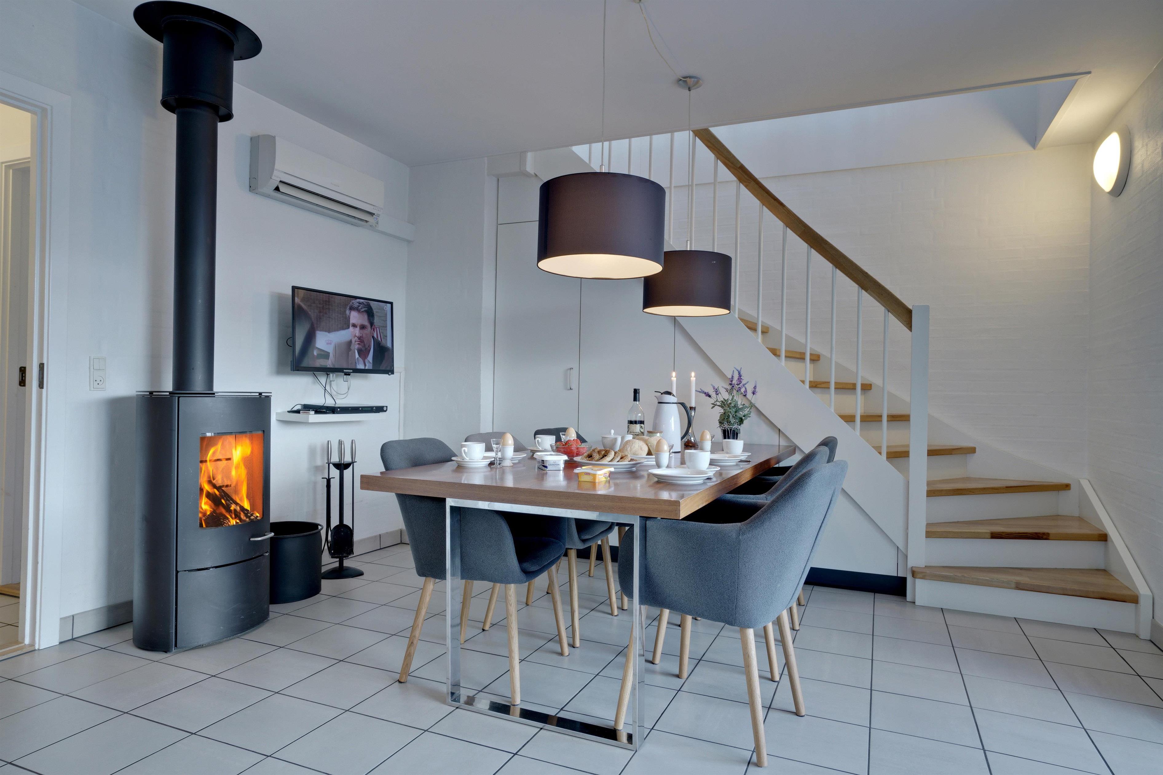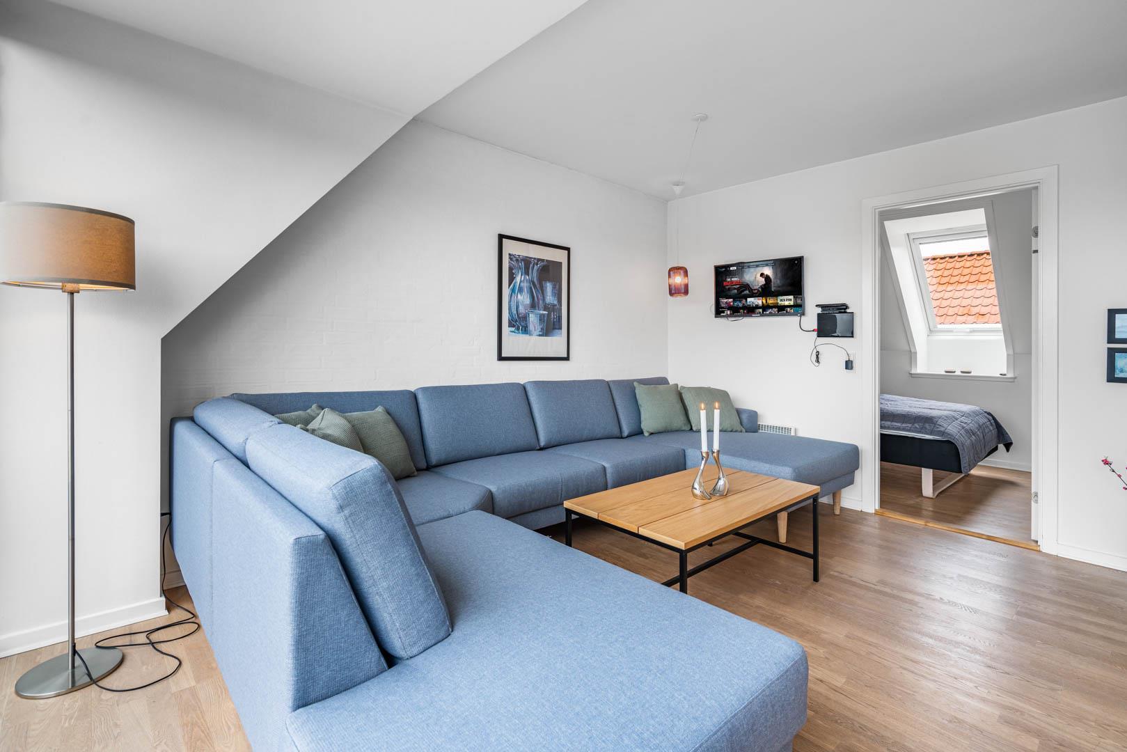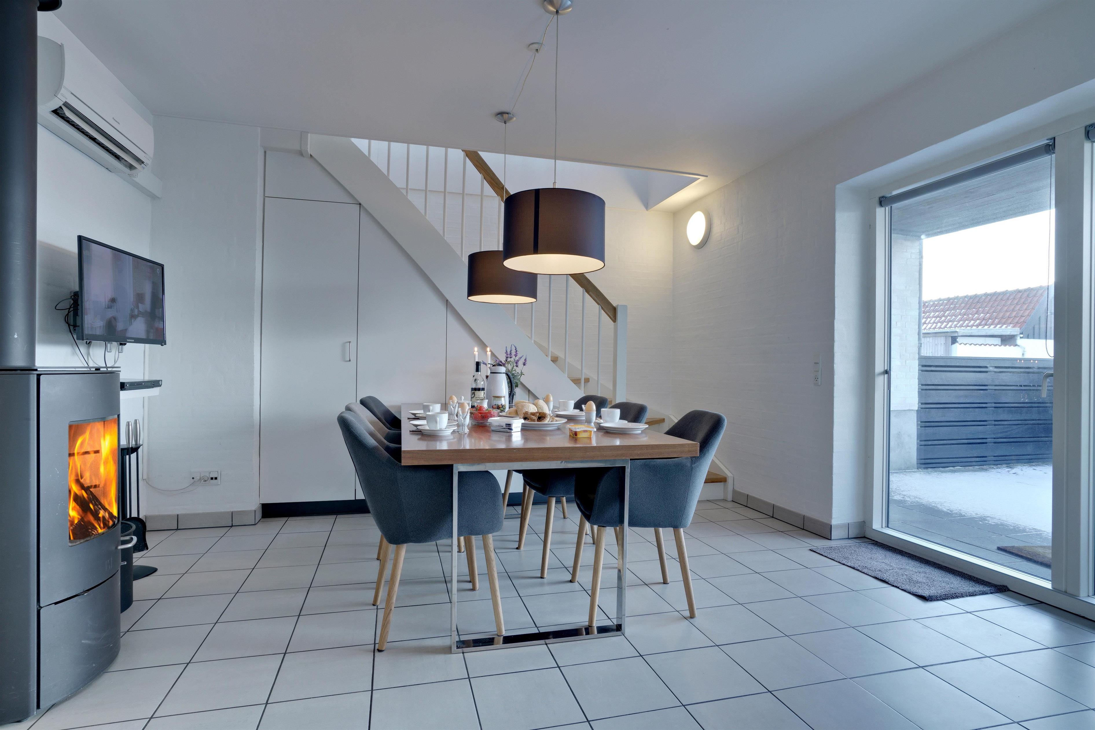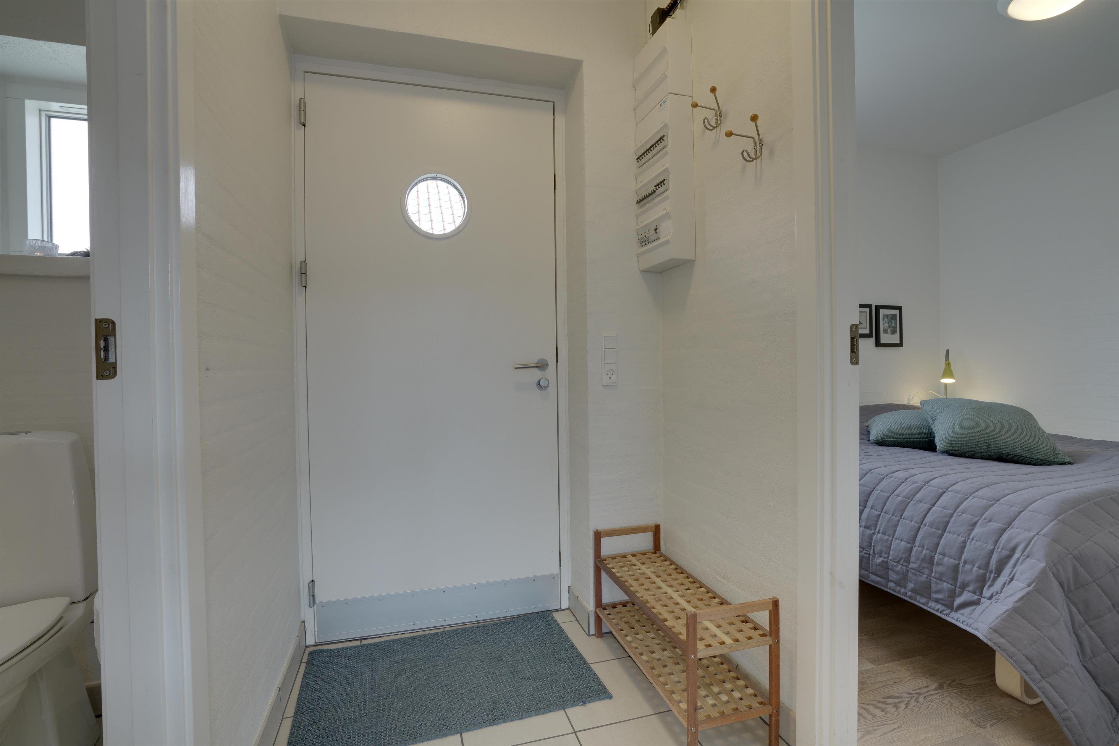 Die mit hoher Qualität gebaute Wohnung befindet sich im Herzen von Henne Strand. Die Wohnung ist überall hell und freundlich und auf einem hohen Qualitätsniveau. Die Wohnung besteht aus 2 Ebenen. In der ersten Ebene ist der Eingang, Schlafzimmer, Wohnzimmer, Bad und eine geschützte Terrasse gegen Westen gerichtet. In der zweiten Ebene befinden sich 2 Schlafzimmer, Wohnzimmer und Balkon. In allen Zimmern sind Flachbildschirme vorhanden. Mit Warmepumpe. Abstellraum für Fahrräder beim Carport.